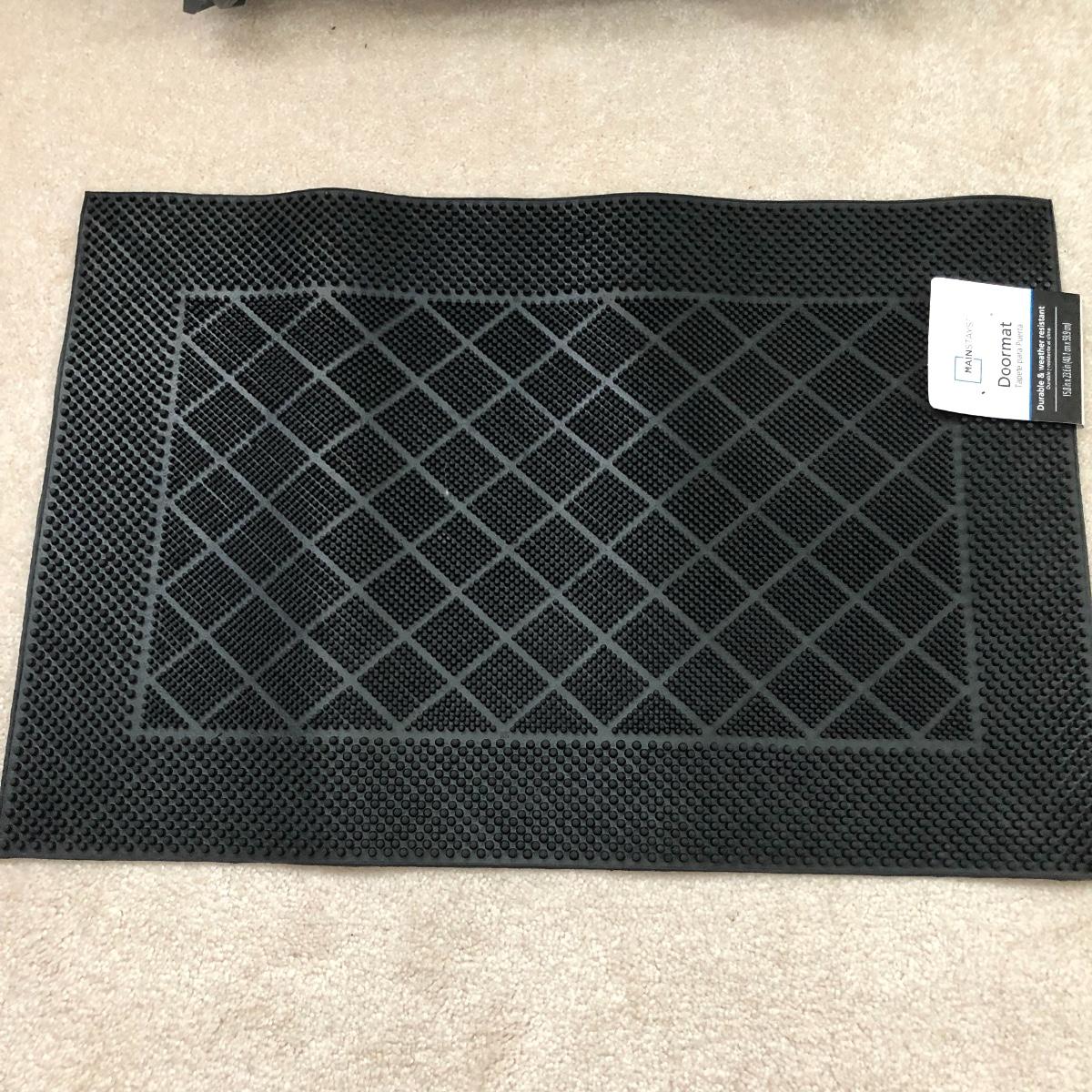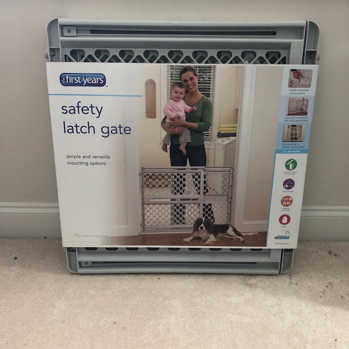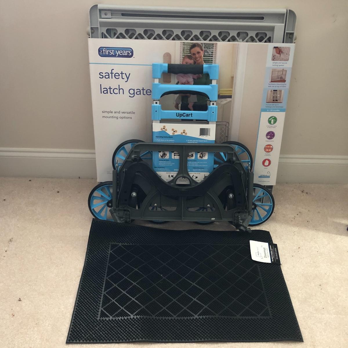 Lot includes plastic safety latch gate and a folding all terrain stair climber cart. Also includes rubber door mat.