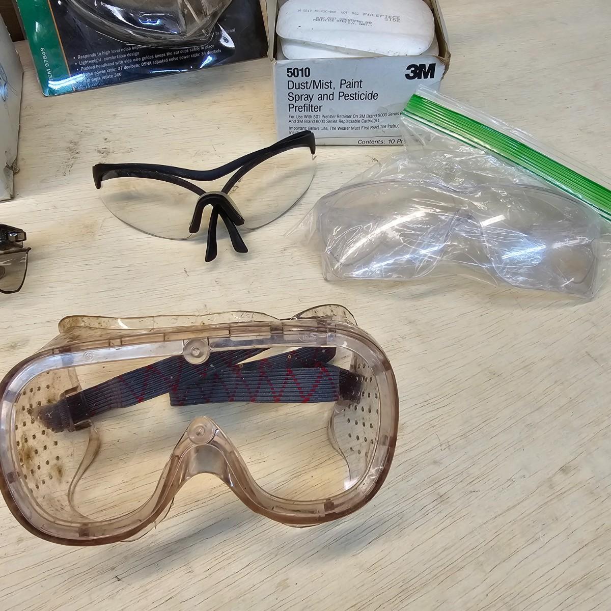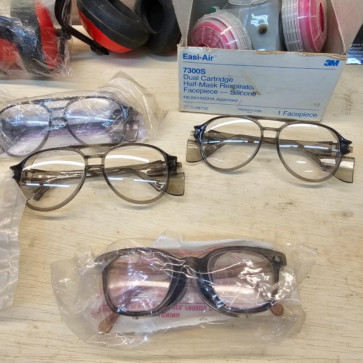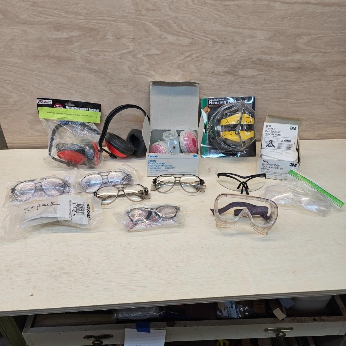 Protective goggles, hearing protection and dust masks in this group. Nine sets of goggles/glasses, three hearing muffs and a half mask respirator. Most items are used. See photos for details. Shipping available.