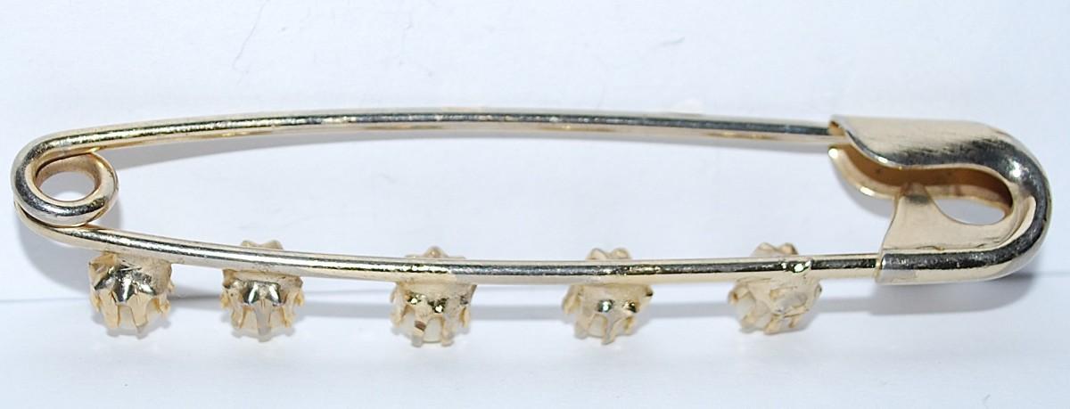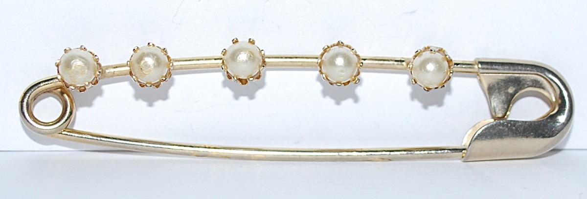 "Safety Pin" PEARL BROOCH (2" x ½") with 5 Faux Pronged Pearls on a Silver Tone Setting