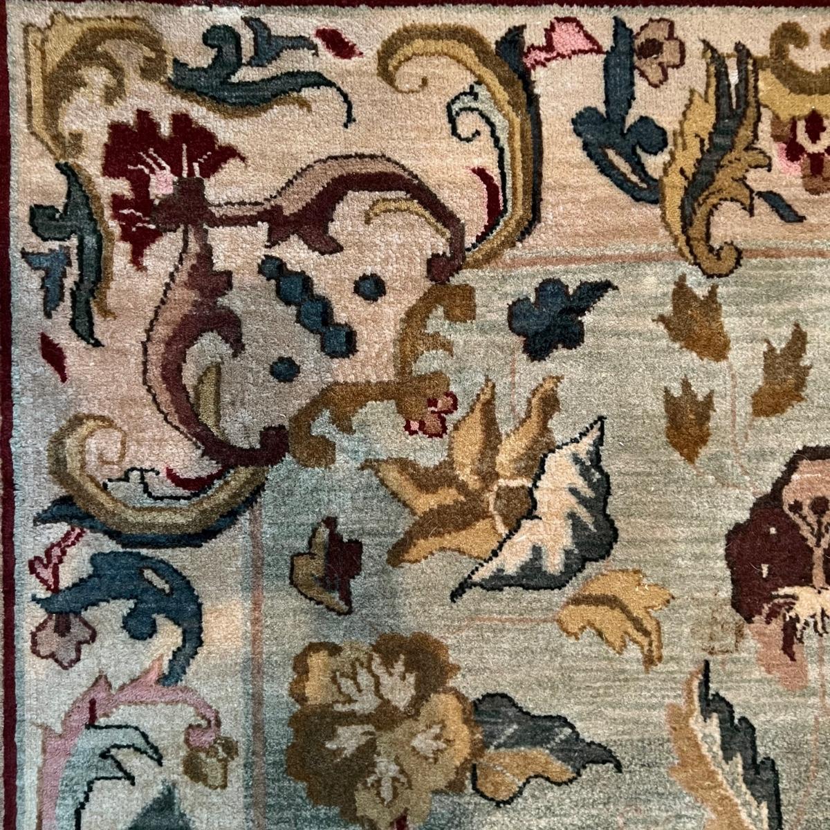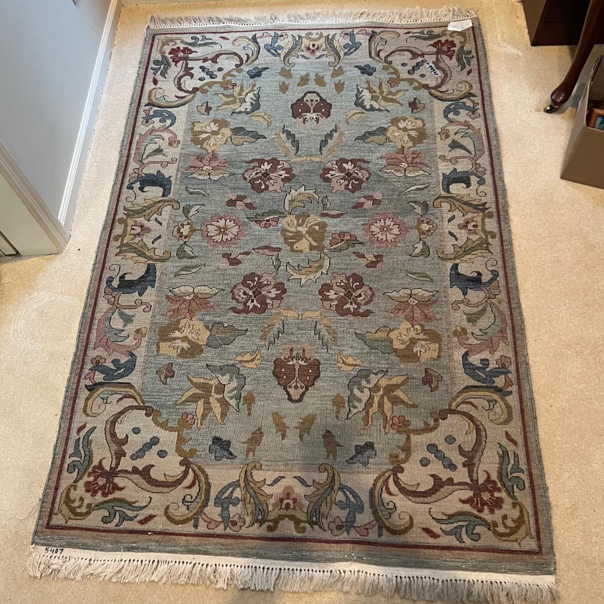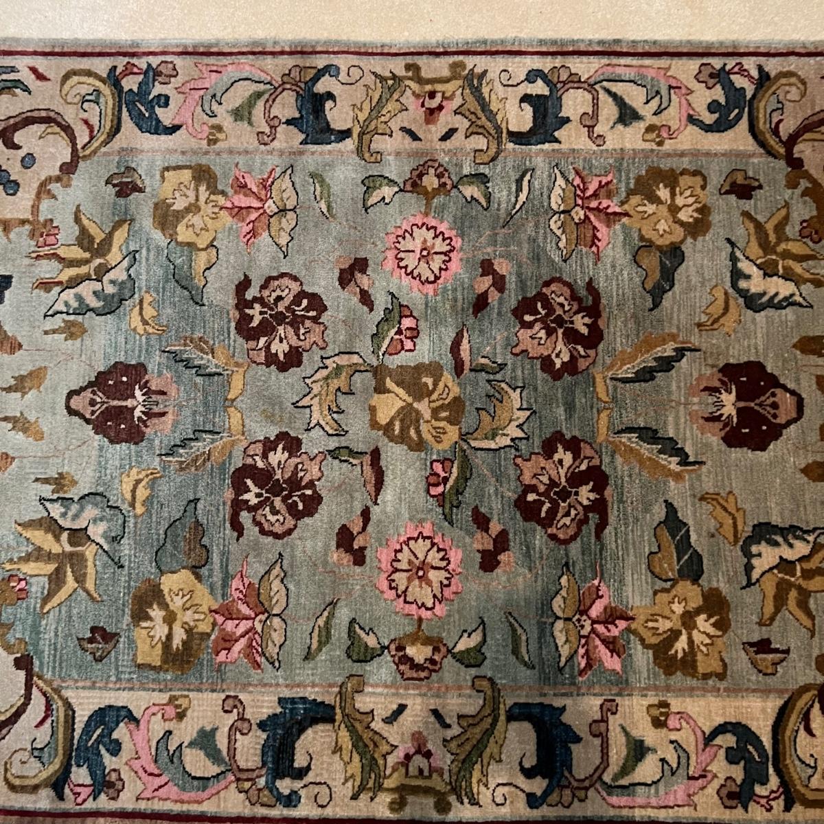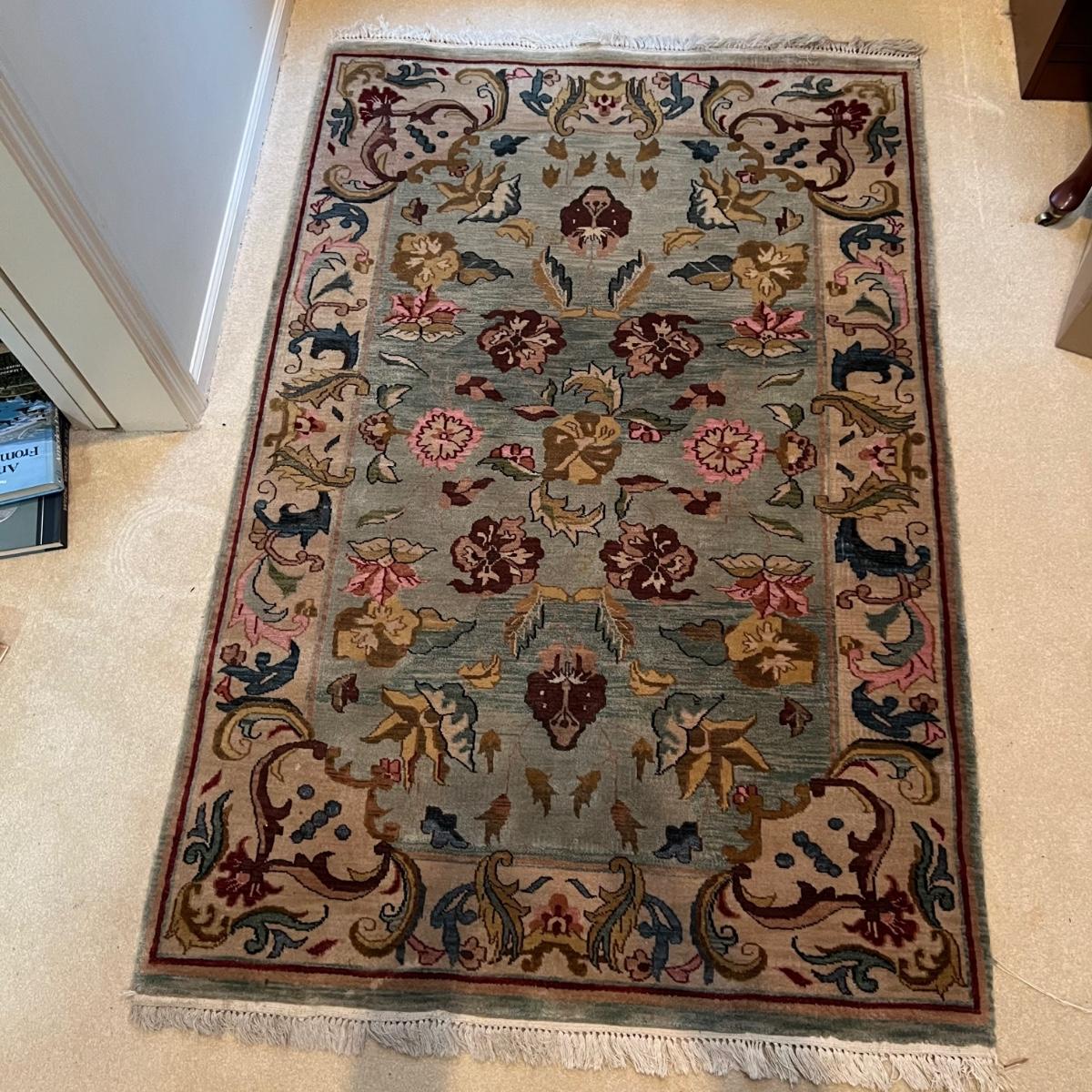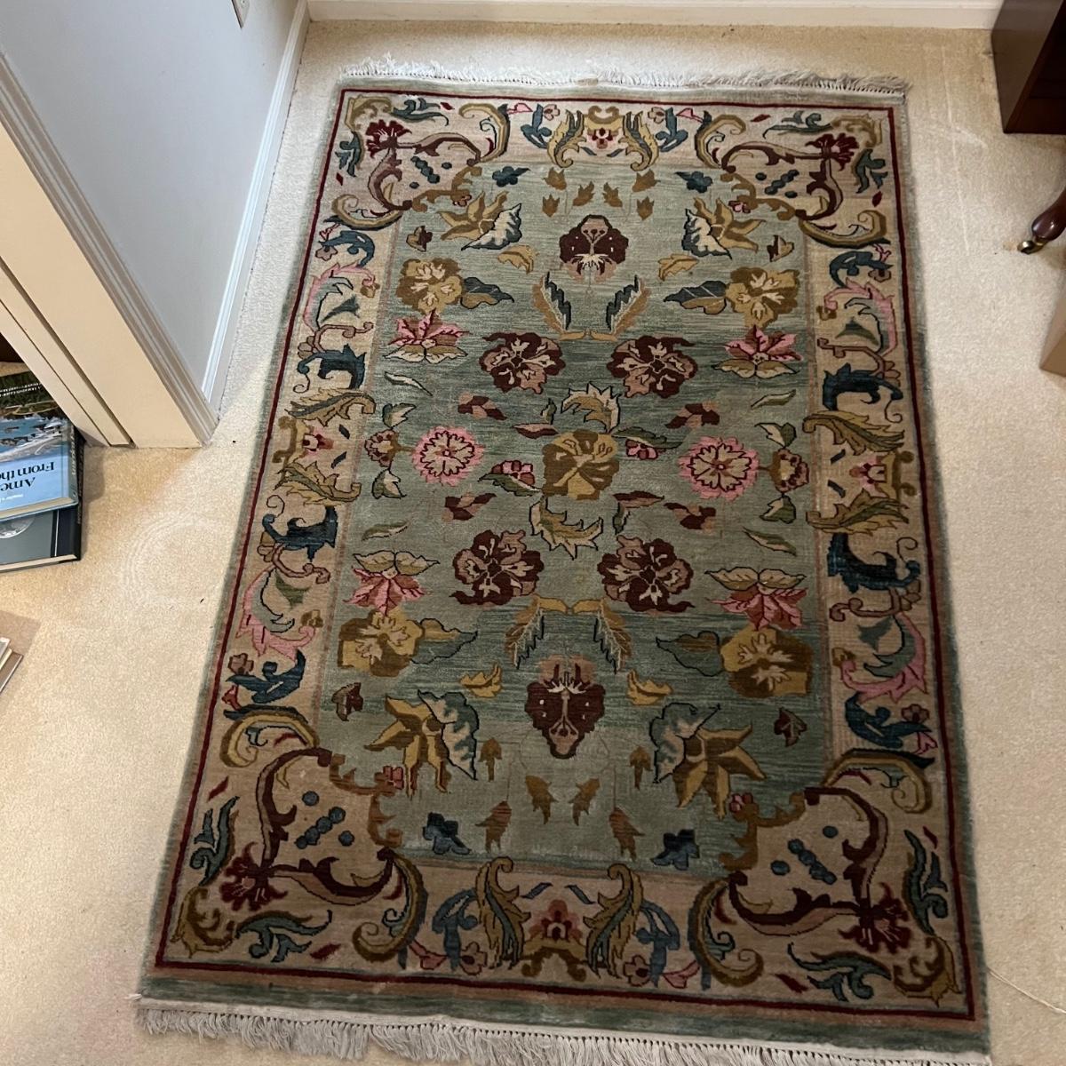 Add elegance with ease to any space with the addition of this beautiful Savonnerie style floral area rug. Gentle green, beige, gold and red tones, feathered leaves and soft blossoms these elements come together to deliver a classic mixture of grace and style. Made in India and measures 73” x 47.5”. Wool. Could use cleaning but otherwise I’m very good condition. Local pick up only.