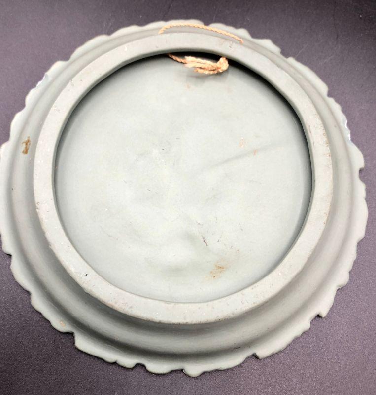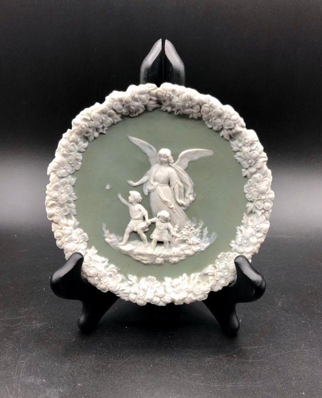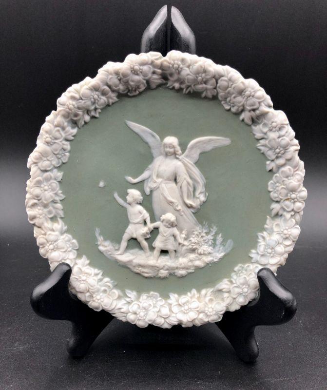 Beautiful Jasperware style collectors plate. Sage green and white. Image of an Angel with Children on the front. Looks like jasperware but there is no makers mark or stamp. Good previously owned condition.