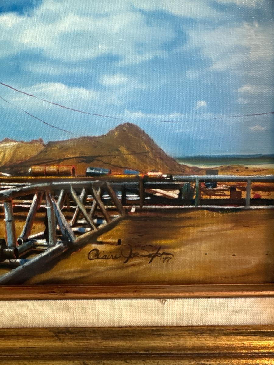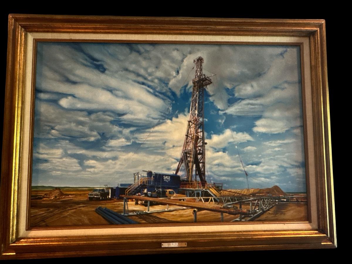 Signed and dated by the artist in the lower right corner, this piece combines industrial subject matter with a classic painterly style, making it a striking item for collectors of energy industry art or Western Americana.