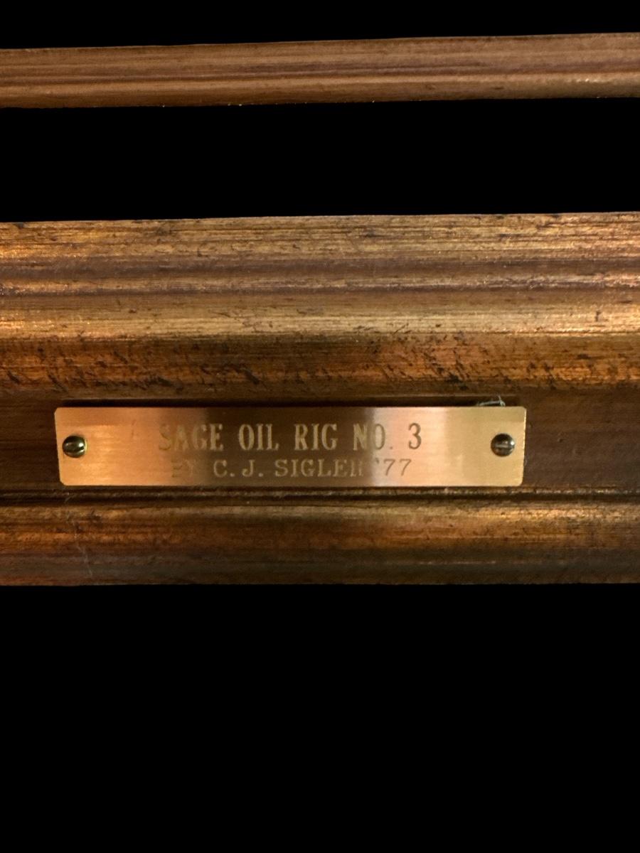 This is a 1977 oil painting titled “Sage Oil Rig No. 3” by artist C.J. Siglein. The artwork captures a dramatic view of an oil drilling rig set against a vivid, cloud-filled sky, with strong detail in the industrial structures and surrounding landscape. It is framed in a wide, gold-accented wooden frame with a brass nameplate at the bottom bearing the title and artist’s name.