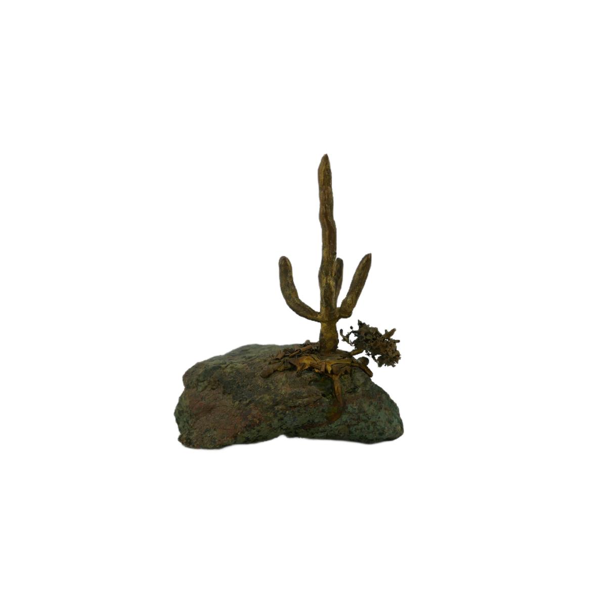 Scuplture of metal saguaro cactus and bush on rock. Beautiful southwest scene with a green with black flakes natural rock. Excellent condition. Measures L 4" x H 4.5" x W 3", weighs 10 oz. (R1)