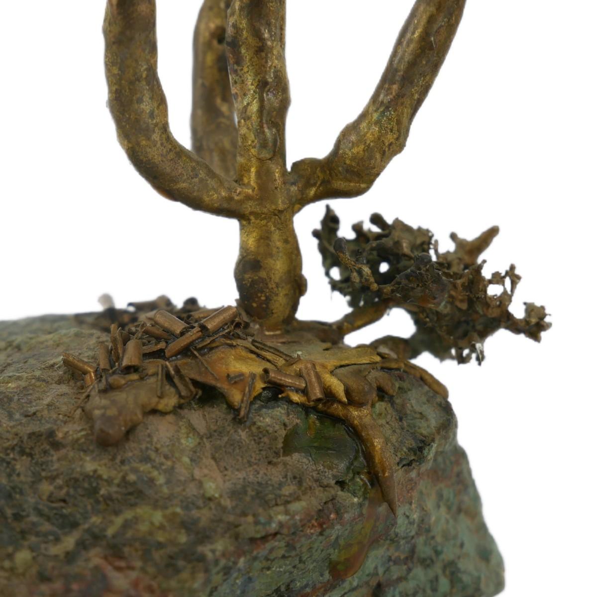 Scuplture of metal saguaro cactus and bush on rock. Beautiful southwest scene with a green with black flakes natural rock. Excellent condition. Measures L 4" x H 4.5" x W 3", weighs 10 oz. (R1)