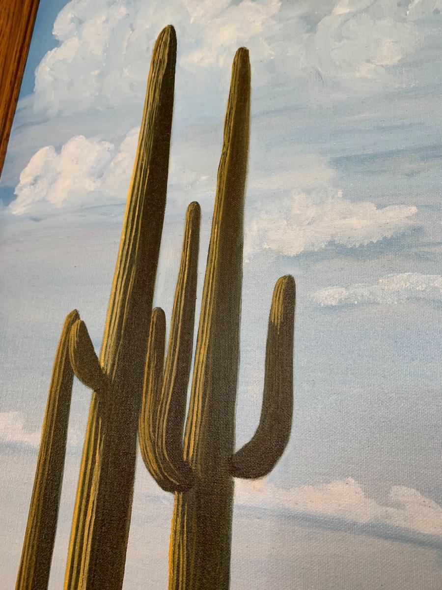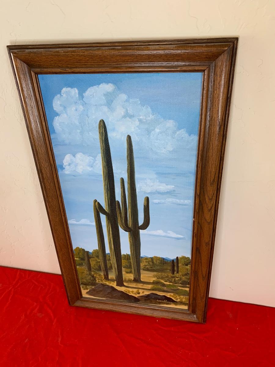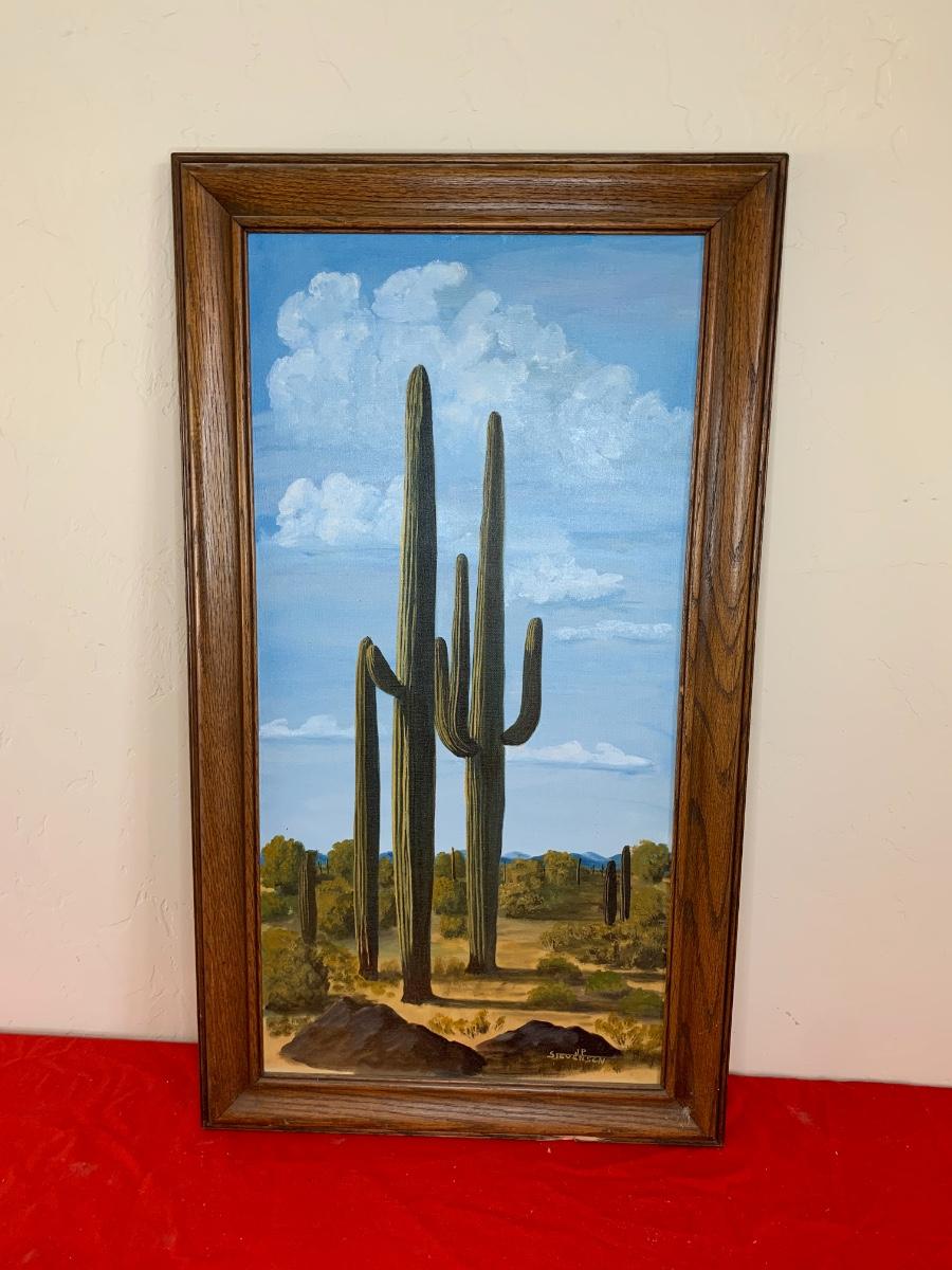 Gorgeous vintage acrylic saguaro painting by JP Stevenson in a wood frame with damage to the bottom right *pictured*