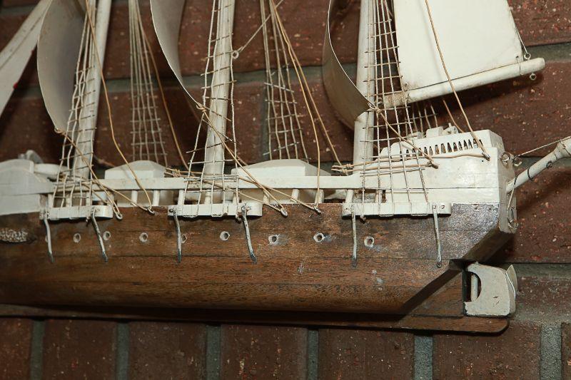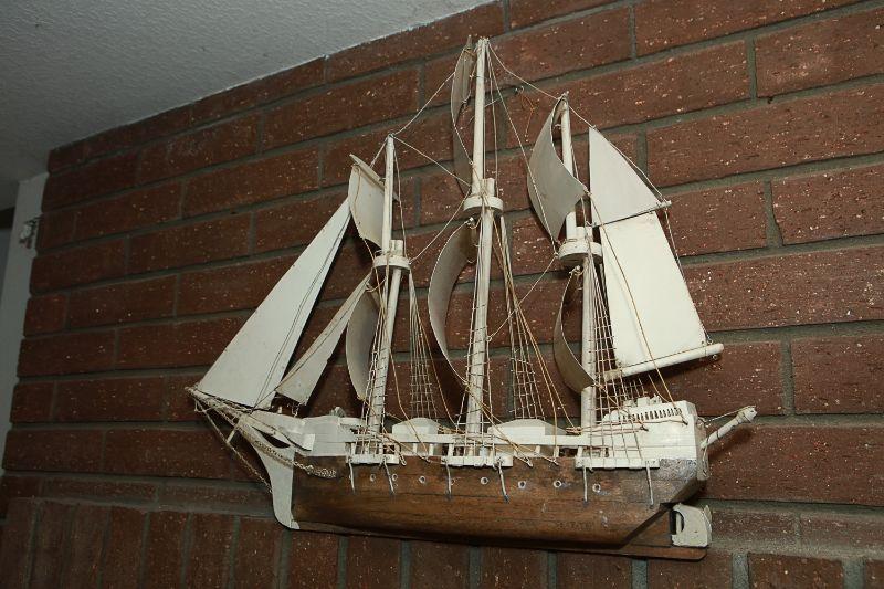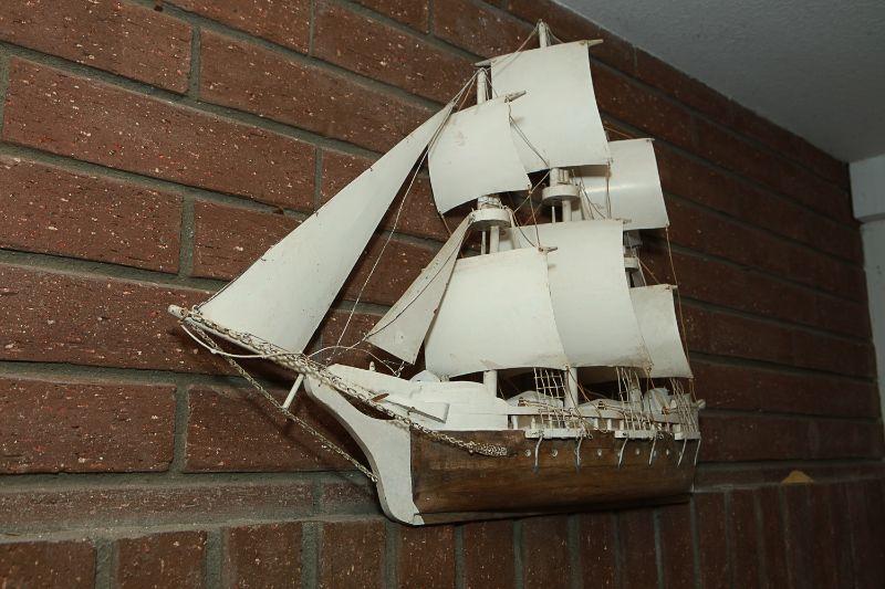 Scale model wood ship. In good condition, nicely made. Currently attached to wall as it is on a tiny ledge.