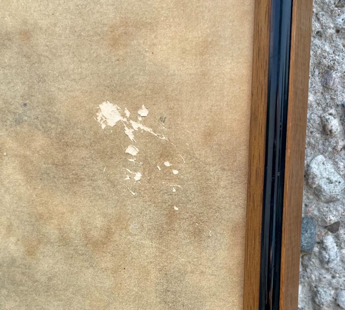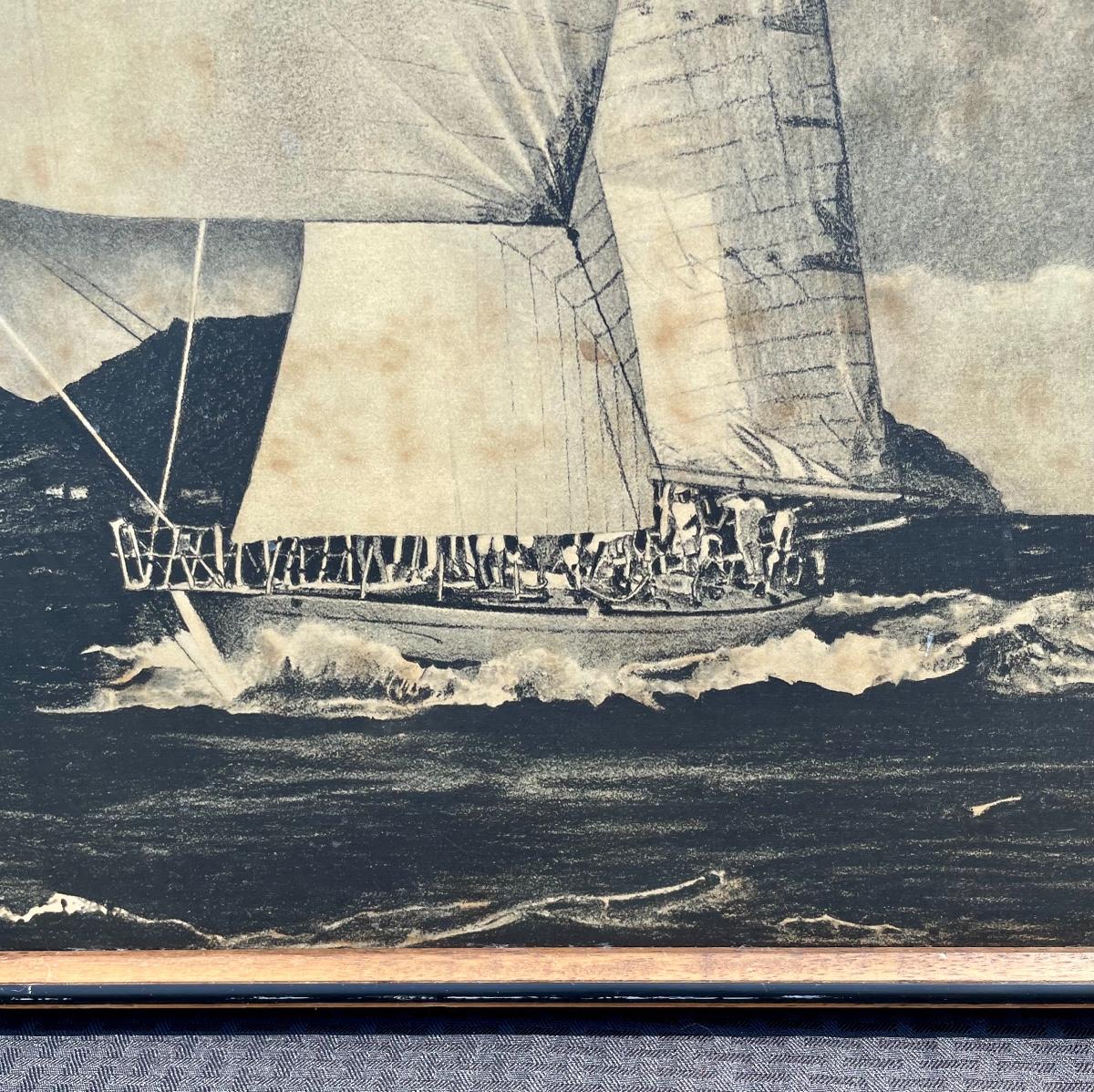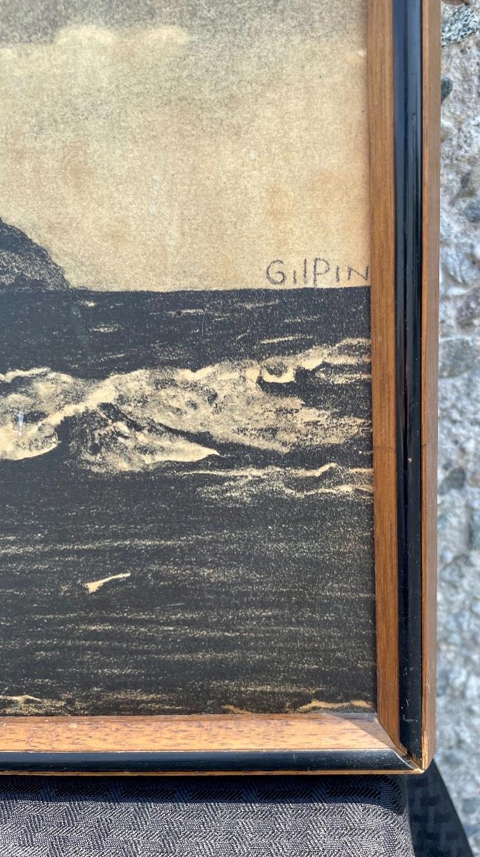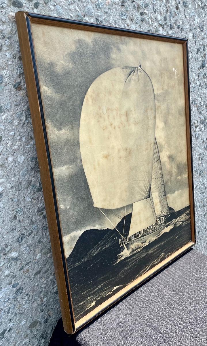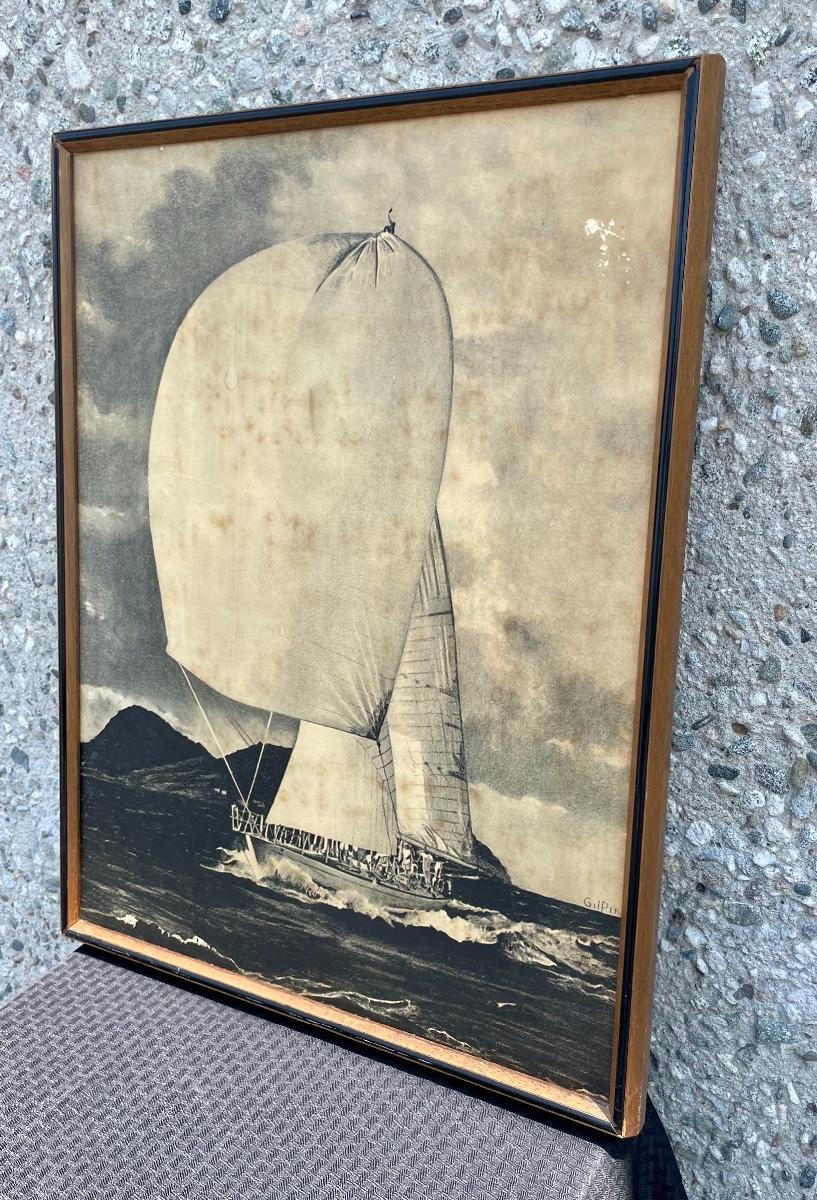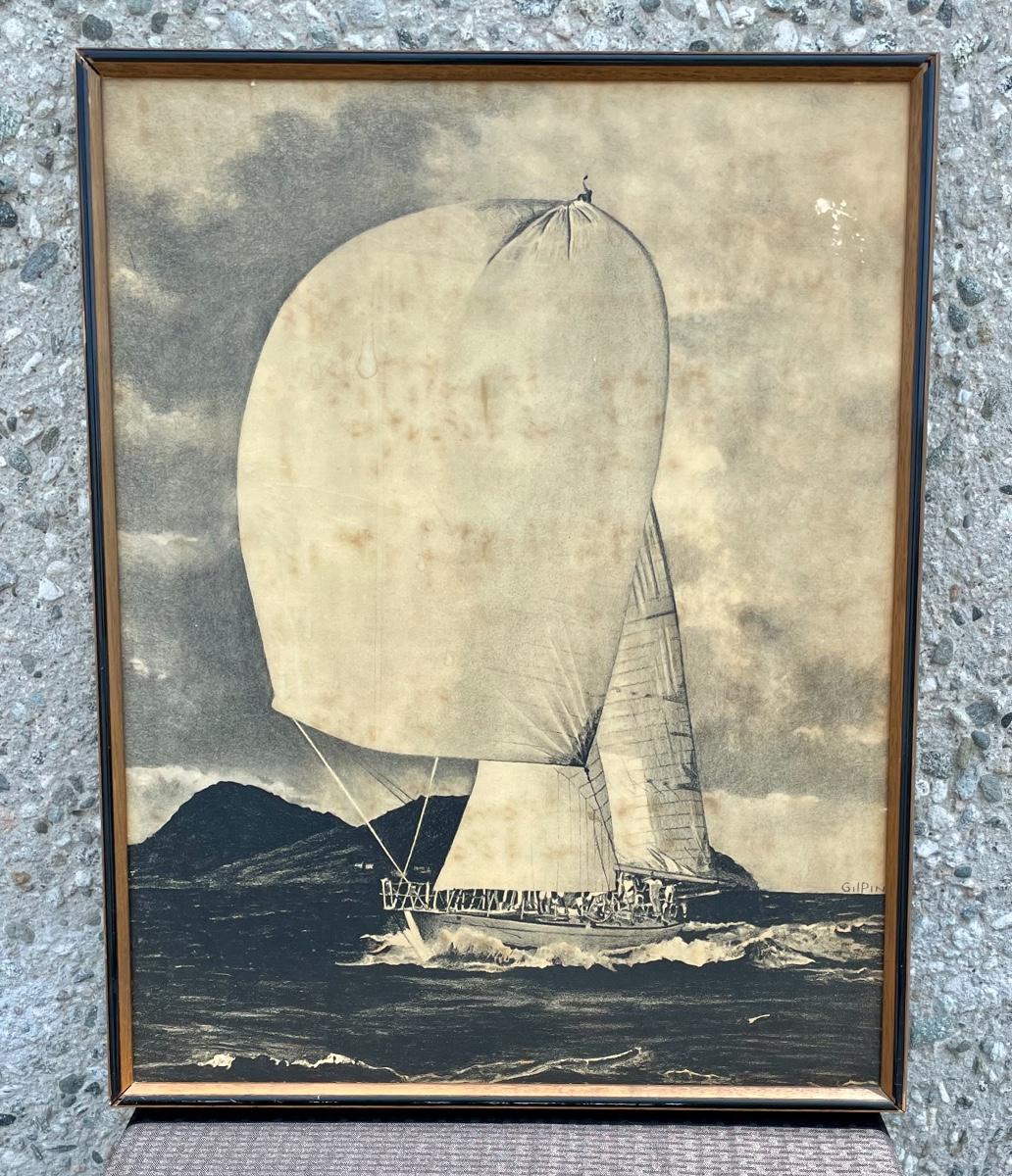 Sailboat image in black & white, looks like a photo made to look like a pen & ink sketch. Approx 24” x 29”. Artist name is GILPIN. Looks to have some discoloration, signs of age.