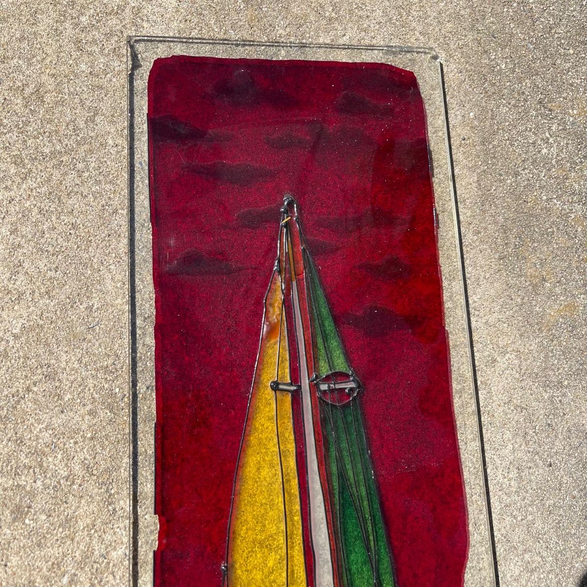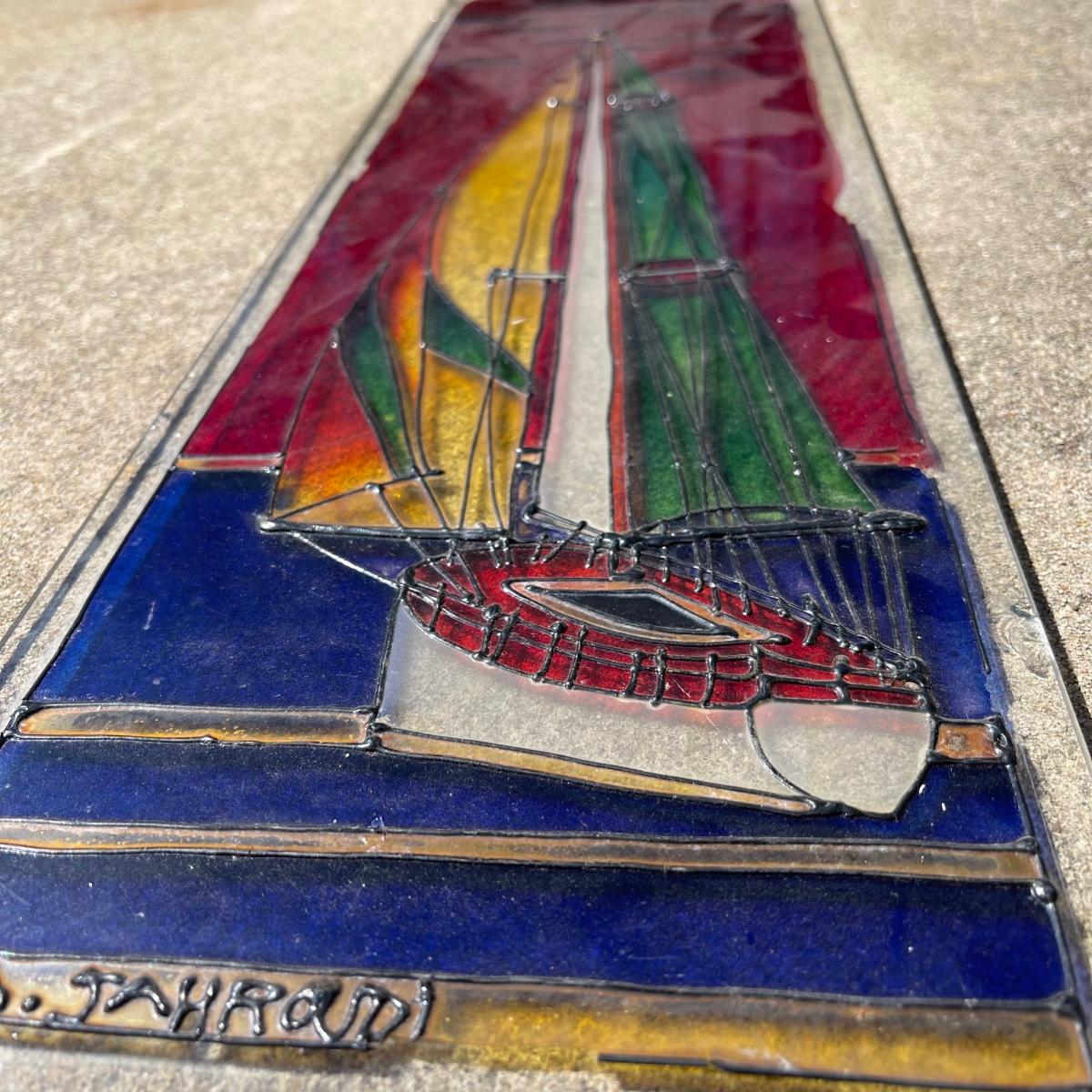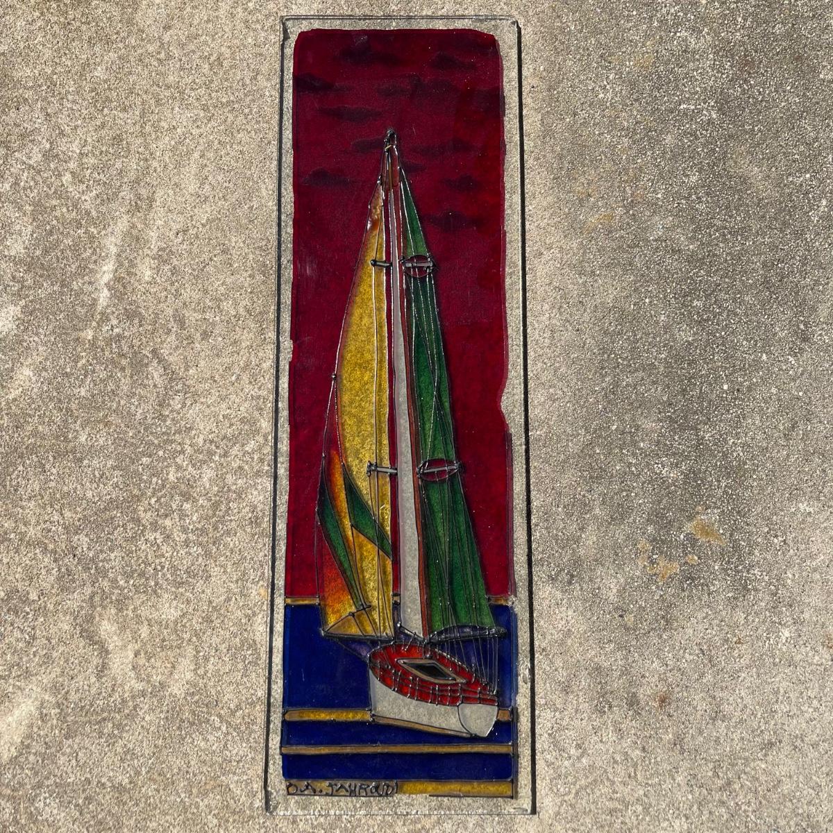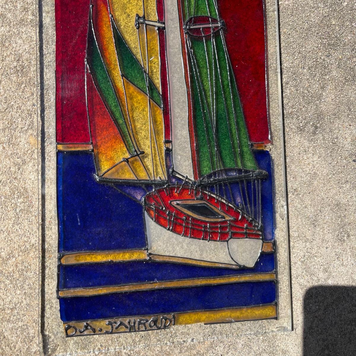 Glass artwork with imagery of a sailboat. It is not stained glass, it appears to be a layer of paint applied to the glass; it has peeled off in some areas. It measures 8.5” x 28”. The signature at the bottom of the artwork is not quite legible, it may say D.A. Jahromi, D.A. Jahrani, or something else.