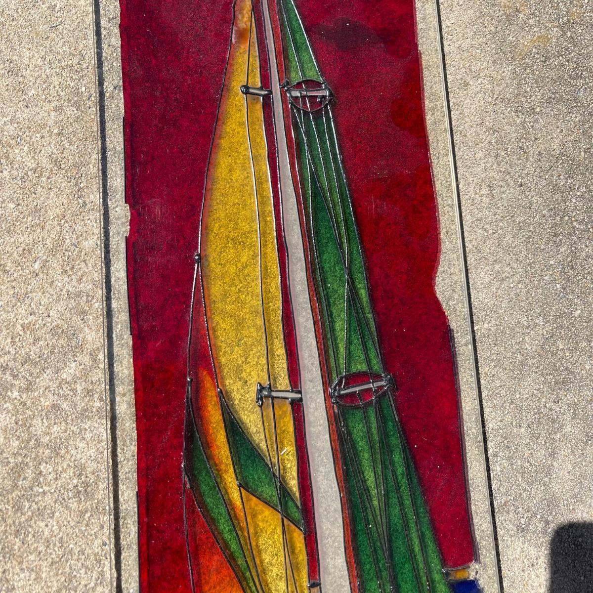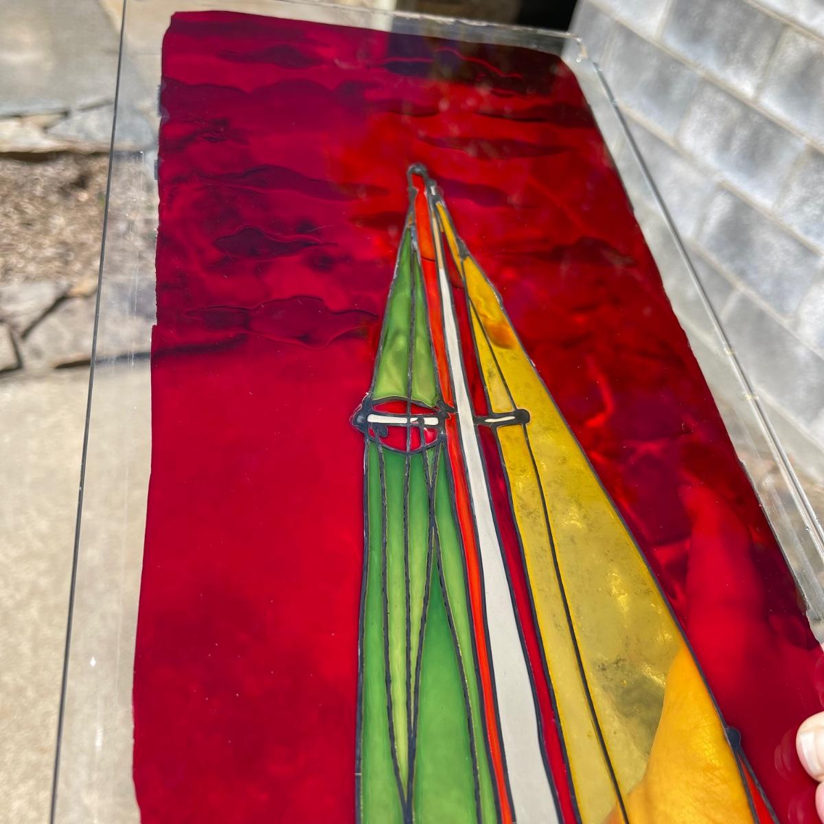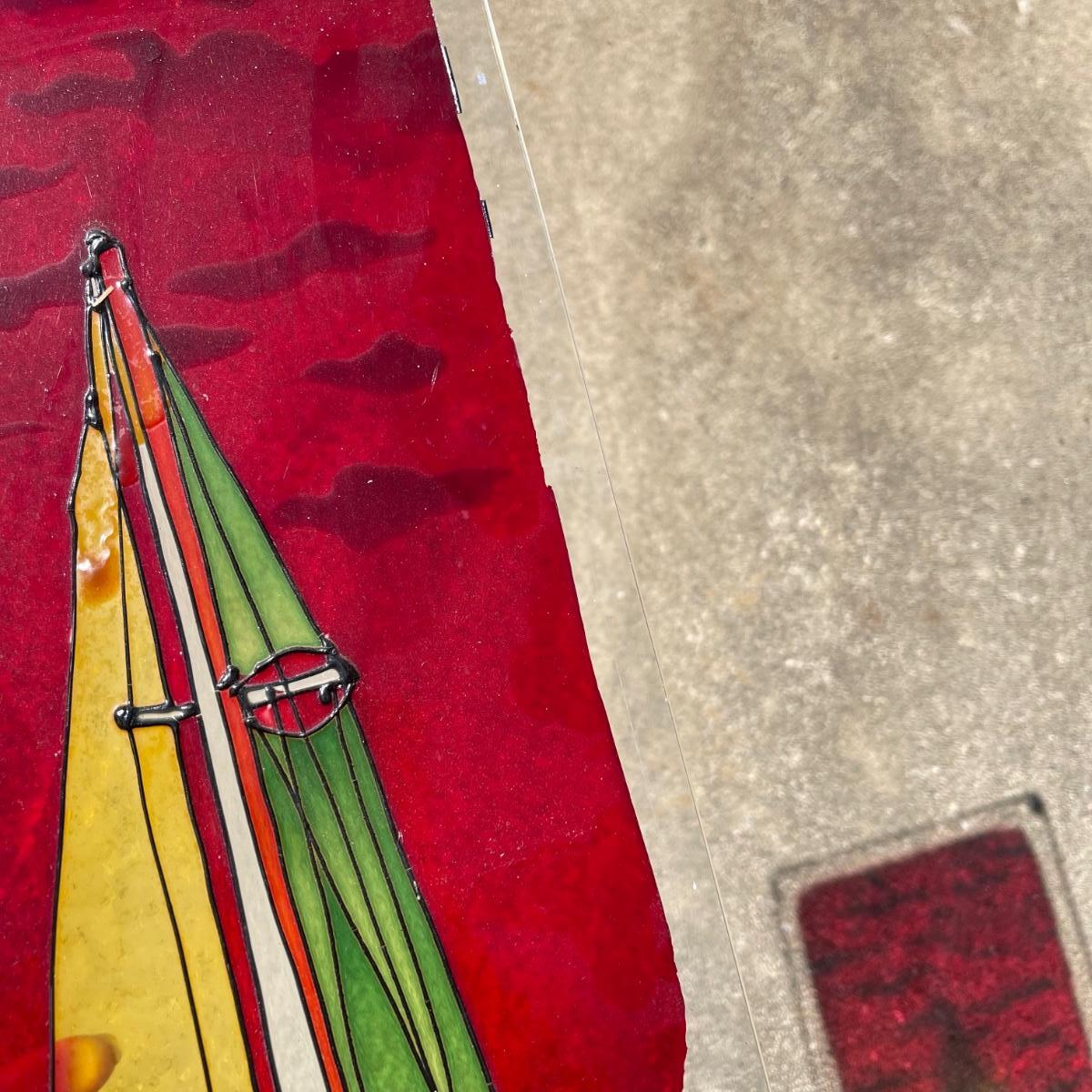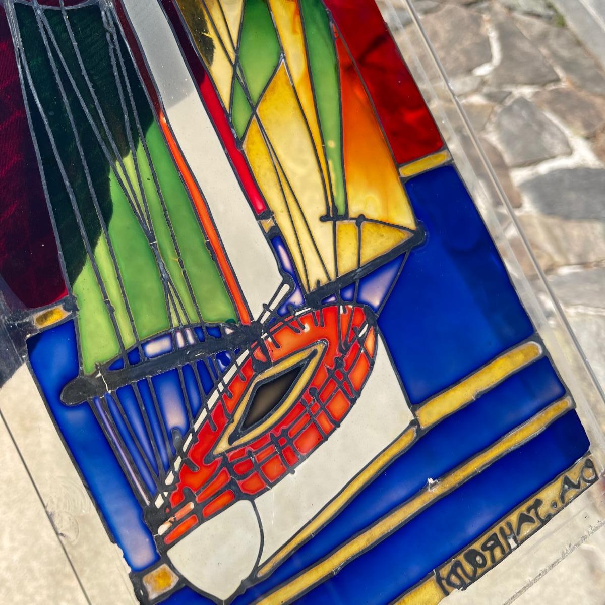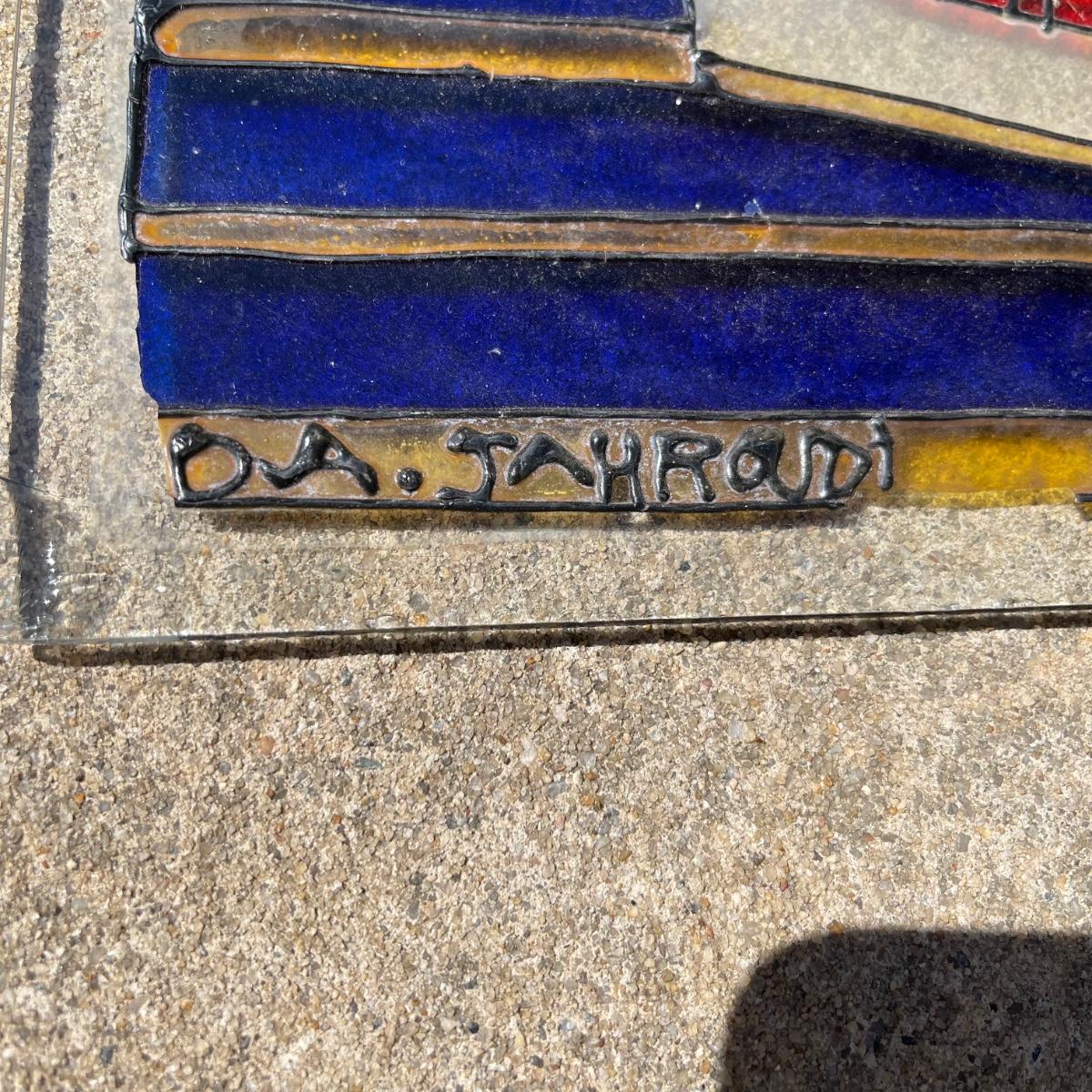 Glass artwork with imagery of a sailboat. It is not stained glass, it appears to be a layer of paint applied to the glass; it has peeled off in some areas. It measures 8.5” x 28”. The signature at the bottom of the artwork is not quite legible, it may say D.A. Jahromi, D.A. Jahrani, or something else.