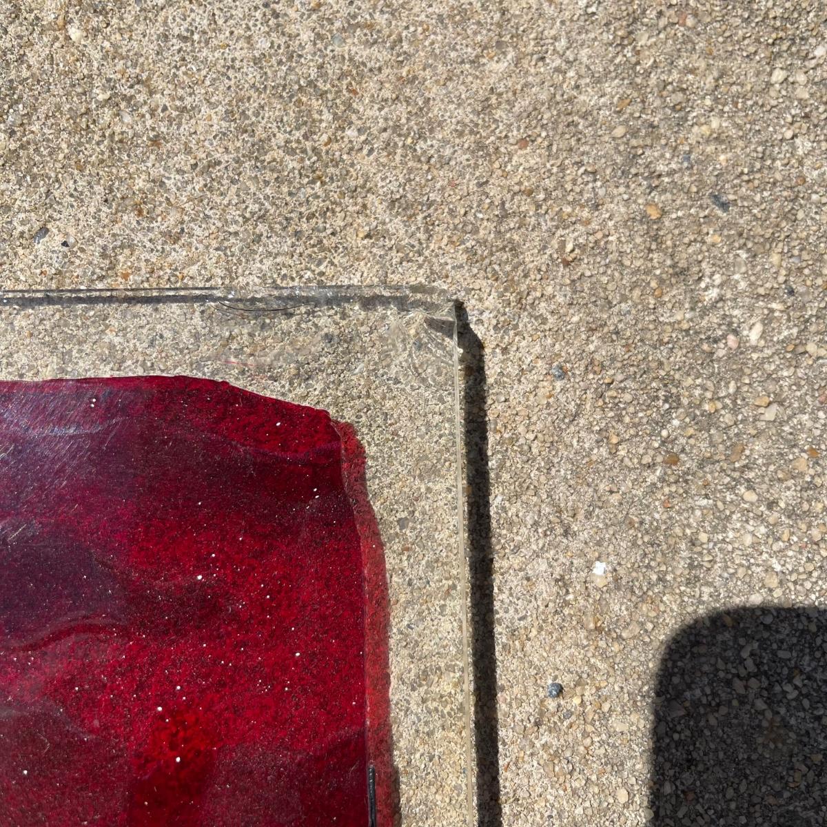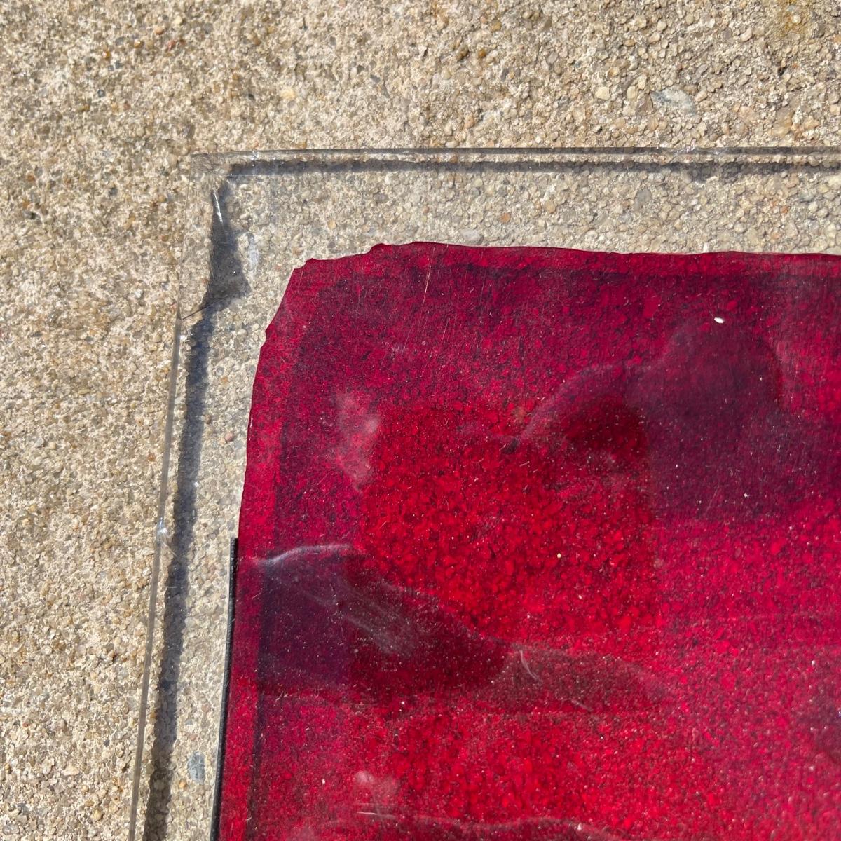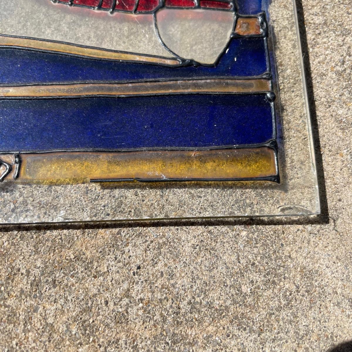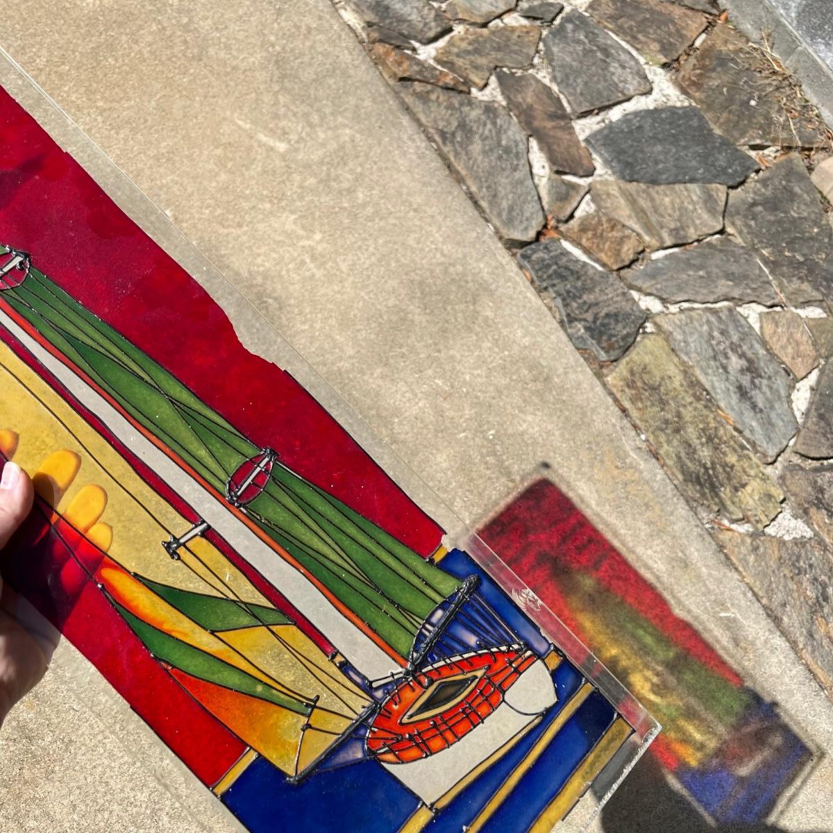 Glass artwork with imagery of a sailboat. It is not stained glass, it appears to be a layer of paint applied to the glass; it has peeled off in some areas. It measures 8.5” x 28”. The signature at the bottom of the artwork is not quite legible, it may say D.A. Jahromi, D.A. Jahrani, or something else.