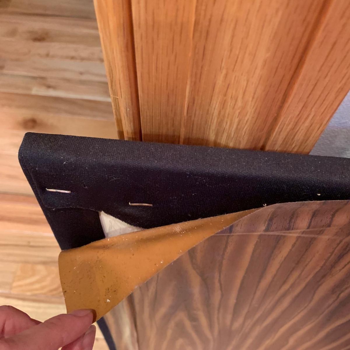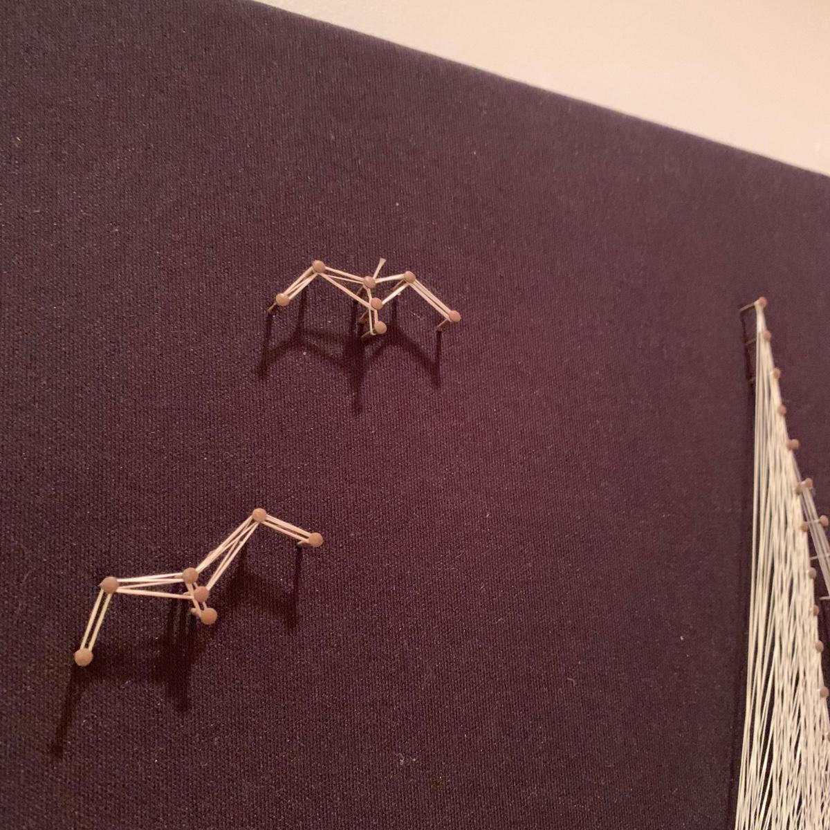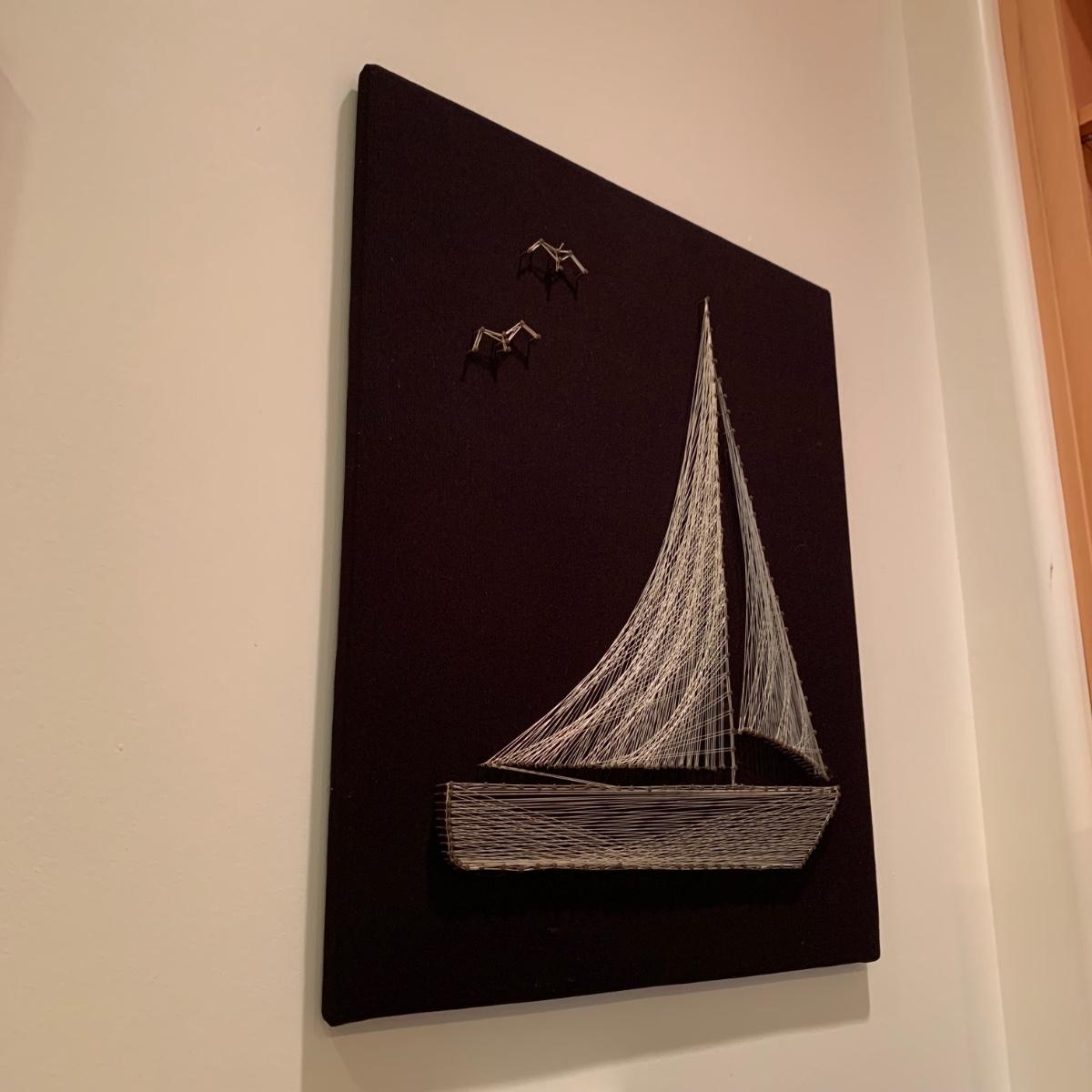 Strings pinned into a board covered in fabric make up this art depicting a sailboat and seagulls. The piece measures 18” x 21.25”. The backing paper is detaching on the corners but does not affect the integrity of the art.