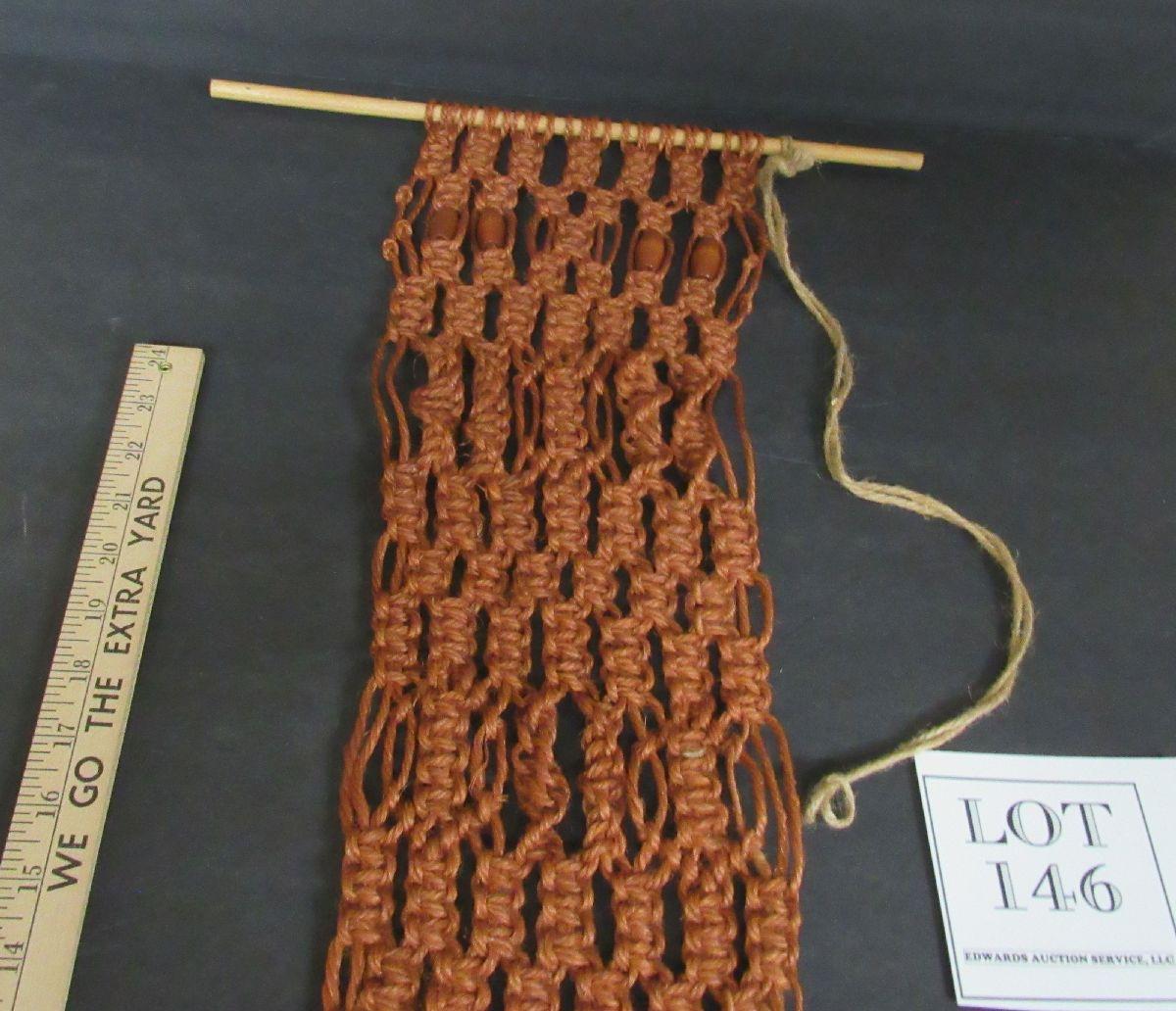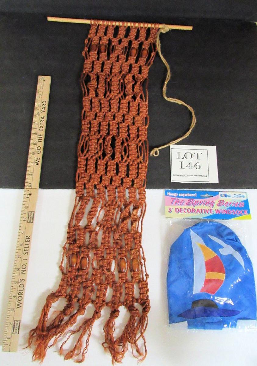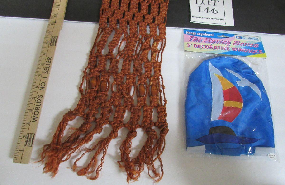 Unused wind sock, macrame hanger looks fine. Shipping is available at shipping cost plus $5.00 handling fee on one box, $10.00 handling fee on two boxes, $15.00 handling fee on 3 boxes. Helps cover shipping materials and labor cost.