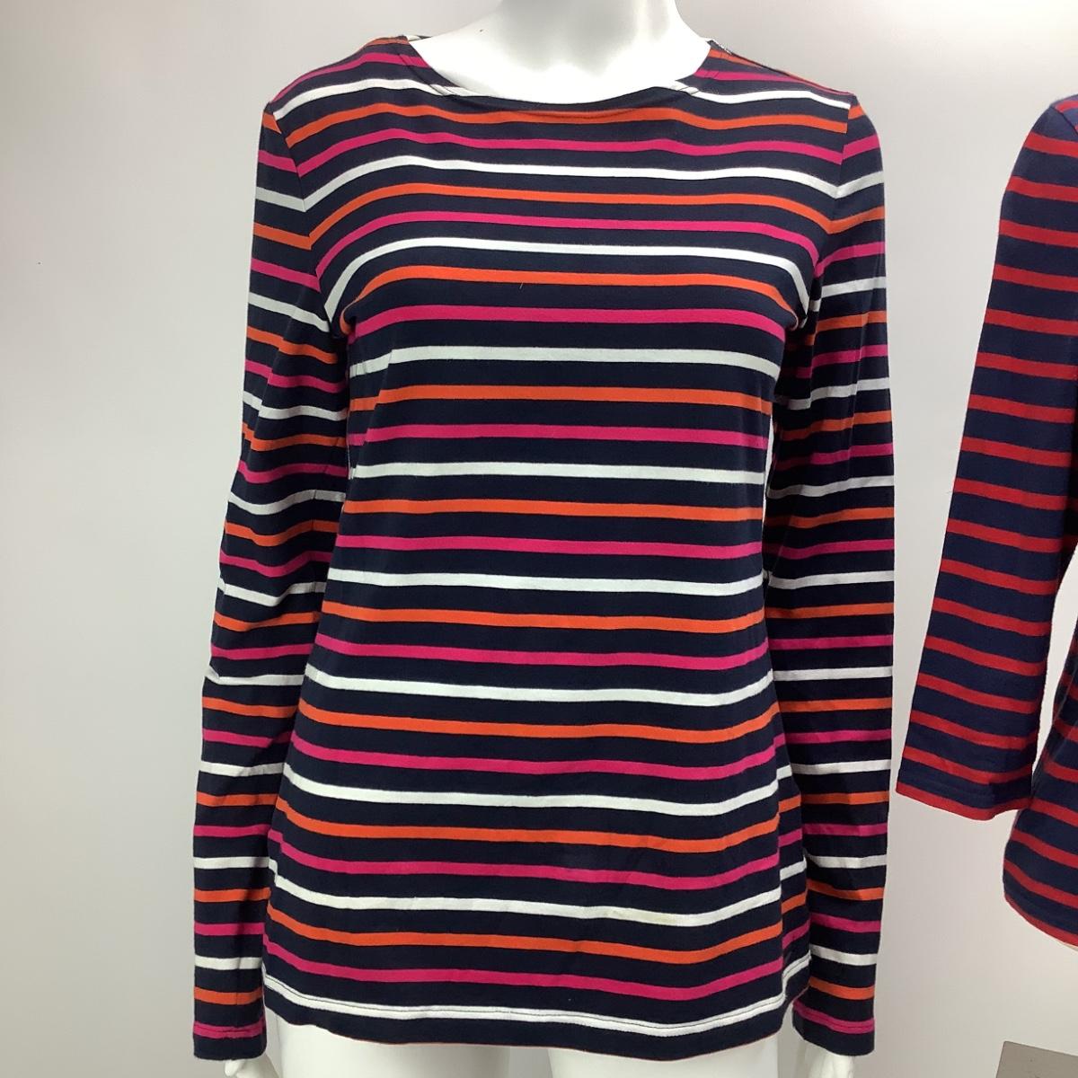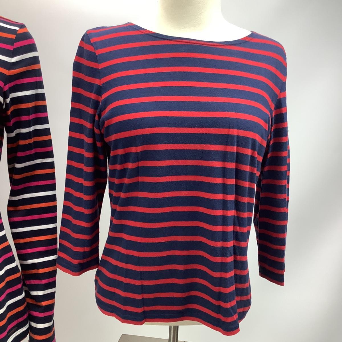 There are 2 striped shirts-the red and blue stripe is 3/4 sleeve and the multicolor top is long sleeve. The shirts measure 18" from armpit to armpit and 25" overall length. The appear to be medium in size.