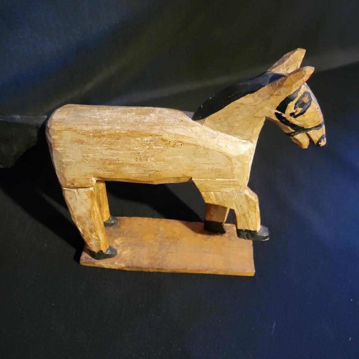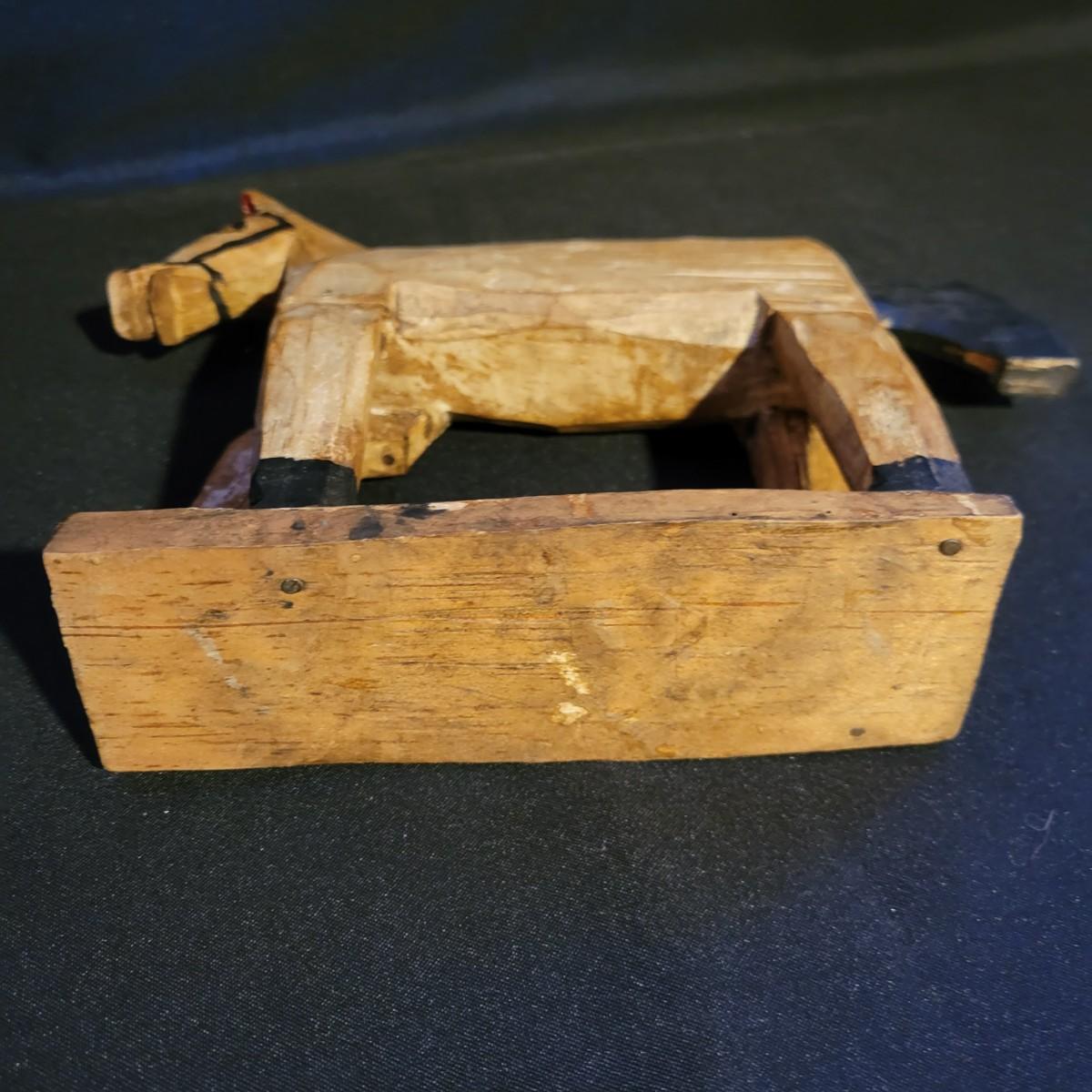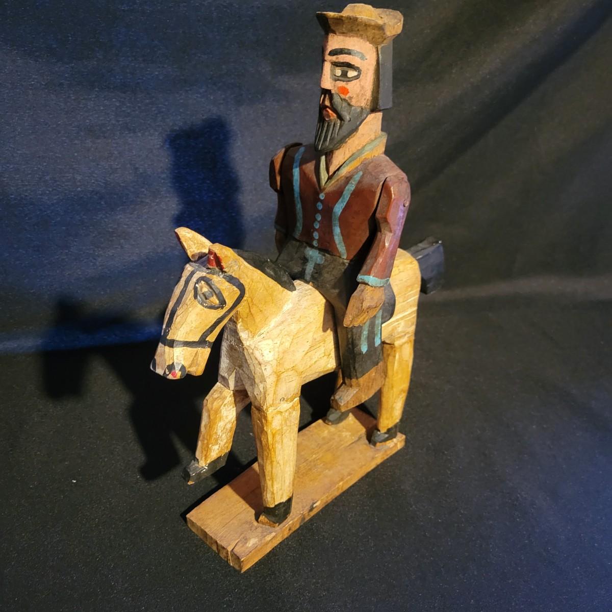A primitive Carved Saint James the apostle on horse Santos that is an example of Mexican folk art. The arms move and it appears a staff or sword is missing from the right hand. It measures approximately 12" x 5" x 14"H. Shipping available