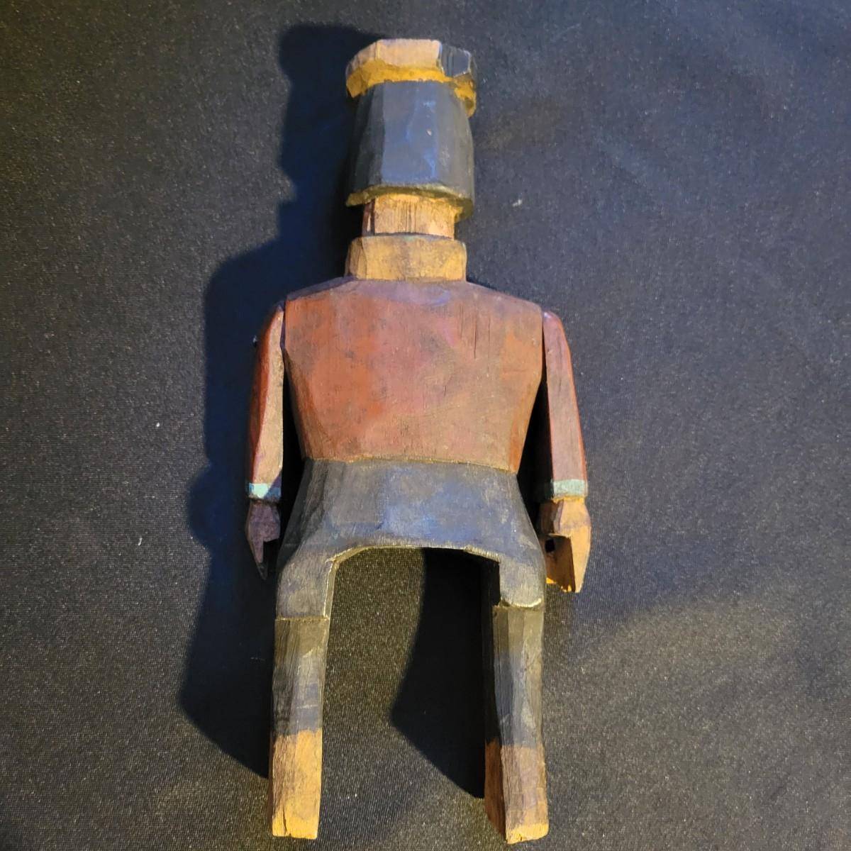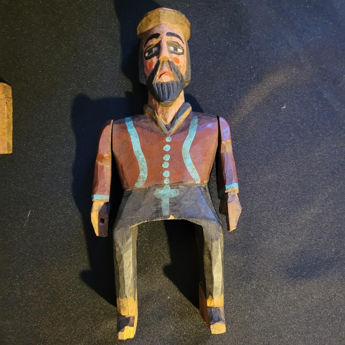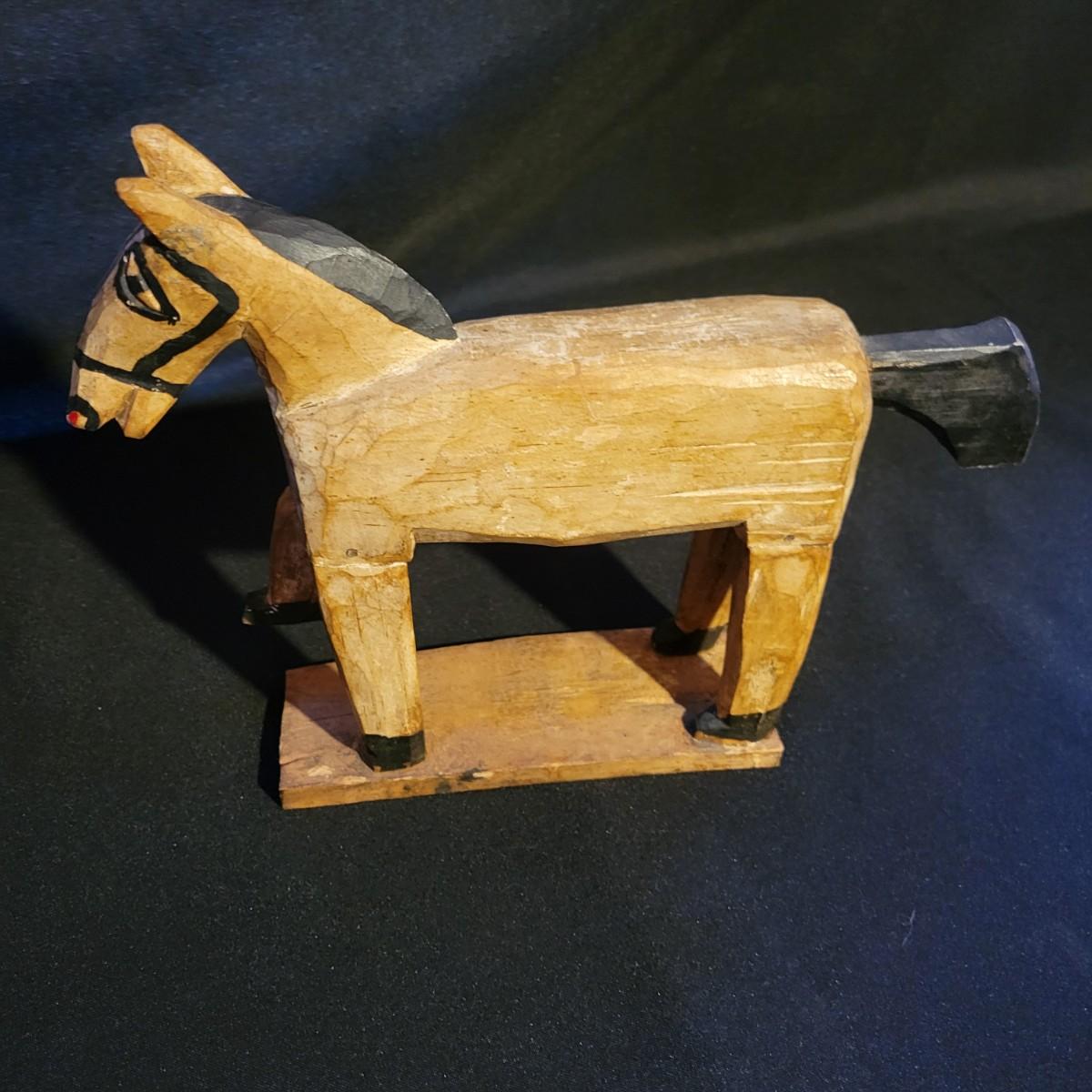 A primitive Carved Saint James the apostle on horse Santos that is an example of Mexican folk art. The arms move and it appears a staff or sword is missing from the right hand. It measures approximately 12" x 5" x 14"H. Shipping available