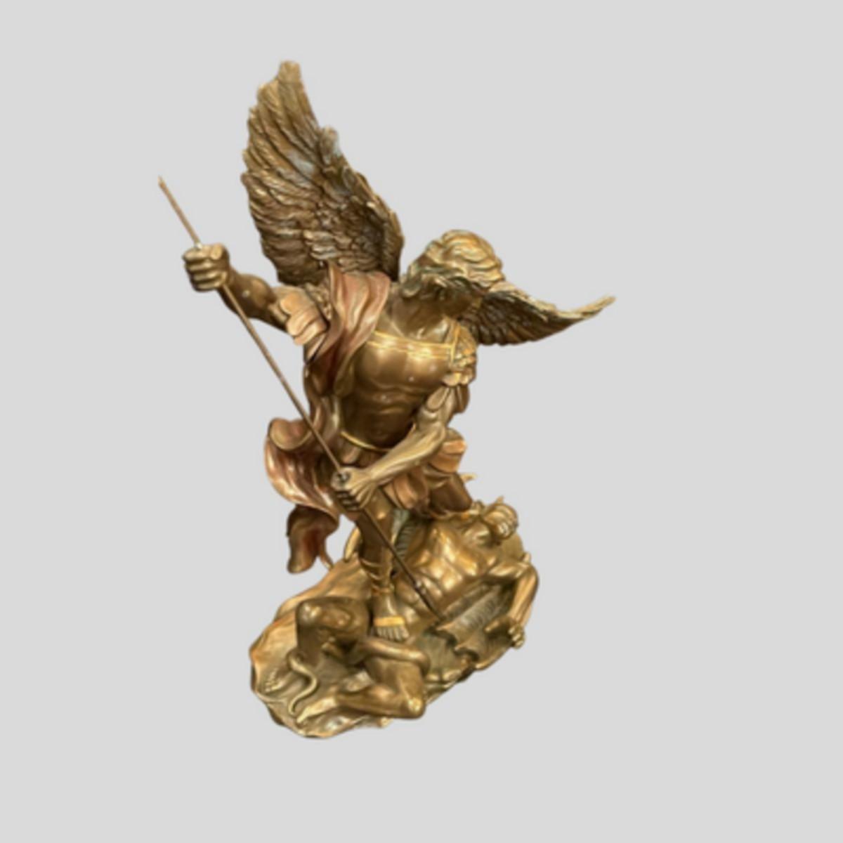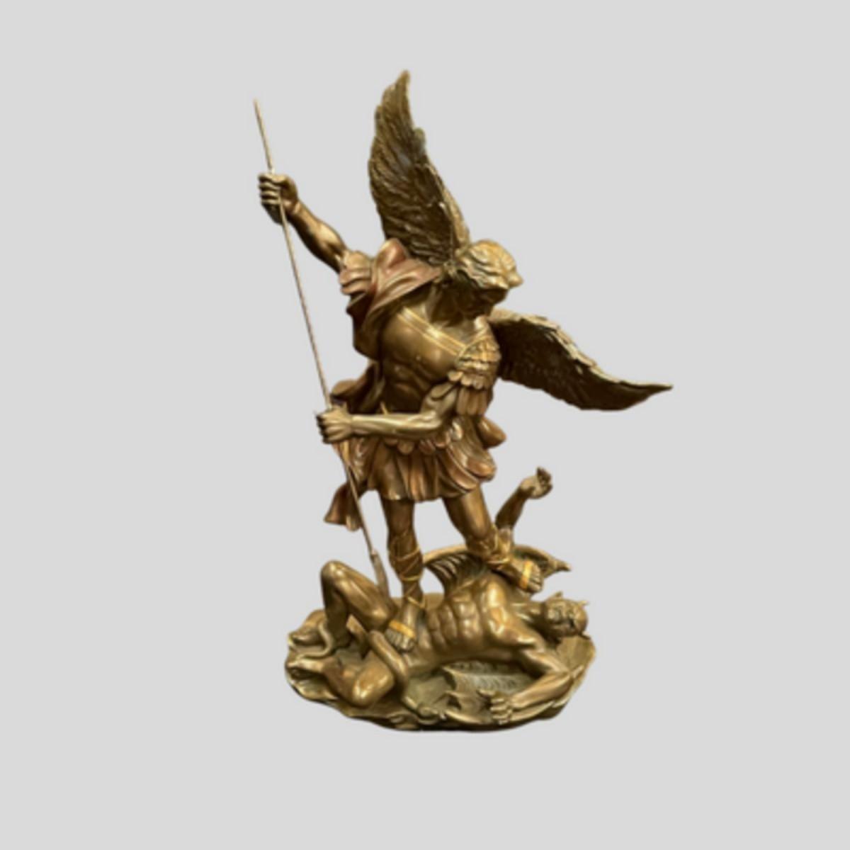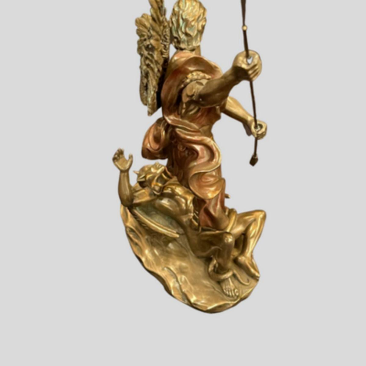 This statue depicts a scene from the Book of Revelation, which describes a "war in heaven" between angels led by Archangel Michael against the fallen angels led by "the dragon," or Satan, who are defeated and thrown down to earth.