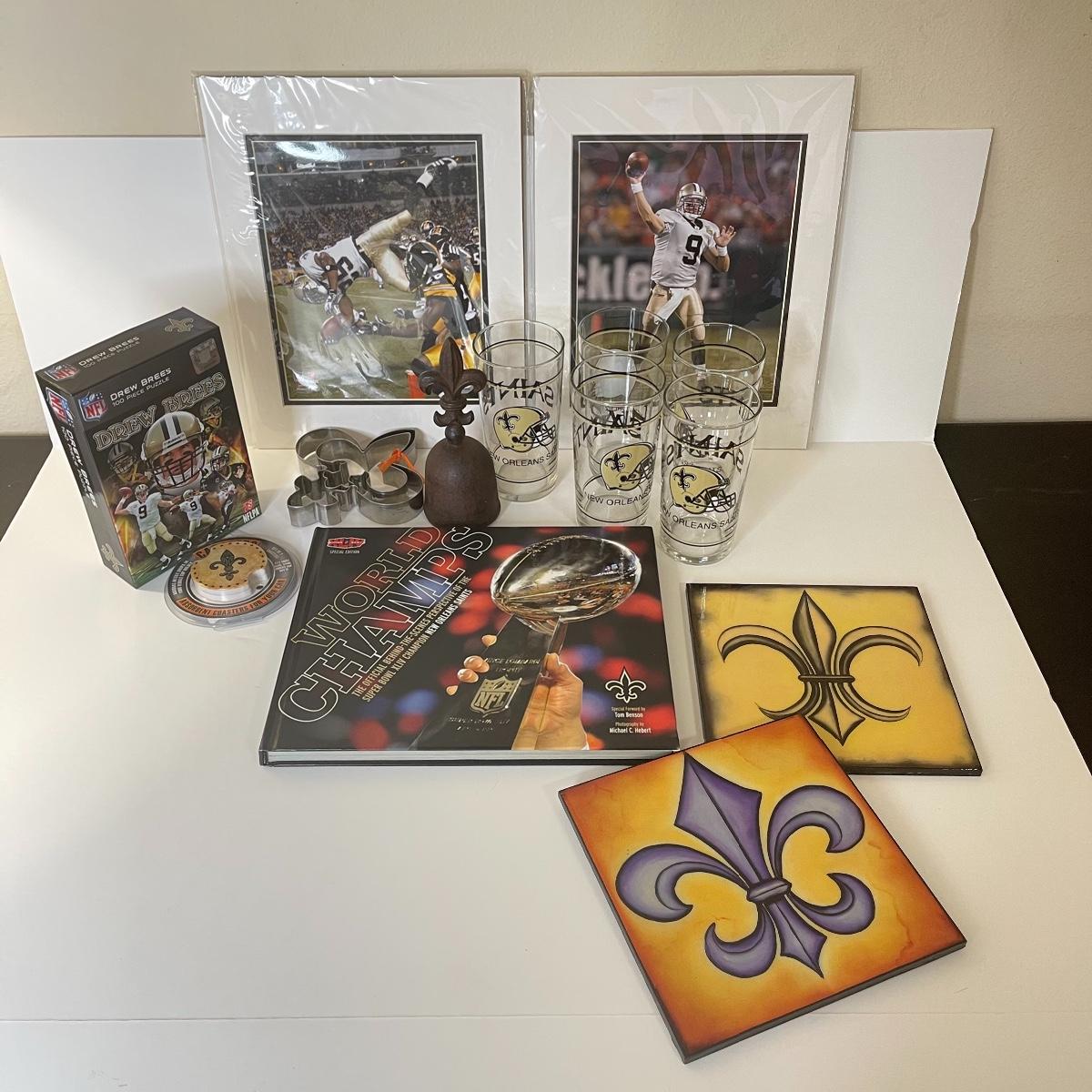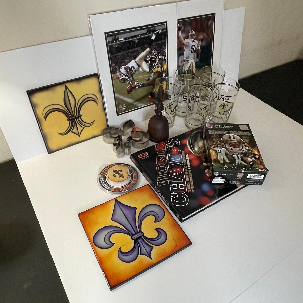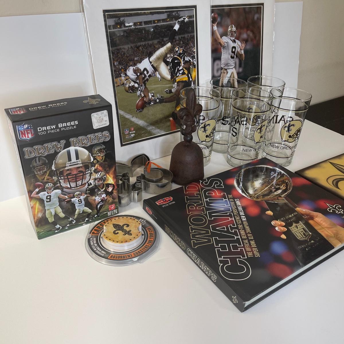 Collection includes: 2 Photos, Coasters, 2 foam backed Fleur de Lis “tiles”, 5 glass tumblers, cookie cutter, World Champ Book and Iron bell