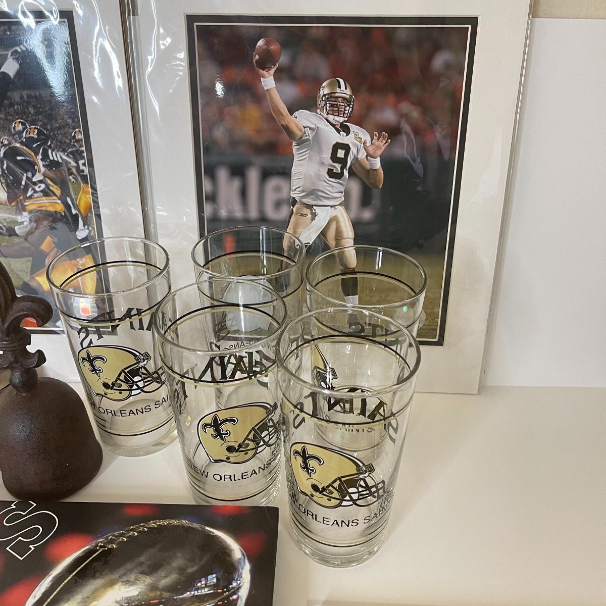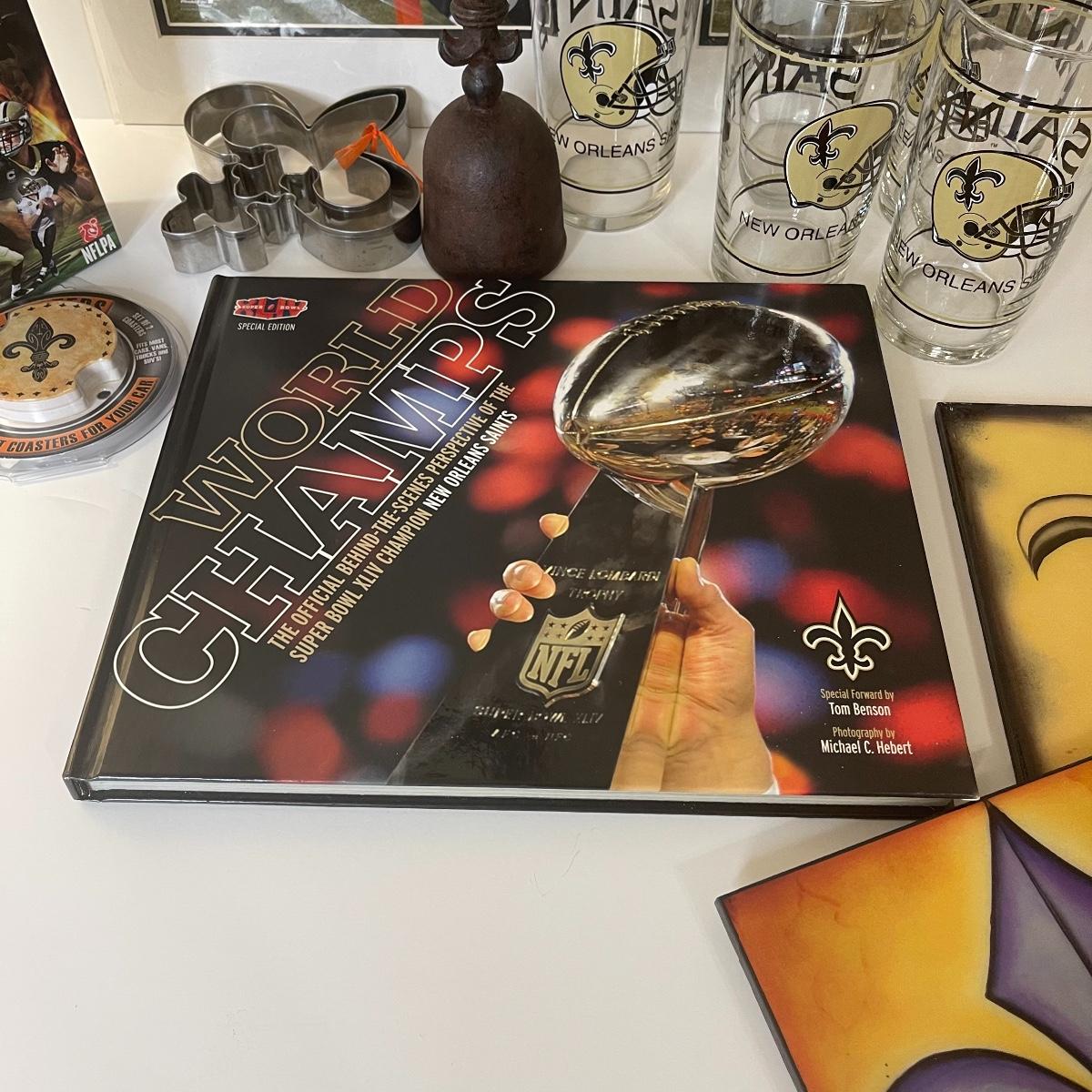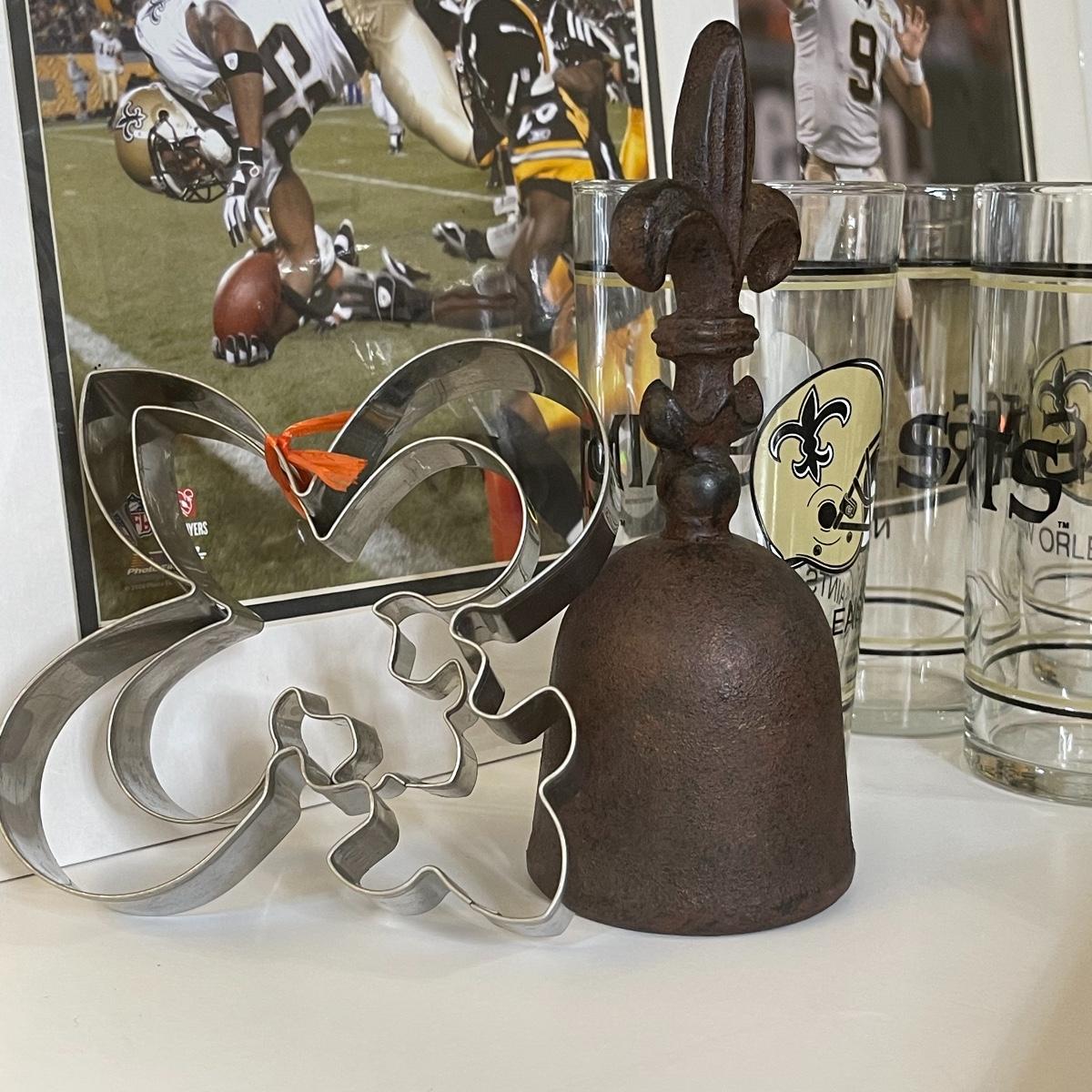Collection includes: 2 Photos, Coasters, 2 foam backed Fleur de Lis “tiles”, 5 glass tumblers, cookie cutter, World Champ Book and Iron bell