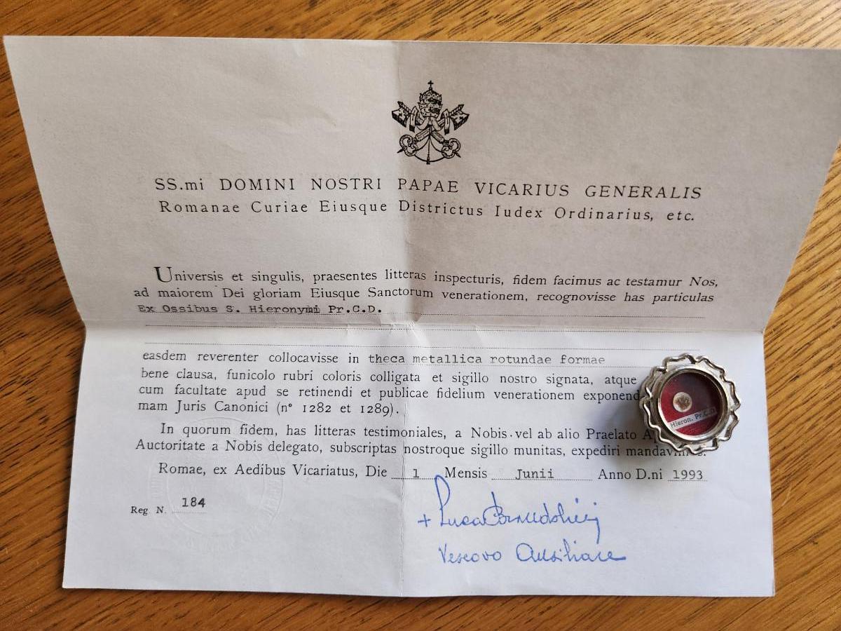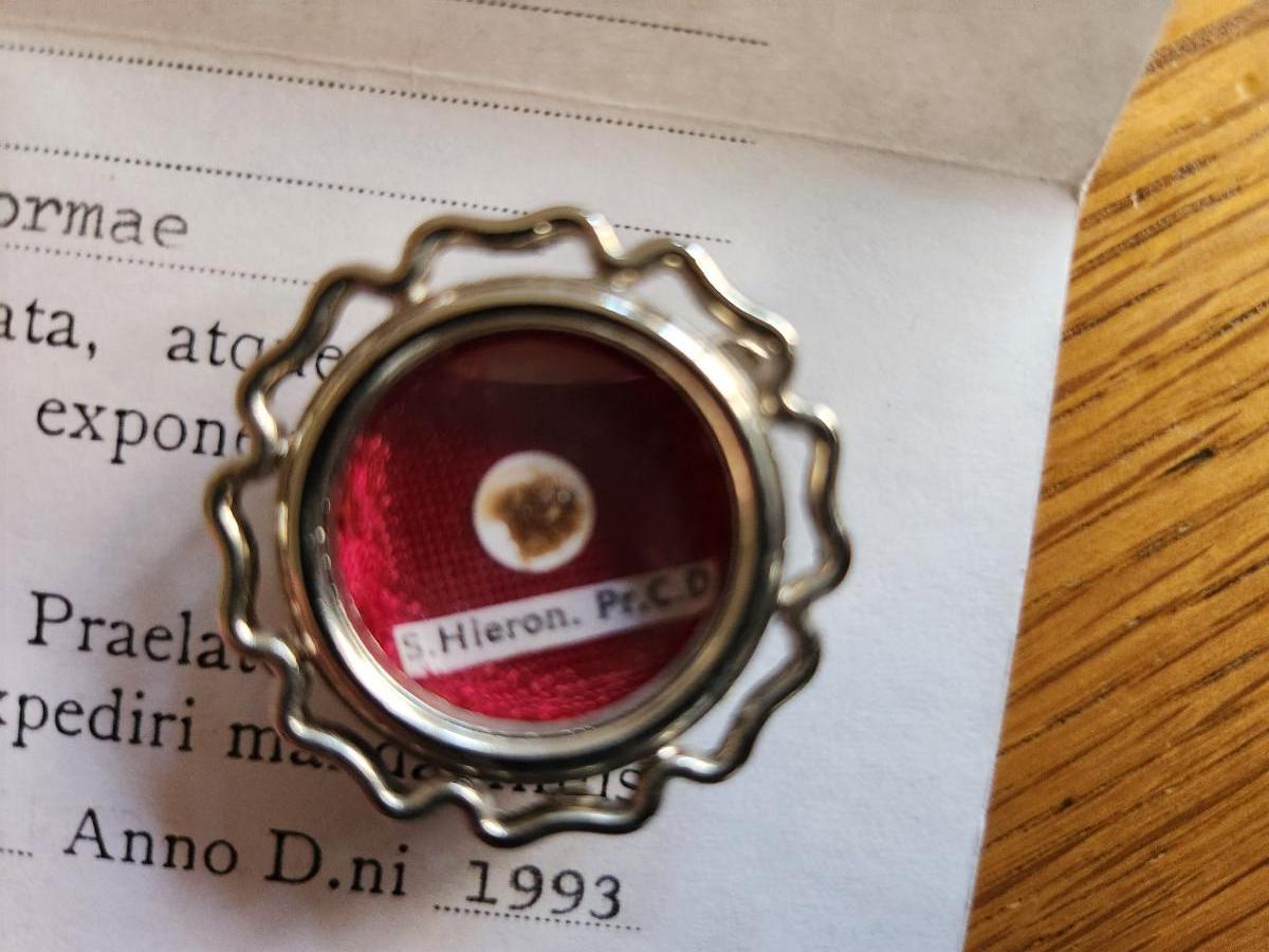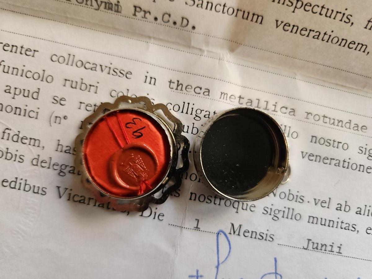 This auction lot is for a Saint's Reliquary Case. This case contains the "relic" of St. Hieronymi, Pr. CD- as is the accepted tradition and custom the "relic" is not being sold, only the case that holds it. The "relic" is a gift. This item has the red sealed wax of the Ecclesiastica and comes with papers as such.