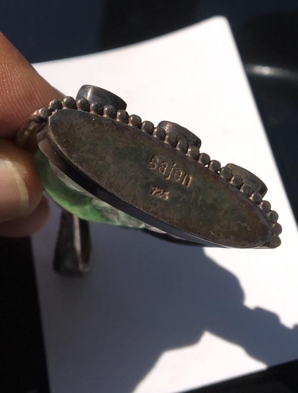 Vintage sterling pendant with green and purple jade. Looks like a moonstone on top. Amethyst and emerald stones on the bottom. Measures 3” tall and 1.5” wide.
