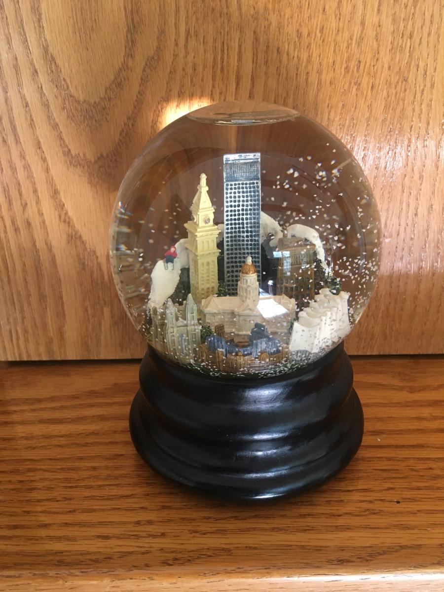 Glass top snow globe scene of Denver . Plays a tune which might be ROcky Mountain High, but unsure.