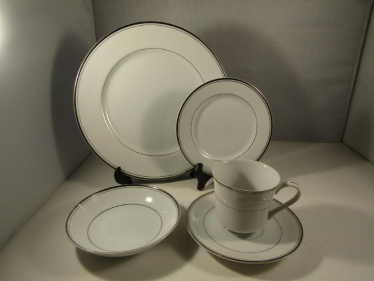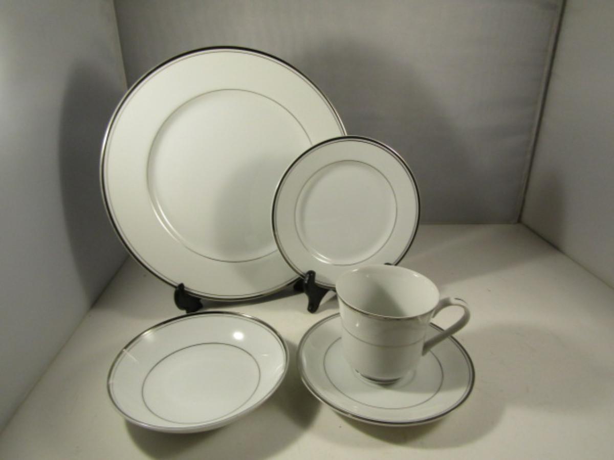 Sakurai Platinum Rimmed Dinnerware- 'Castle' Pattern- Approx 20 Pieces. 5 each of dinner plate, bread plate, berry bowl, cup, and saucer.