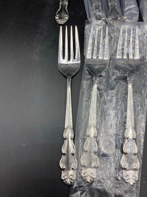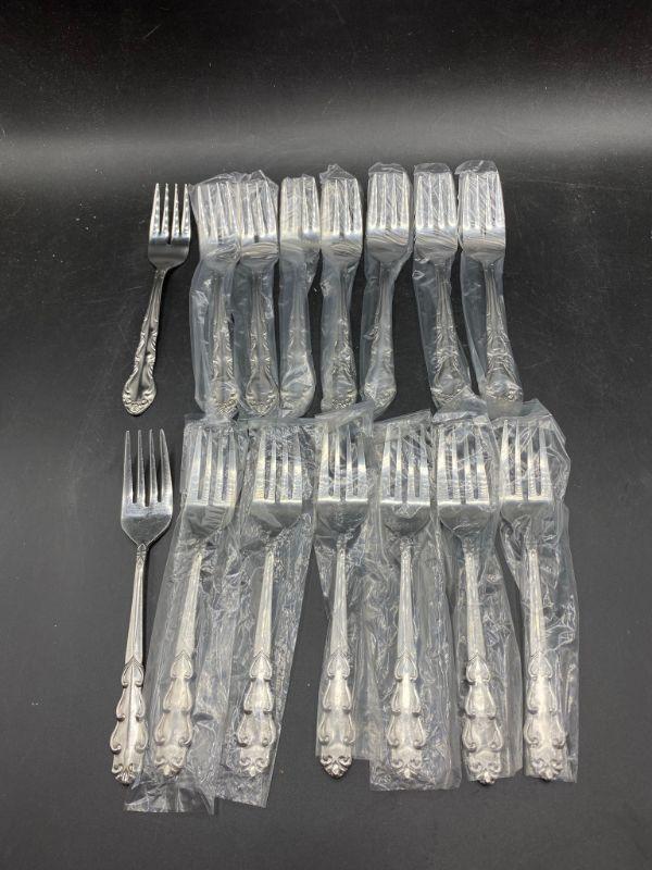 15 salad/ dessert forks. Two different patterns. Unused, most are in plastic.
