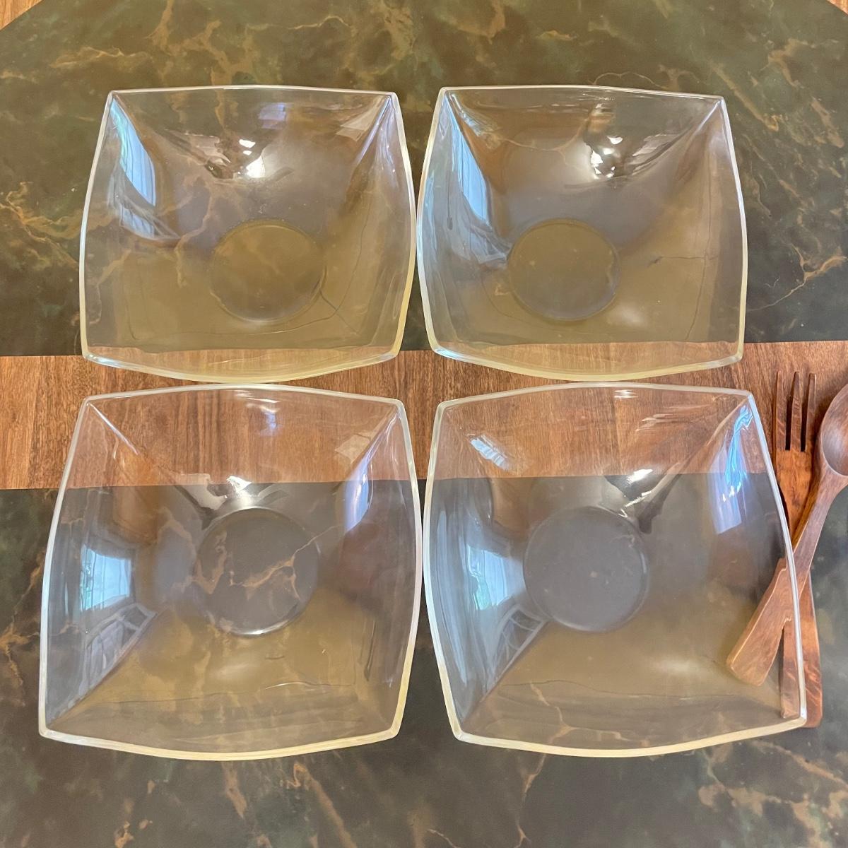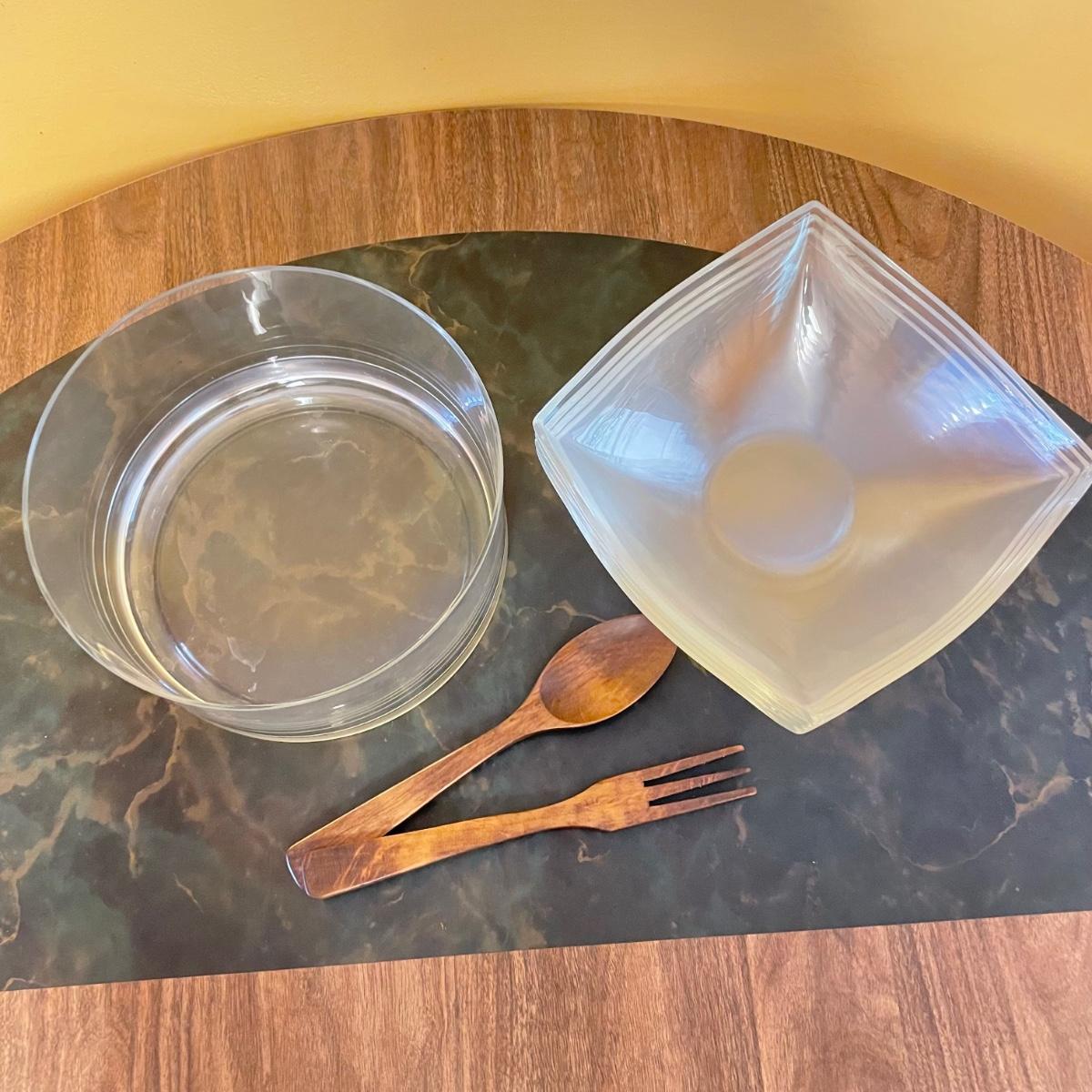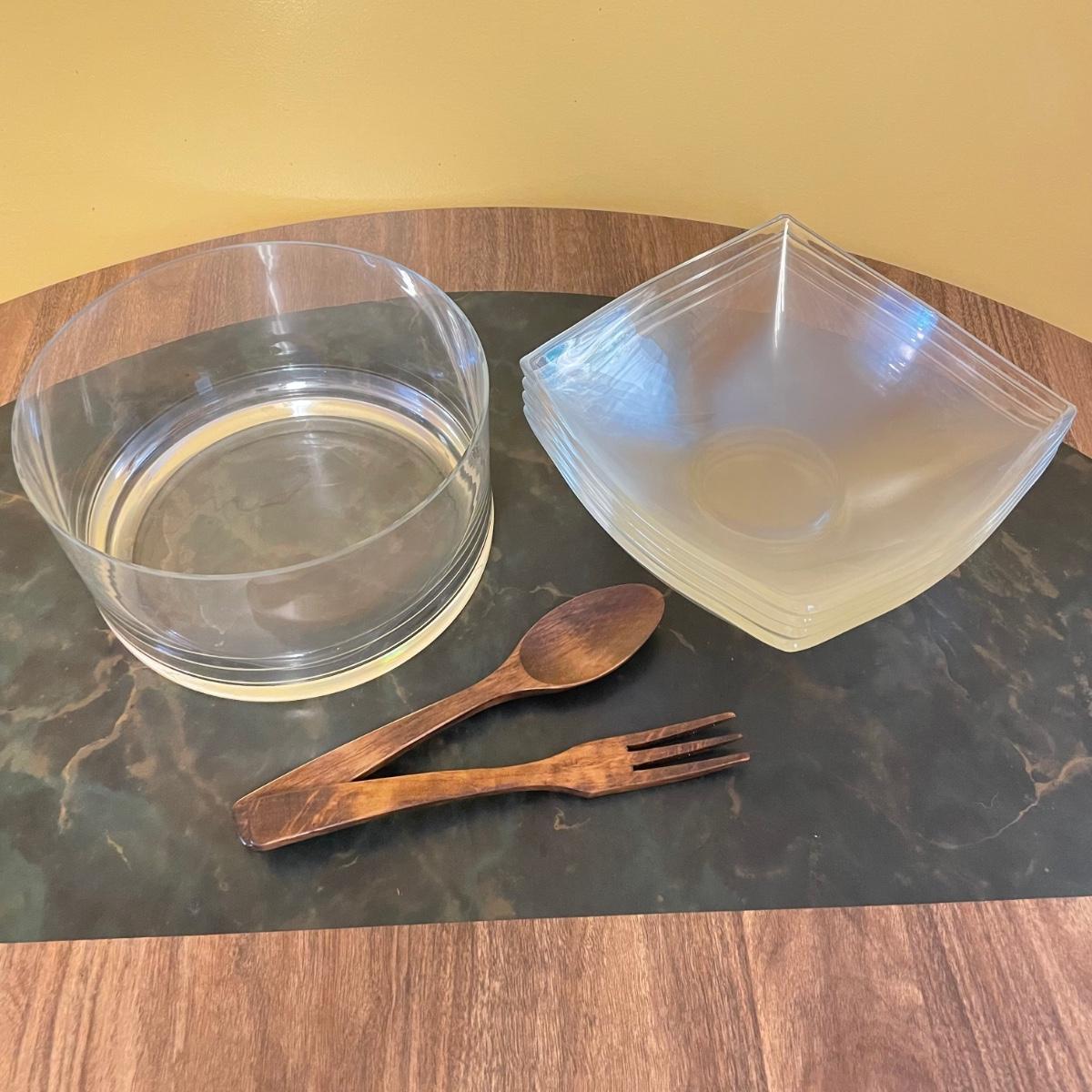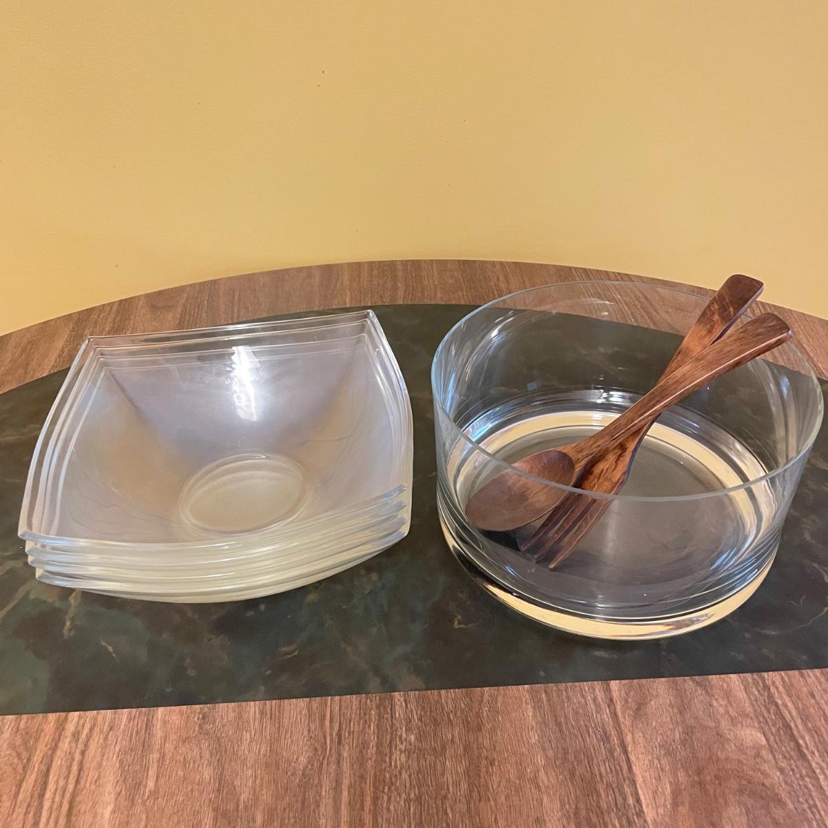 Beautiful serving combination with a large glass bowl. Four large dishes perfect for serving, but also a good size for salad or pasta dishes. Lastly two wooden 10” serving utensils. See images. Local pick up only.