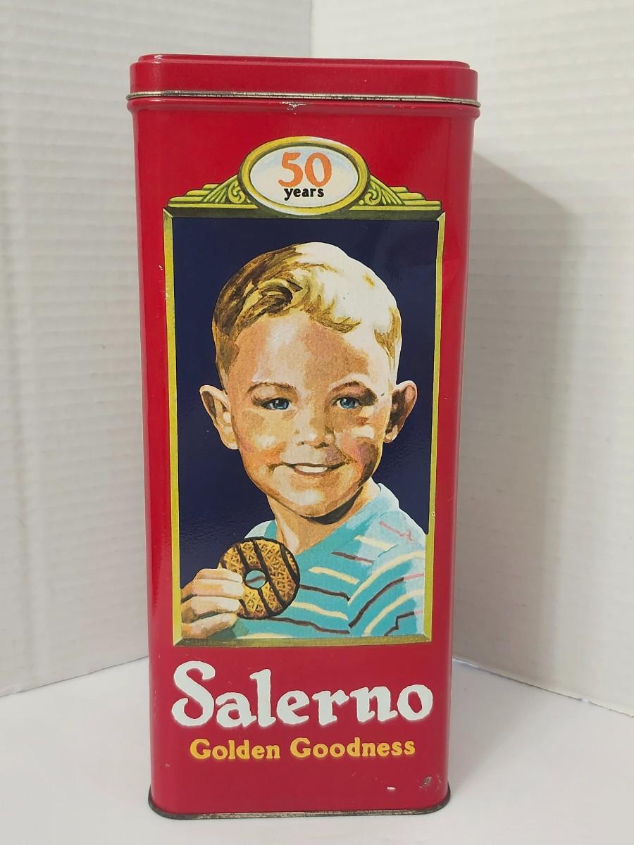 Salerno Golden Goodness Biscuit Tin Tall Red Metal Canister 50 Years Anniversary Child Artwork