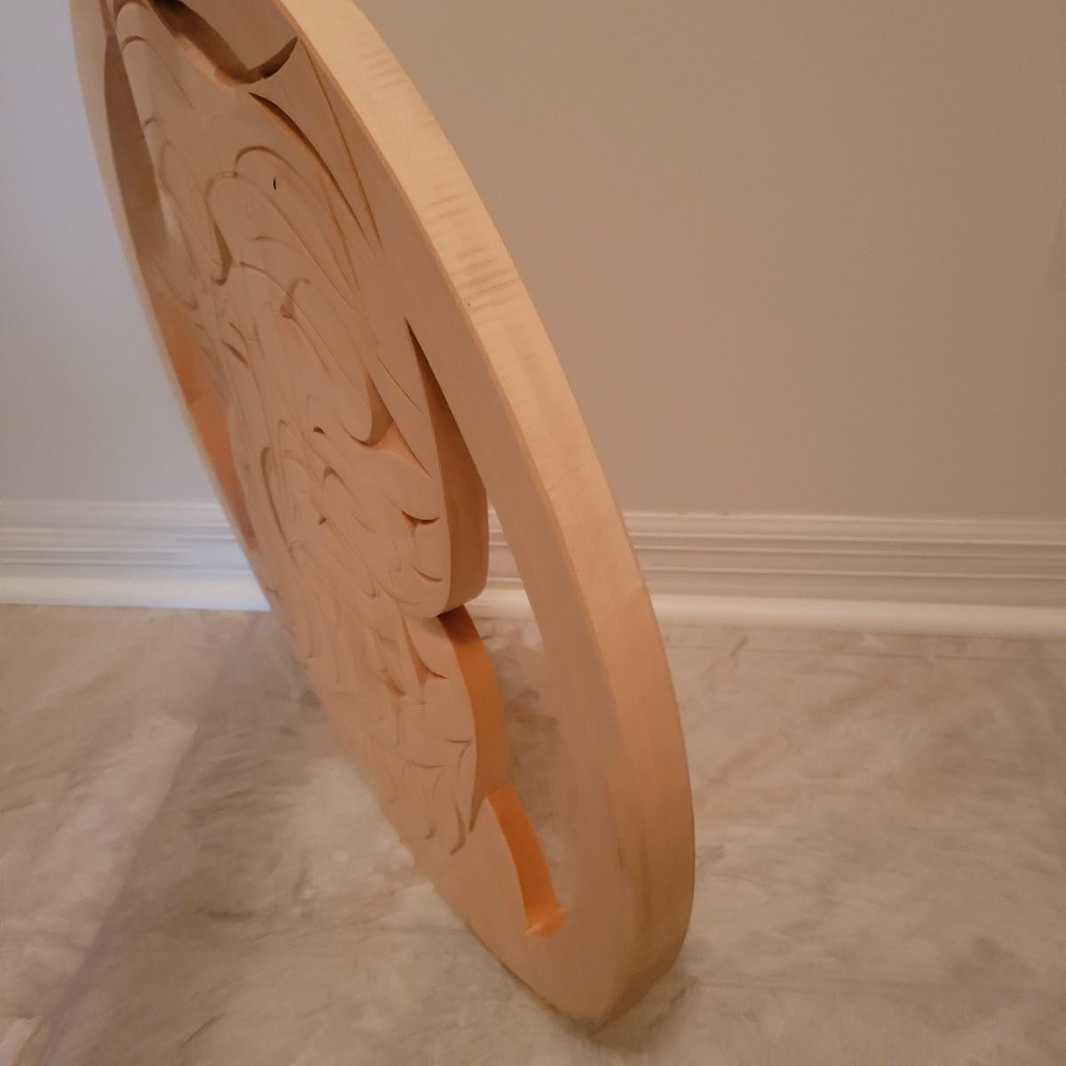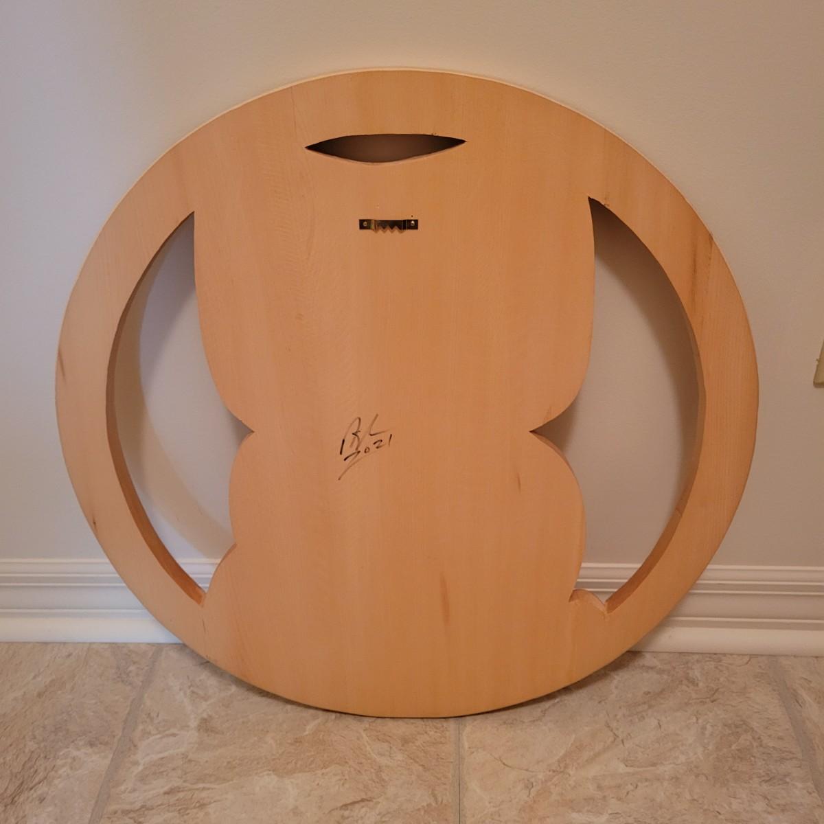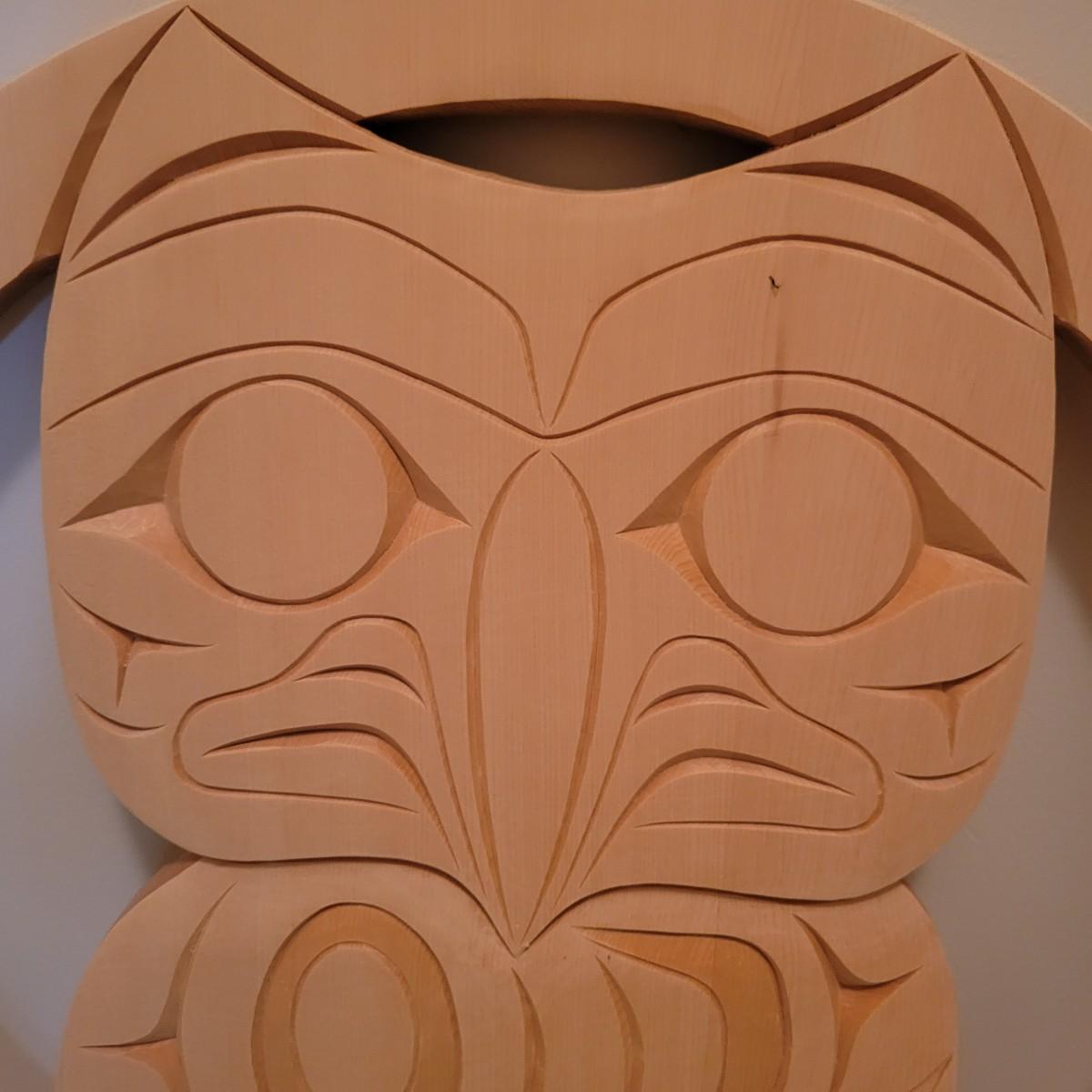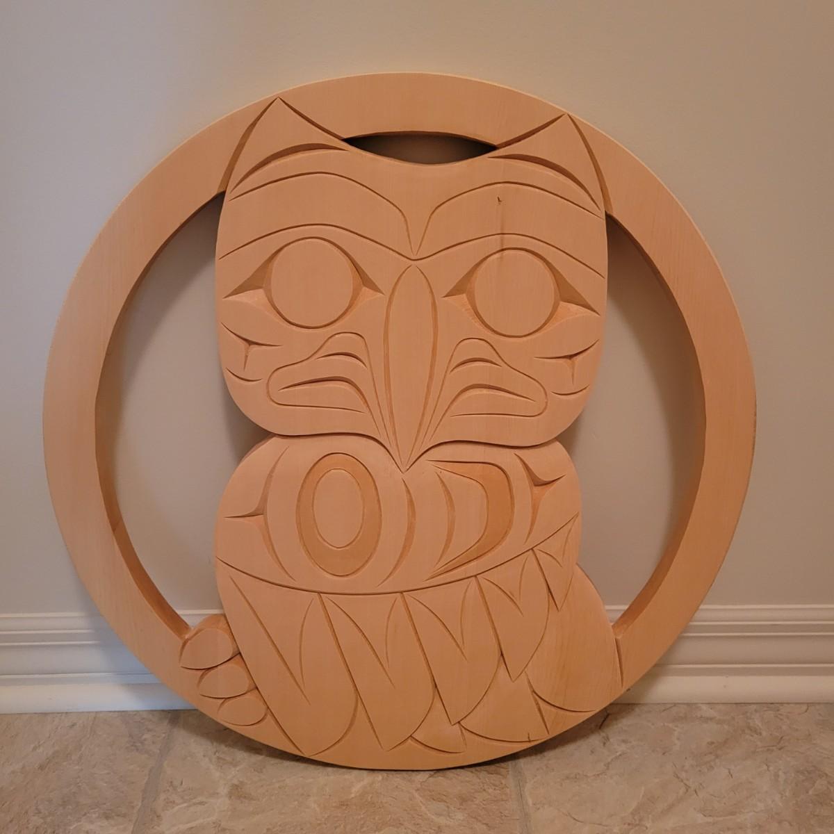 An owl, hand carved out of yellow cedar. It is carved in the style of First Nation Salish and is signed on the back. It measures approximately 21.5"D x 1"W. Shipping available