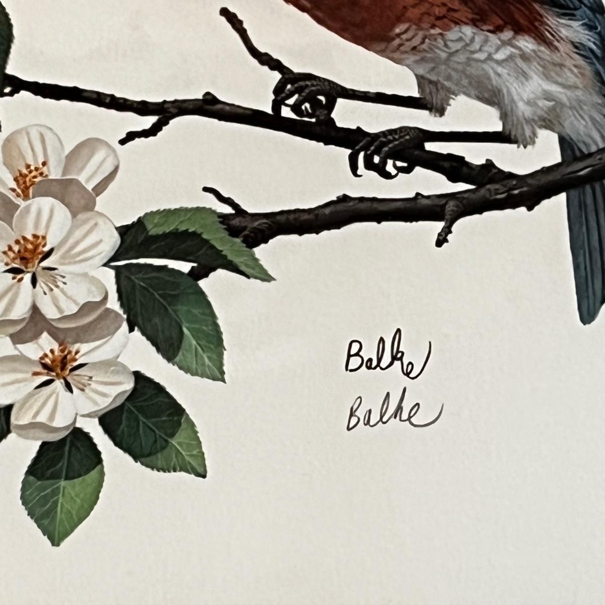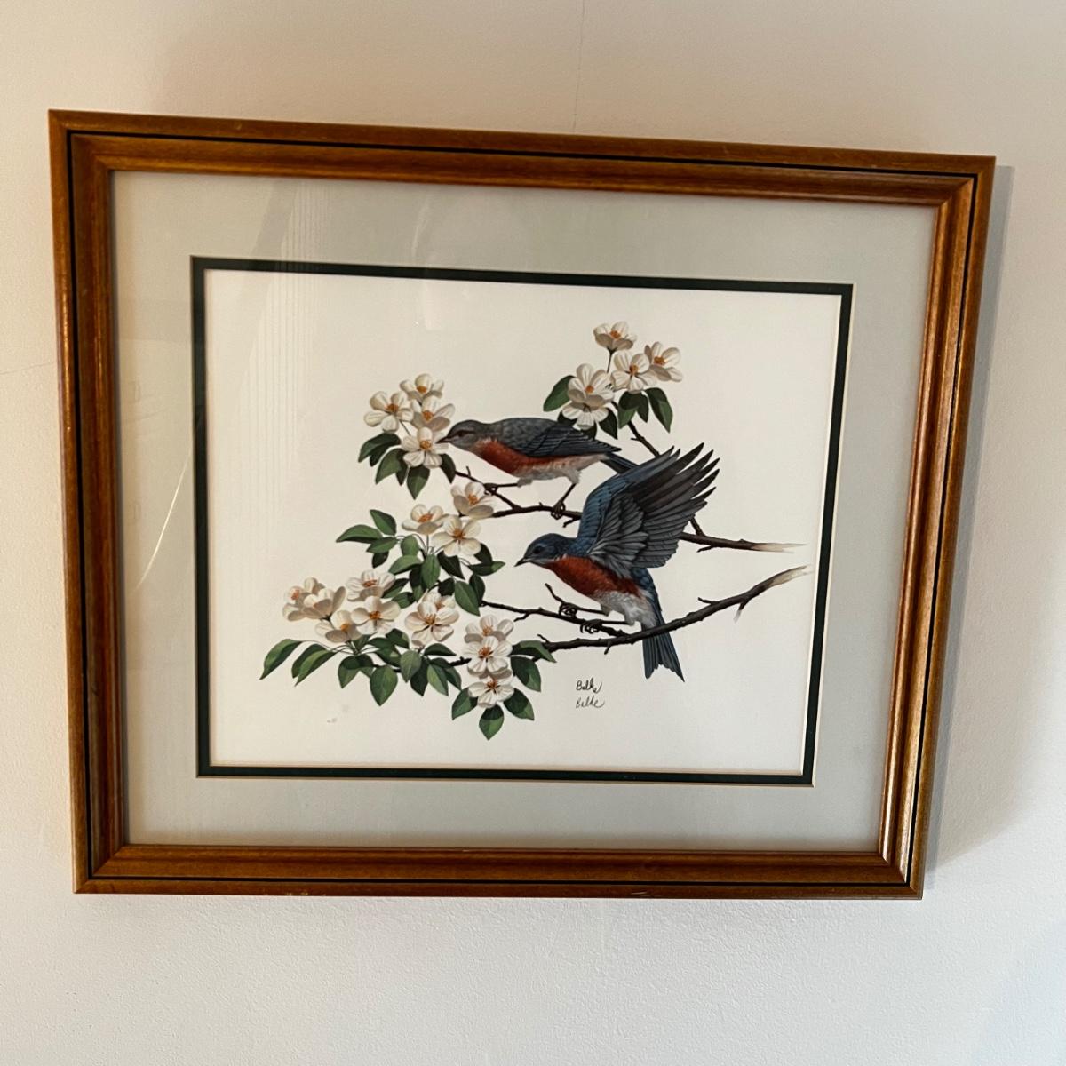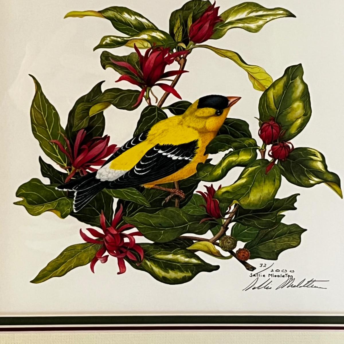 Two pencil signed prints featuring birds. The American Goldfinch print by Sallie Middleton is numbered 32/2000. Gilded wooden frame measures 16” square. The other print signature appears to read Balke and is in a wooden frame. Both prints are matted and under glass.