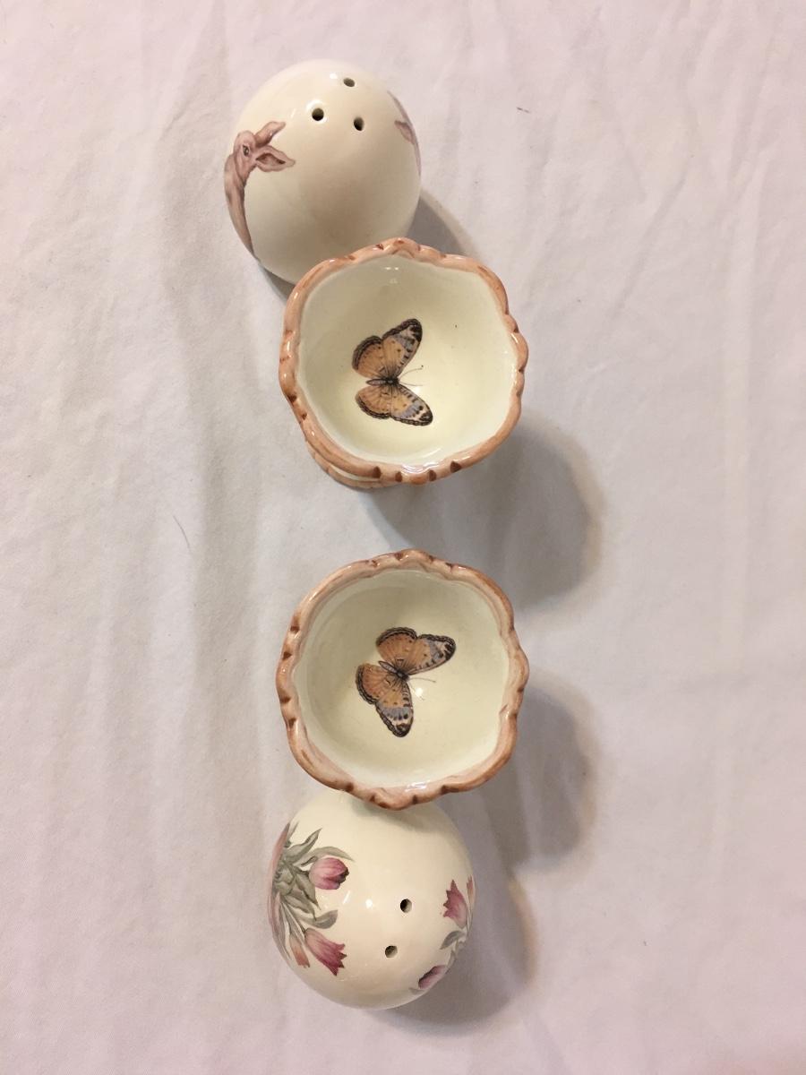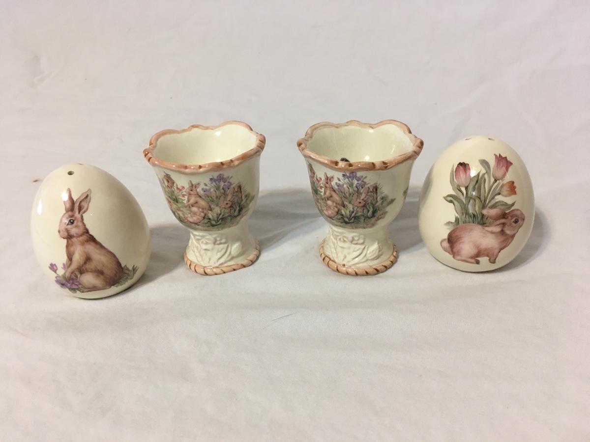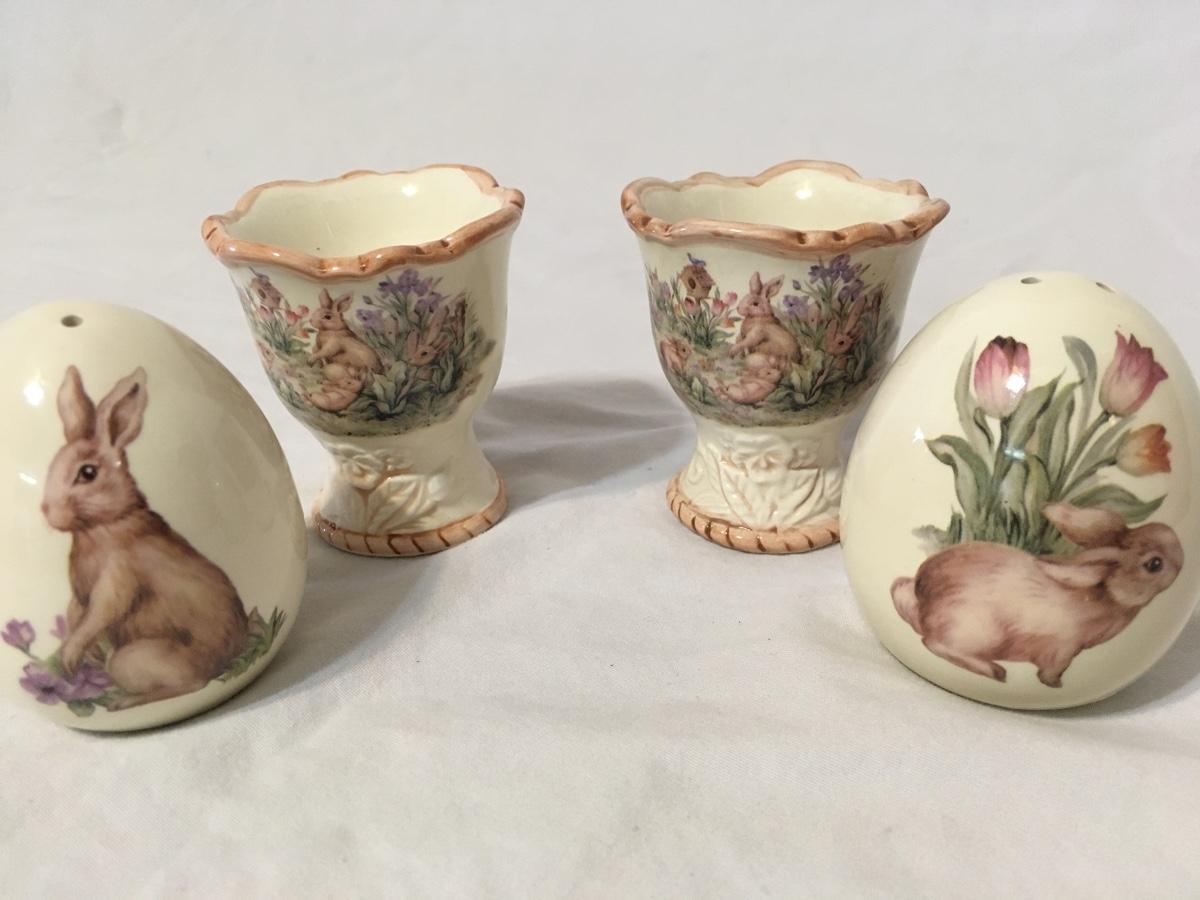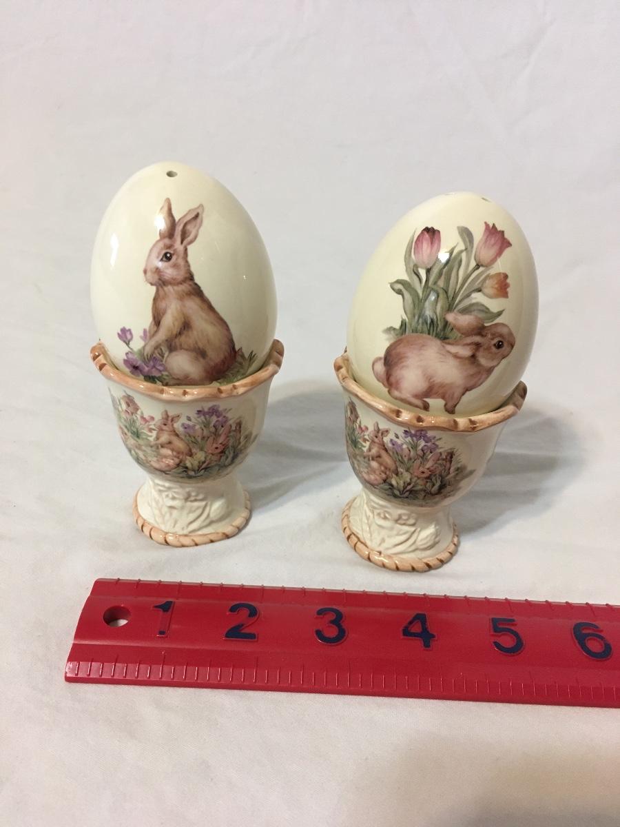 Egg shaped salt and pepper shakers with bunny pictures very cute please see attached photos no chips or cracks