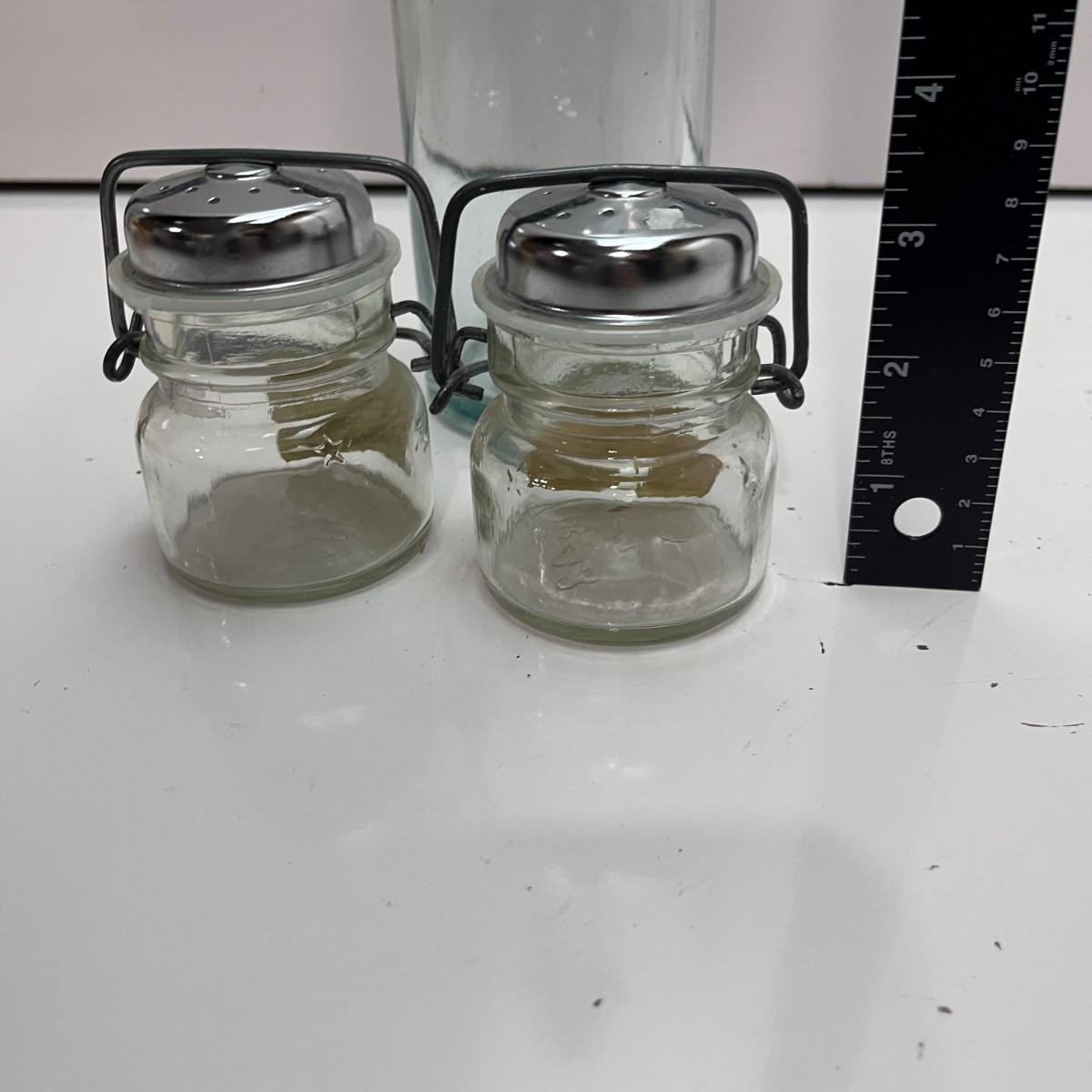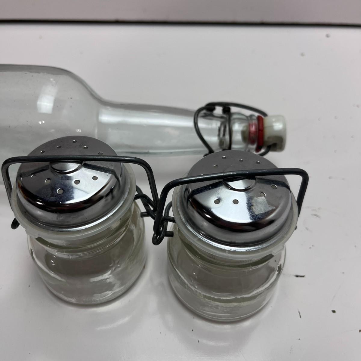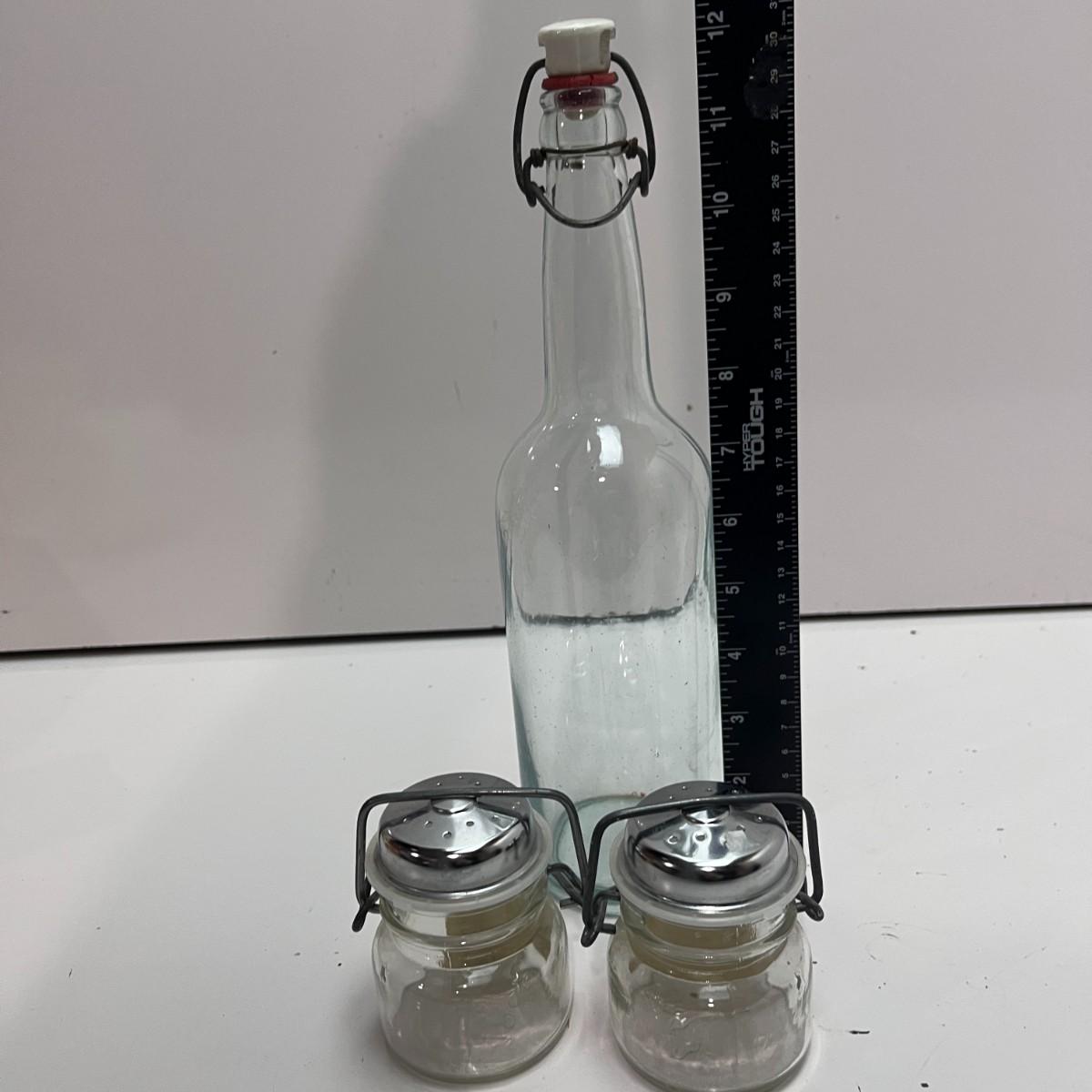 SALT AND PEPPER SHAKERS & BOTTLE WITH SIDE BAIL WIRES