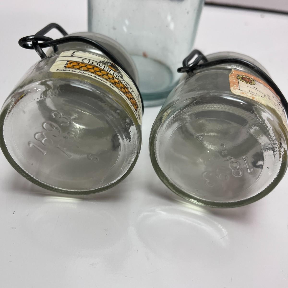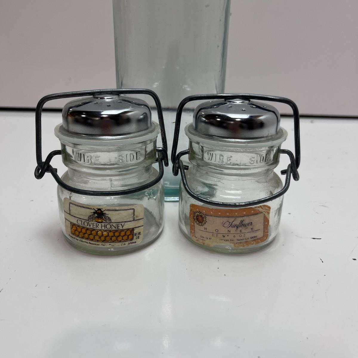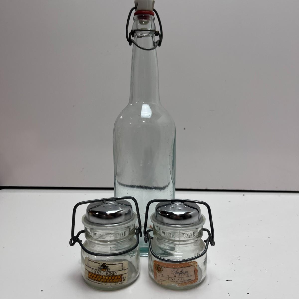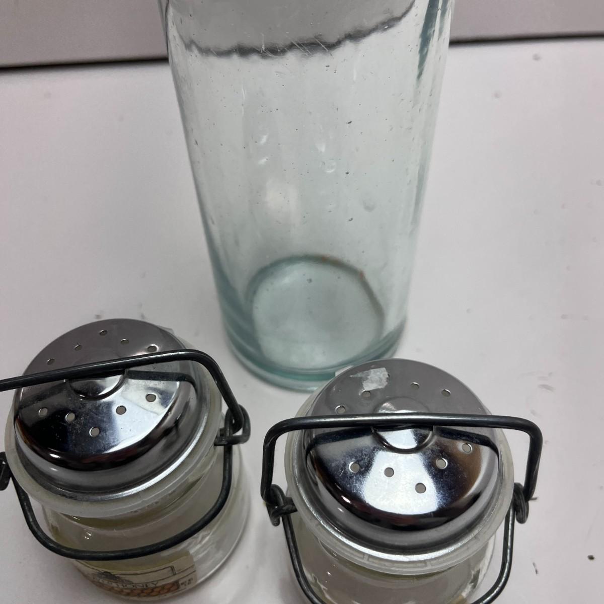SALT AND PEPPER SHAKERS & BOTTLE WITH SIDE BAIL WIRES