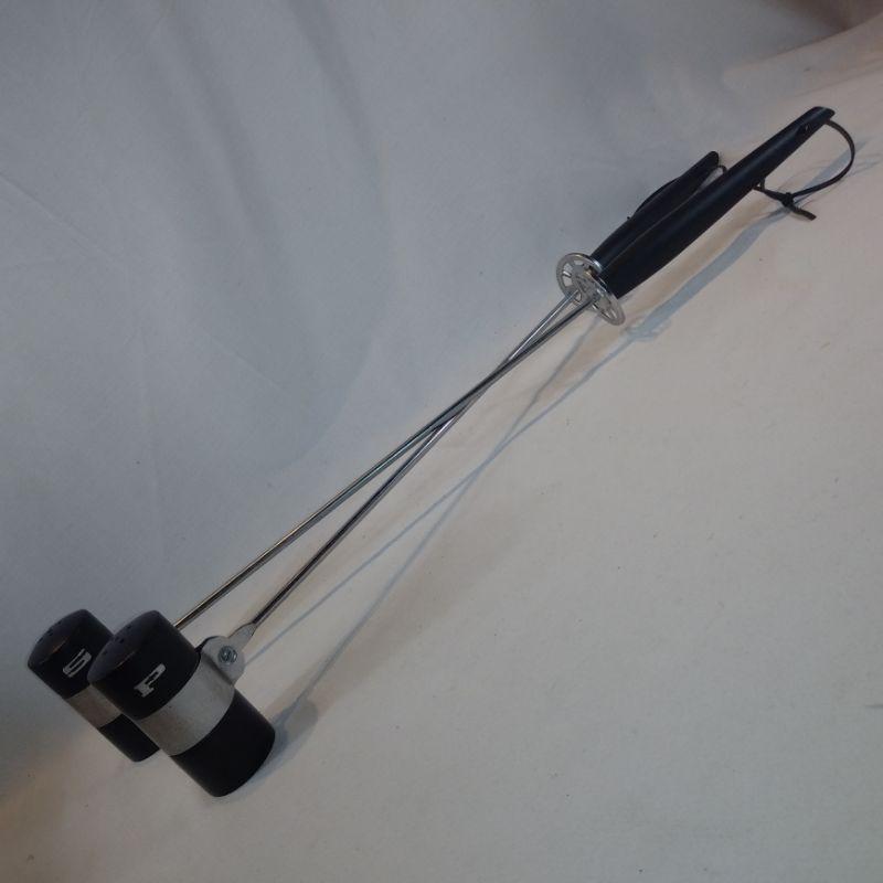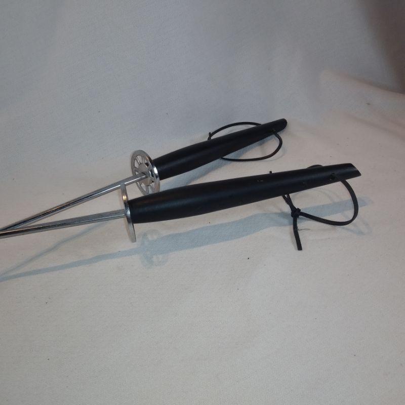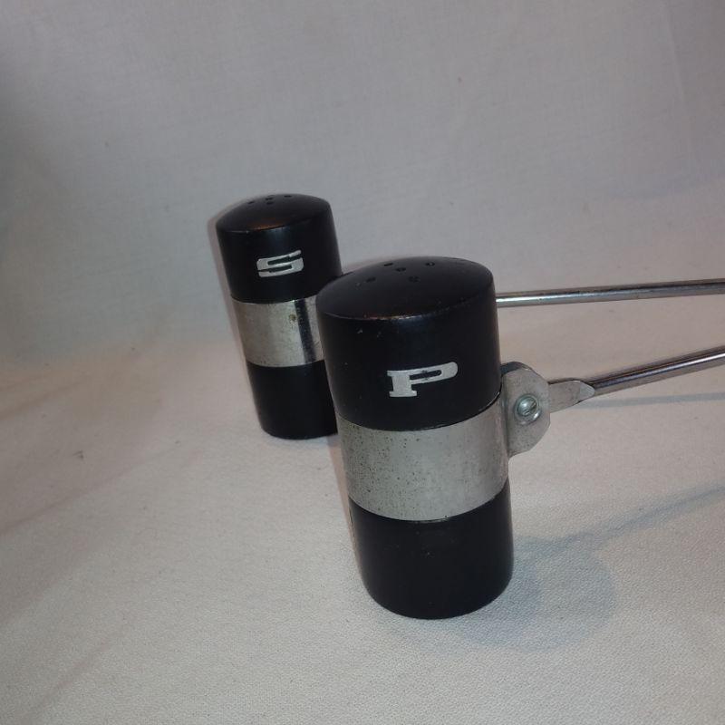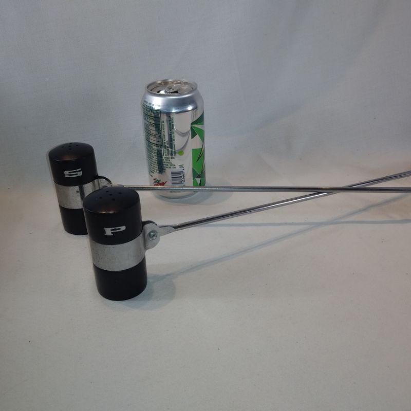 Salt and Pepper Shakers - Swords. A novelty from the 50's. Great gift for someone who has it all, but we bet they don't have these. Looks unused, the chrome shows slight age effects but overall in very good condition. They are 22-1/2-inches long. The shaker ends swivel