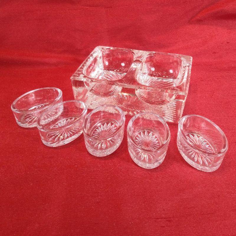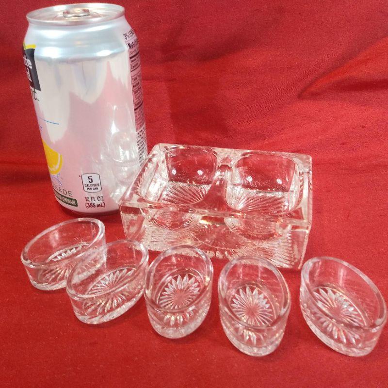 Here we offer a Hostess Double Salt with 5 Individual Guest Salts. The Master has a very tiny chip on one edge, all others are very good. It is a great set to be used, admired or employed independently for many modern uses.