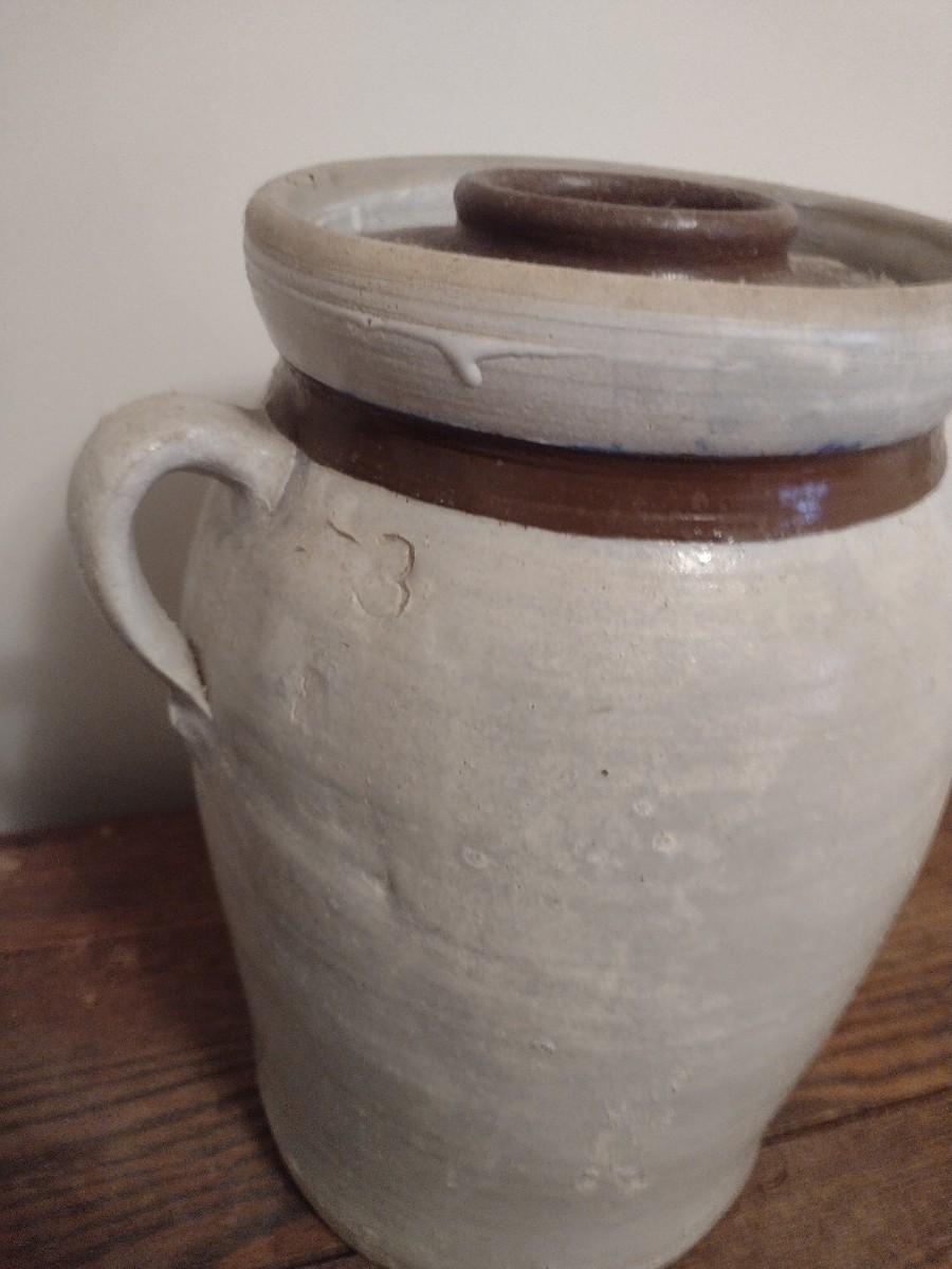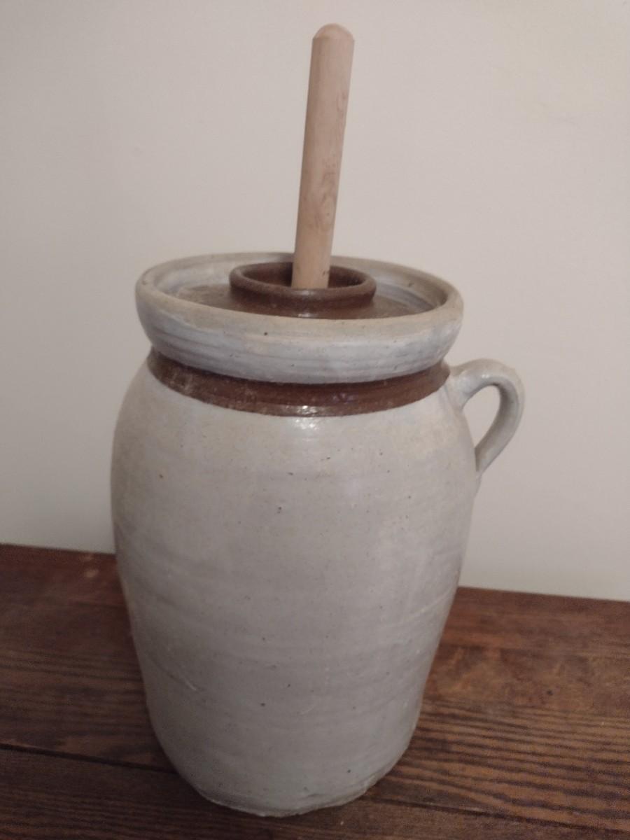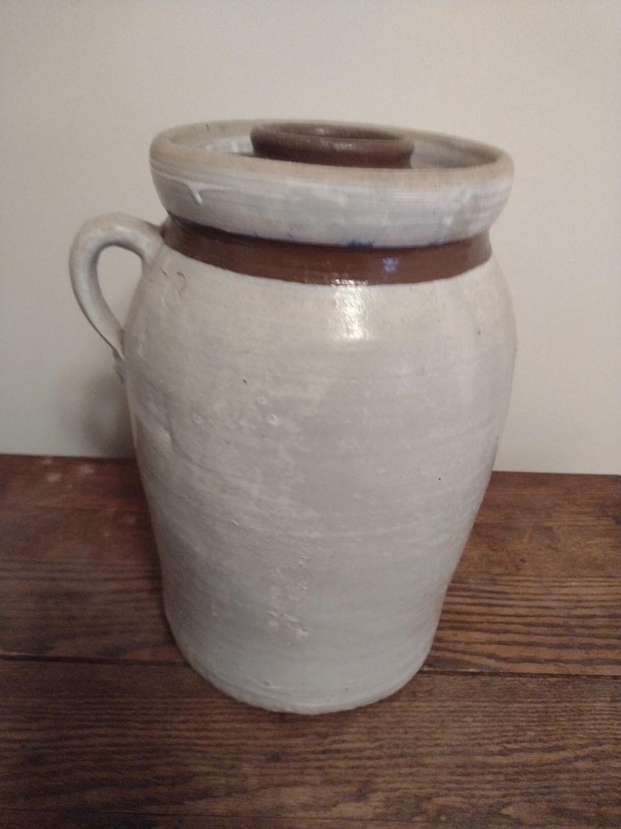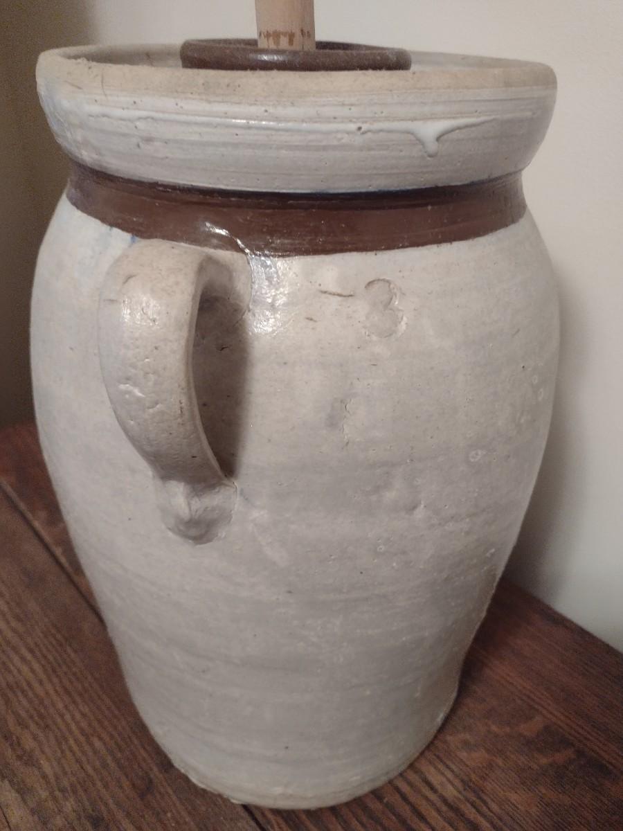 Salt Glazed Pottery #3 Butter Churn Crock with Hand Painted Lid and Neck