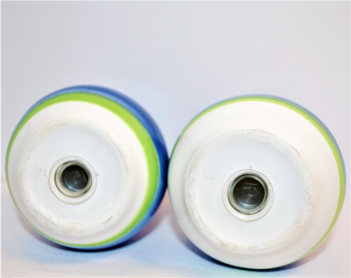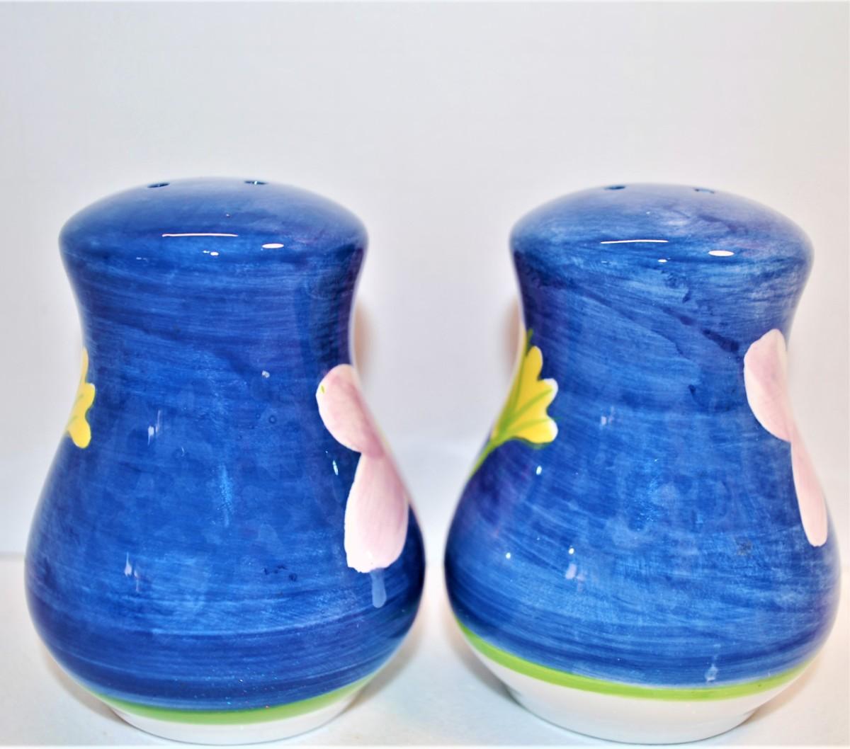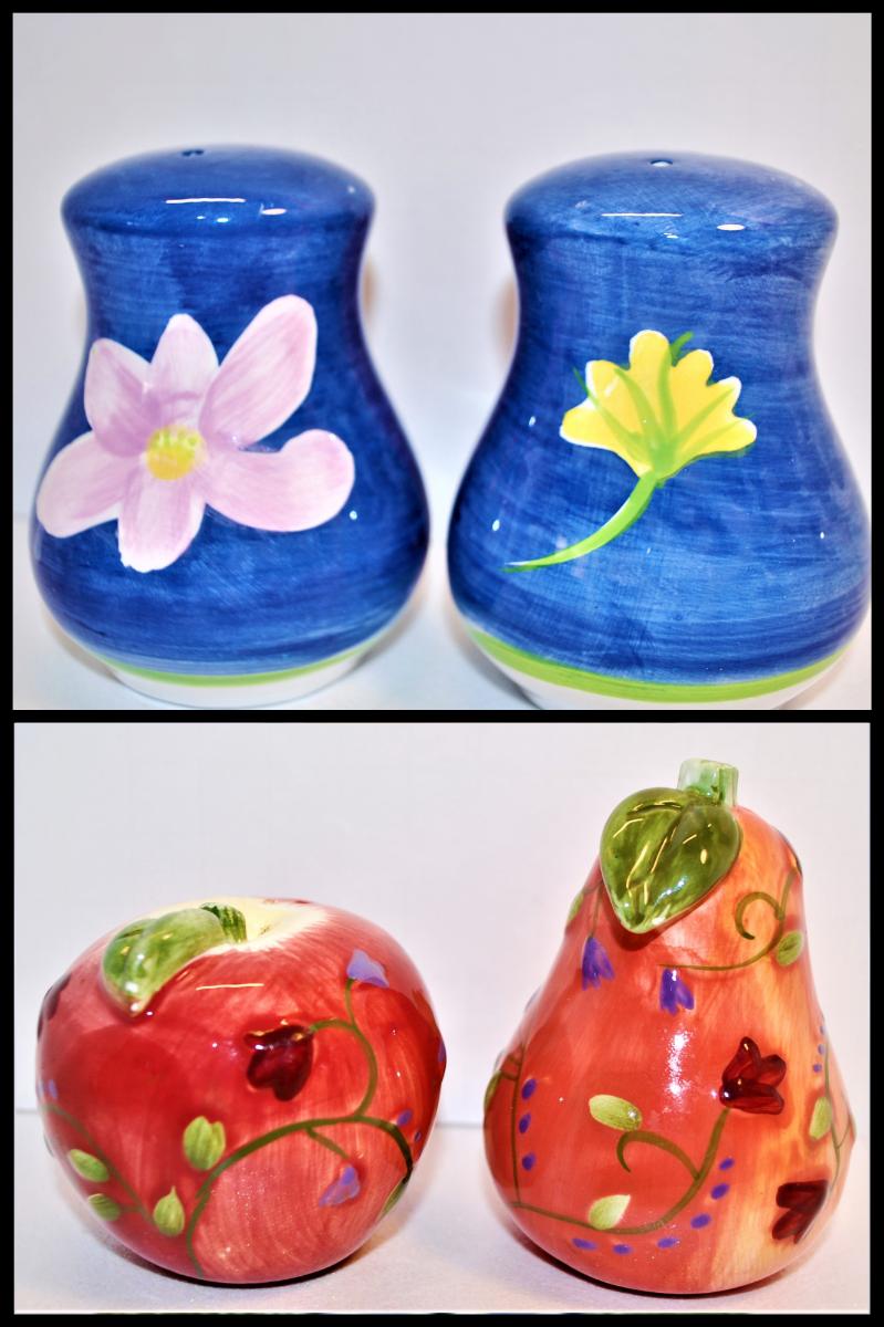 Salt & Pepper Sets - Pear & Apple Set with Vines and Flowers in Reds 3" H & Single Pink/Yellow Flower on Blue Base 3½" H
