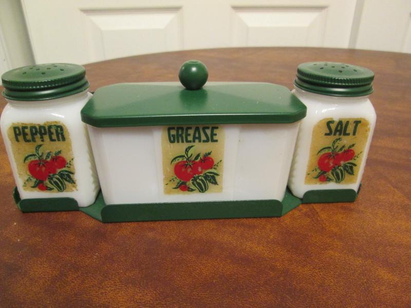 Salt & Pepper Shakers With Grease Jar & Rack - Tomato & Pepper Decals