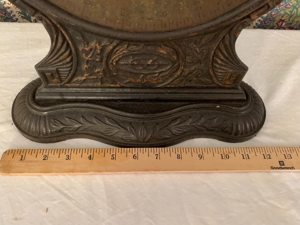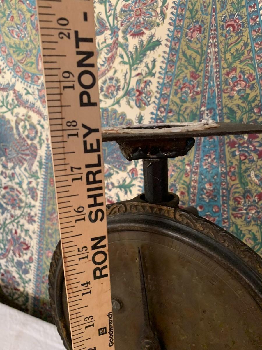 A great piece of home decor as this scale has long been locked up over time. Make a great plant stand. Its pretty heavy. The scale is 18" tall x 15" wide x 9" deep.