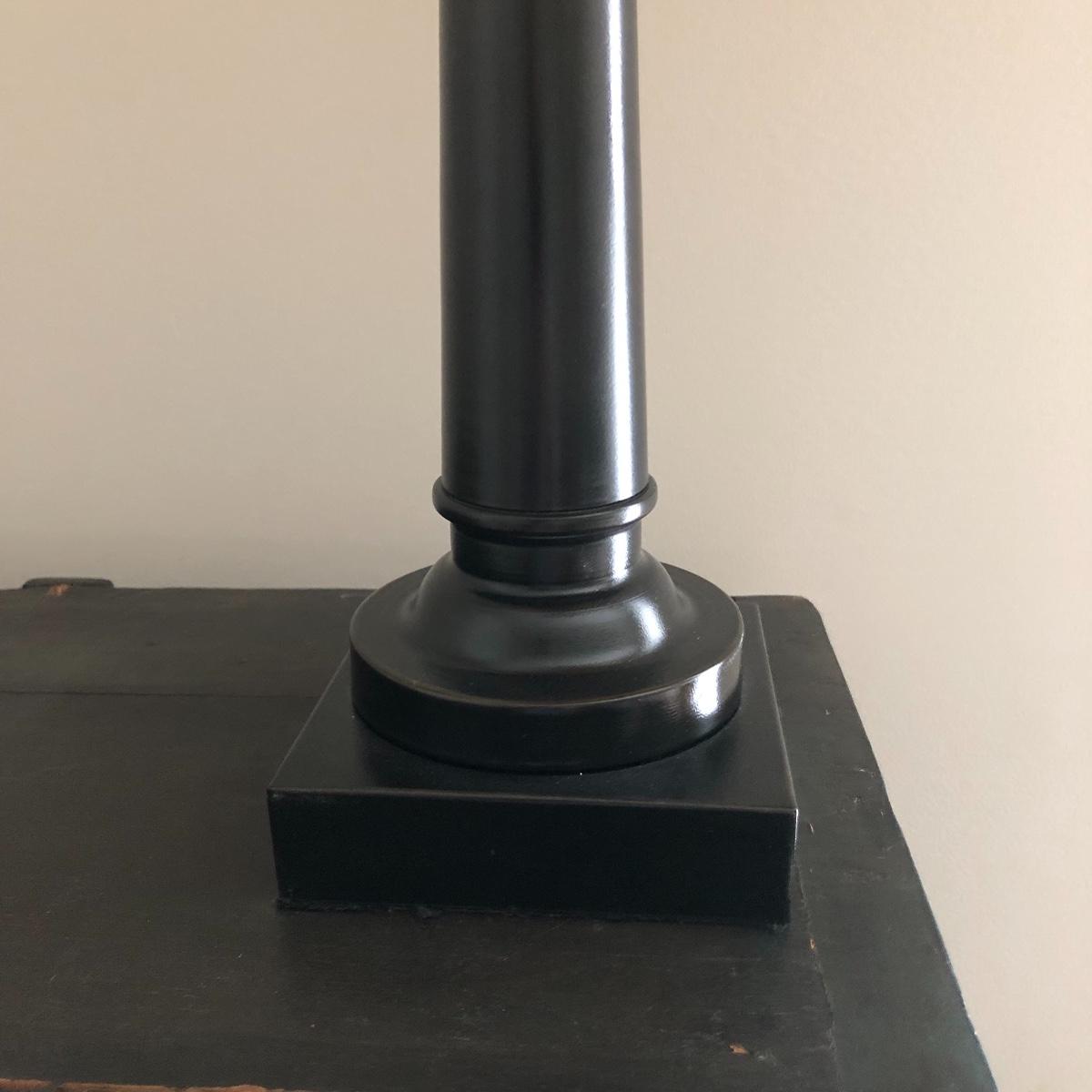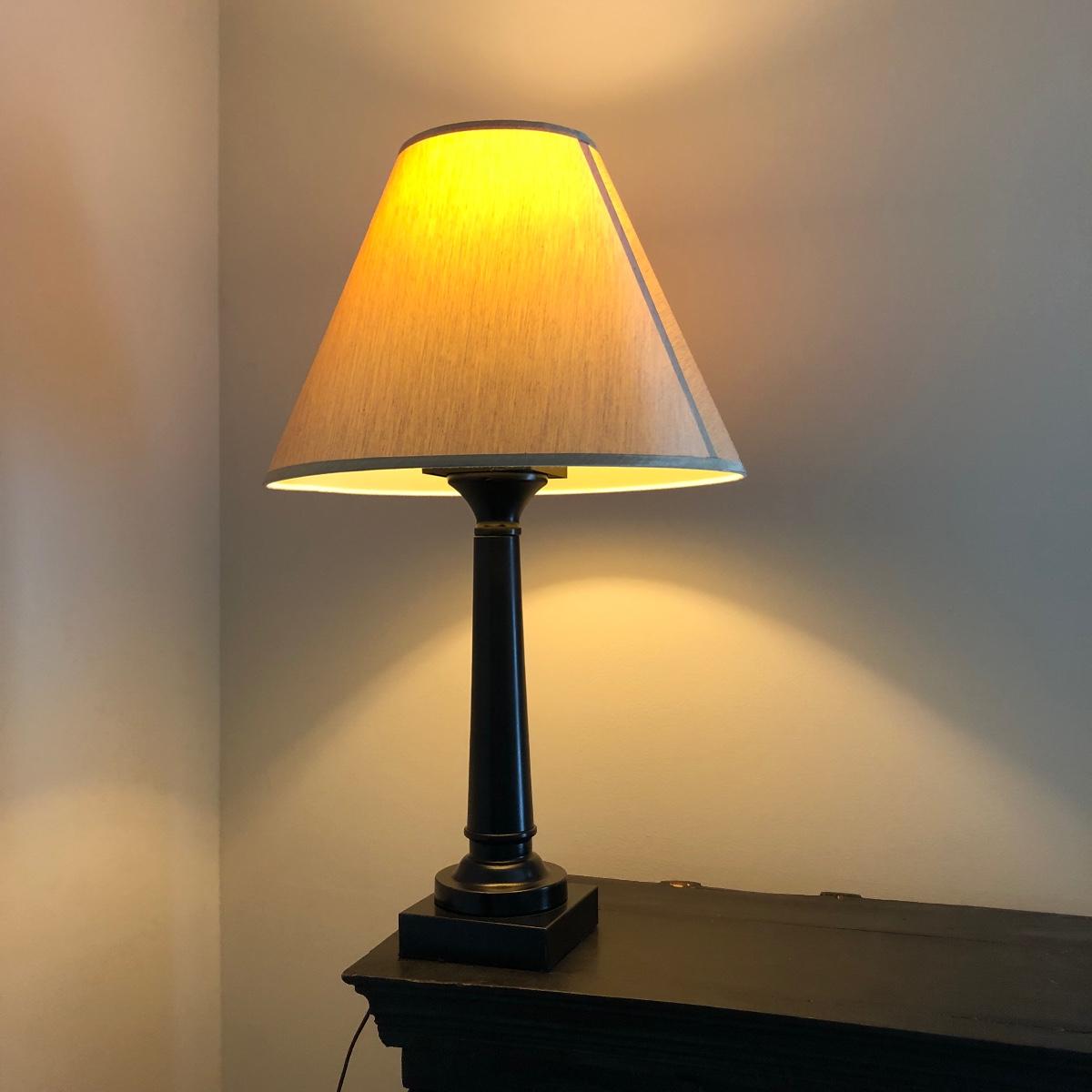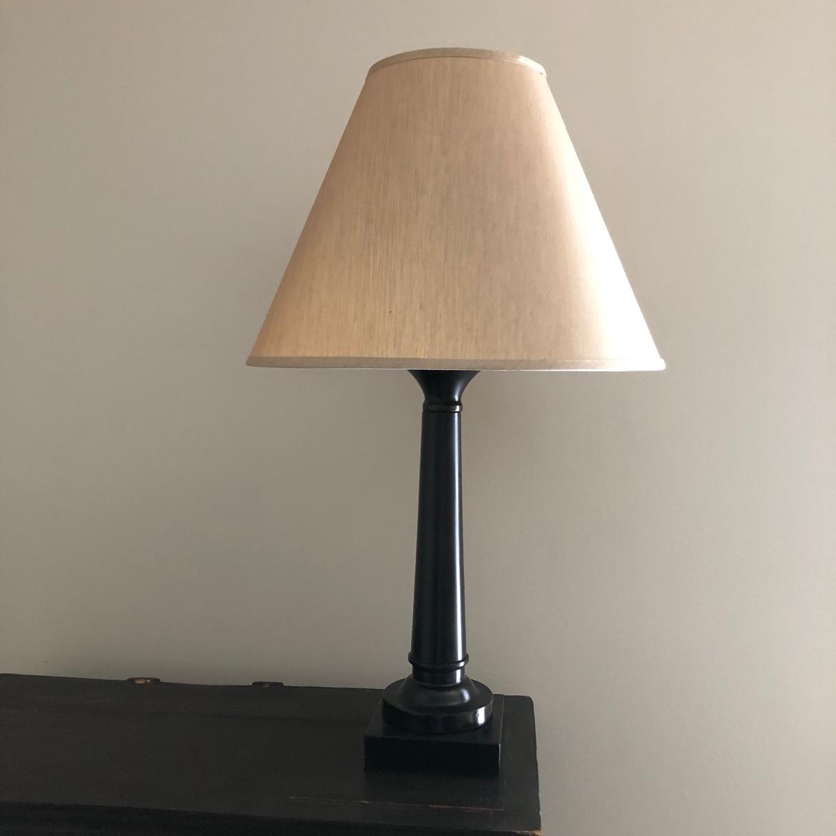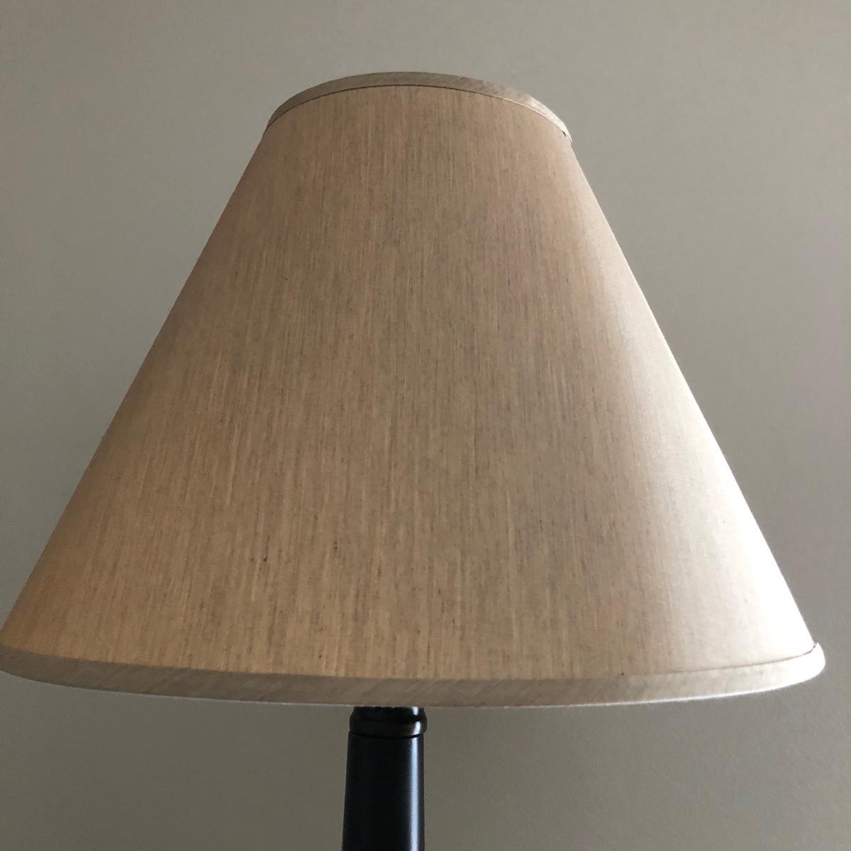 This framed poster from 2008 is from a painting by John Waddill and is housed in a black resin type frame and comes with a sturdy metal stand. The black based 29” lamp appears to be a faux wood with a beige shade. The table in the picture is not included in this lot.