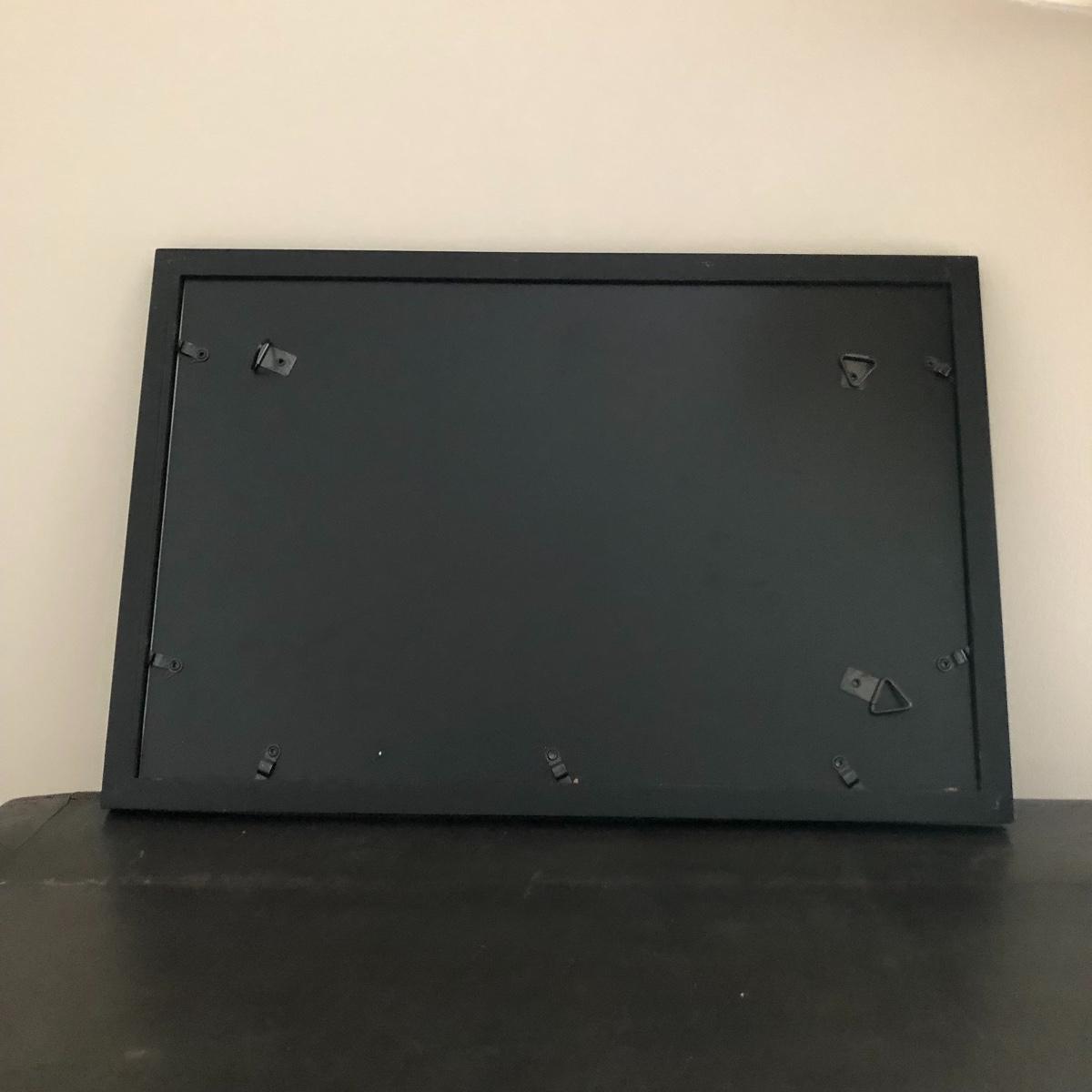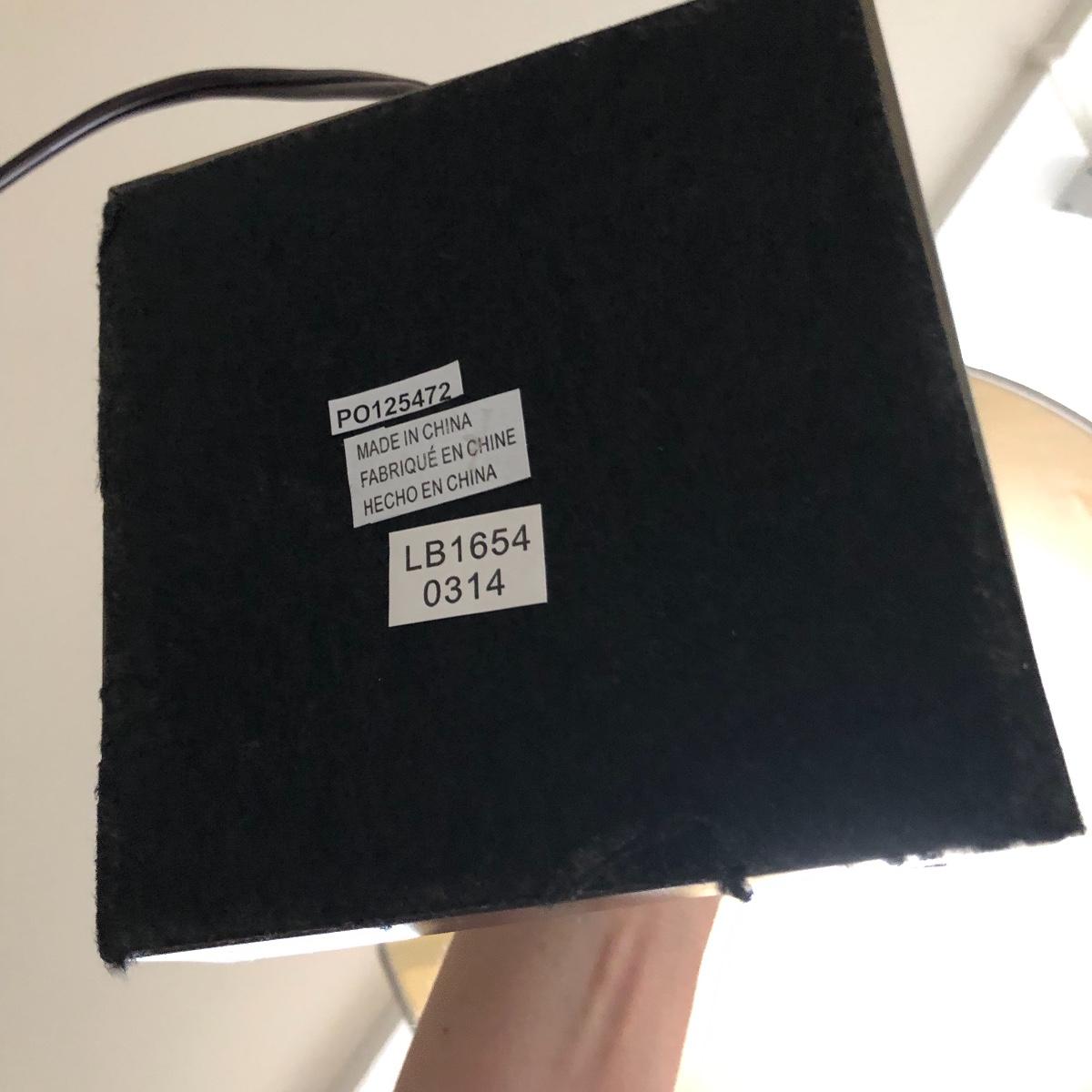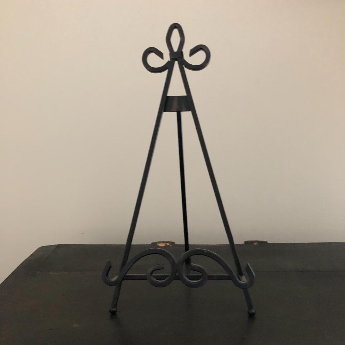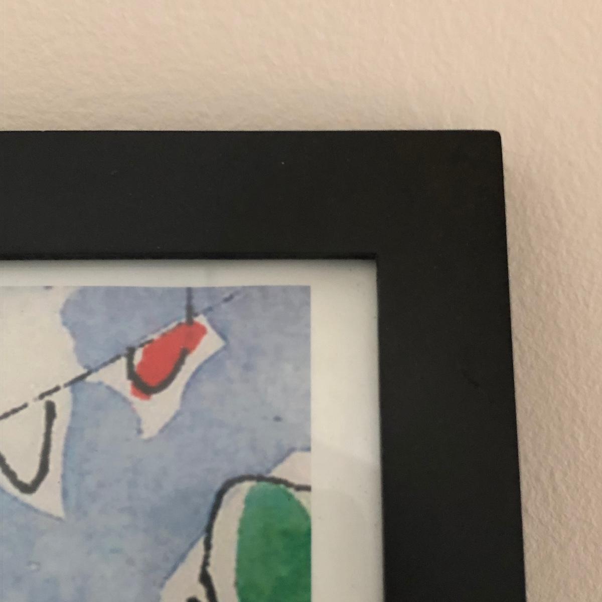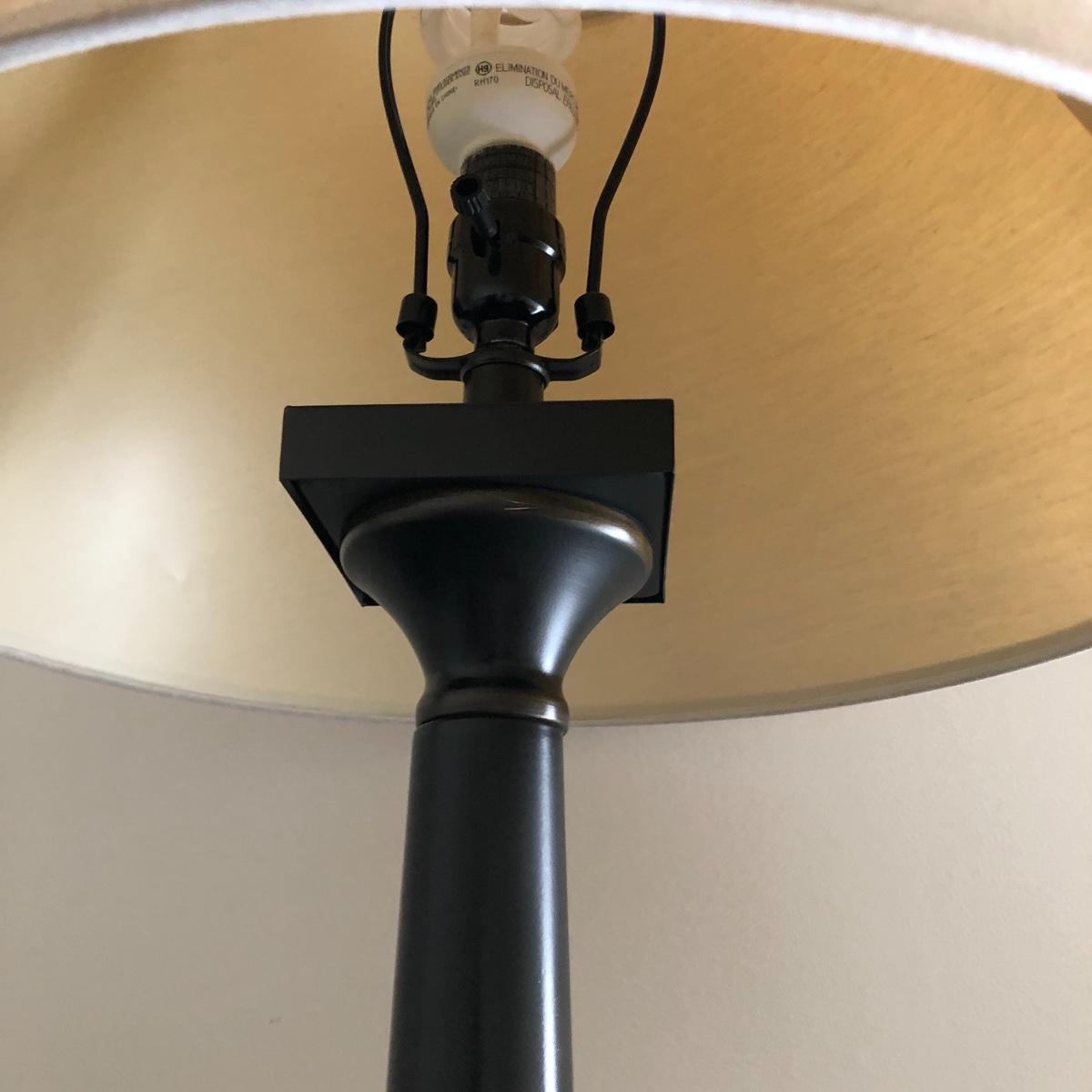 This framed poster from 2008 is from a painting by John Waddill and is housed in a black resin type frame and comes with a sturdy metal stand. The black based 29” lamp appears to be a faux wood with a beige shade. The table in the picture is not included in this lot.