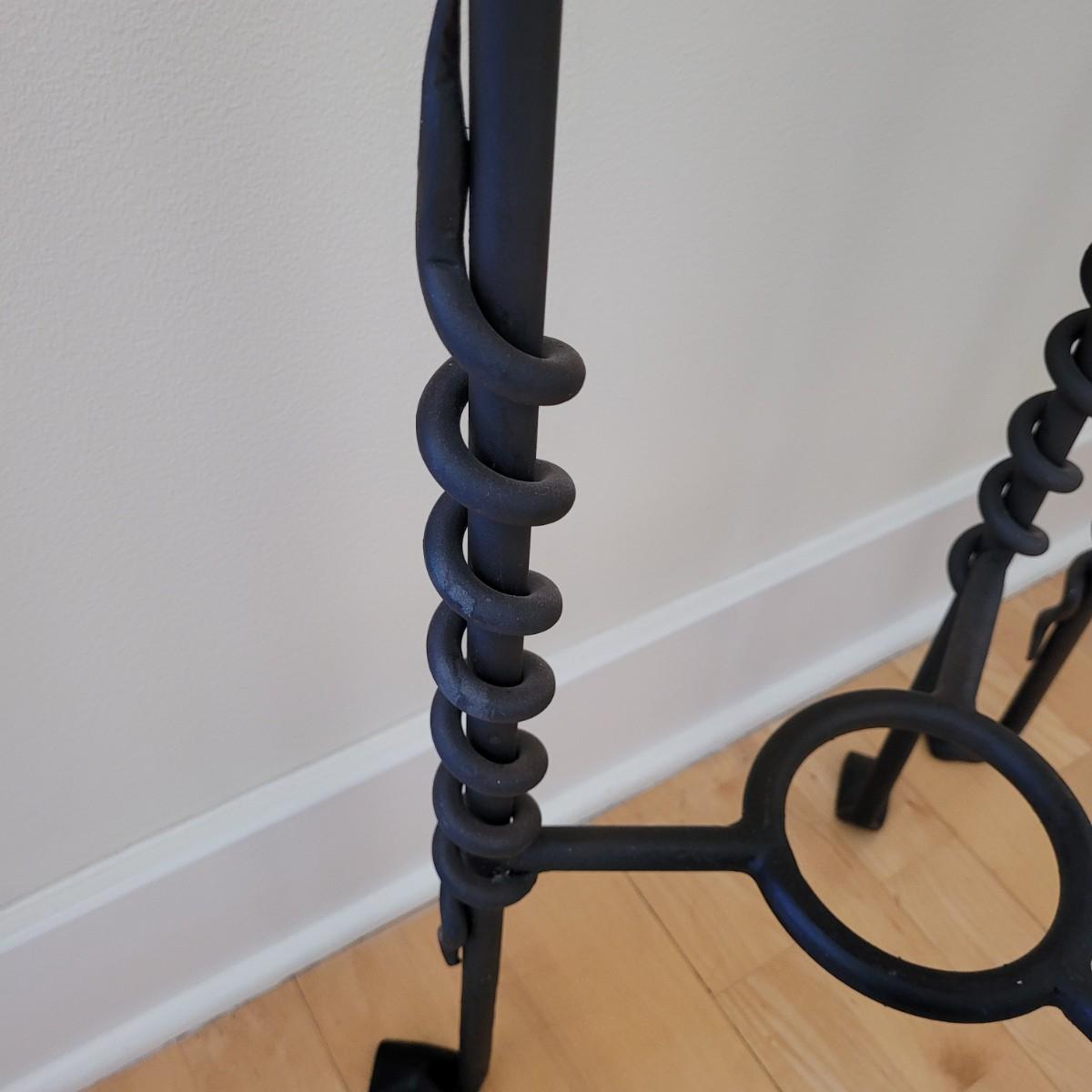 This lot includes two different sized iron side tables with glass tops. The tables match in every aspect except for size. They feature serpent like spirals down three connected legs and boast thick round glass tops. The larger table measures 15" x 15" x 31"H. The smaller is 15" x 15" x 24"H.