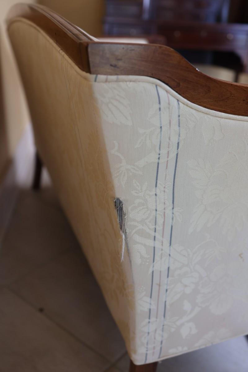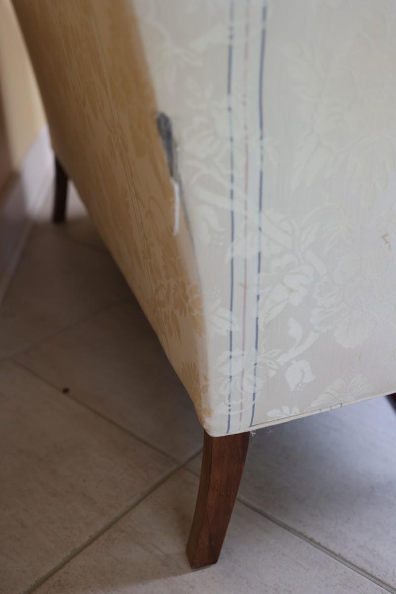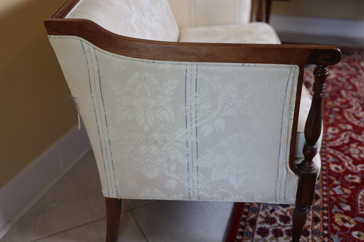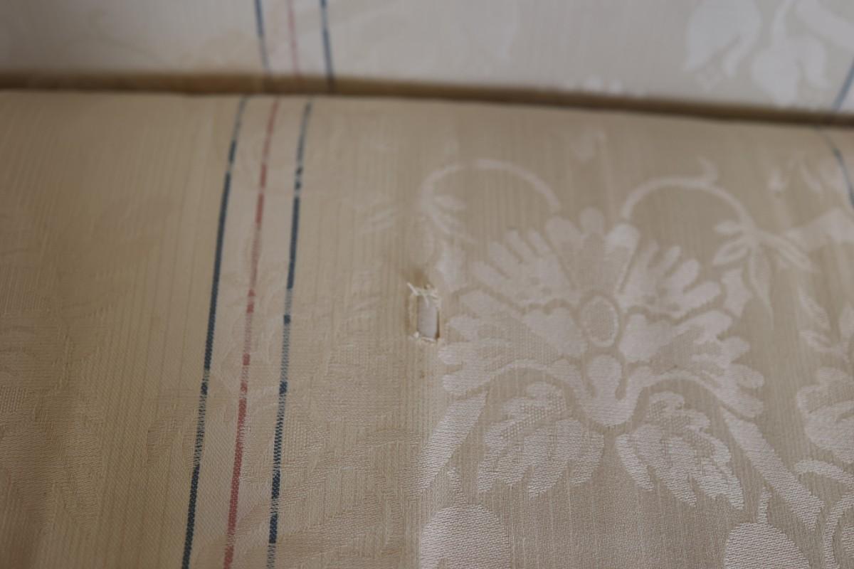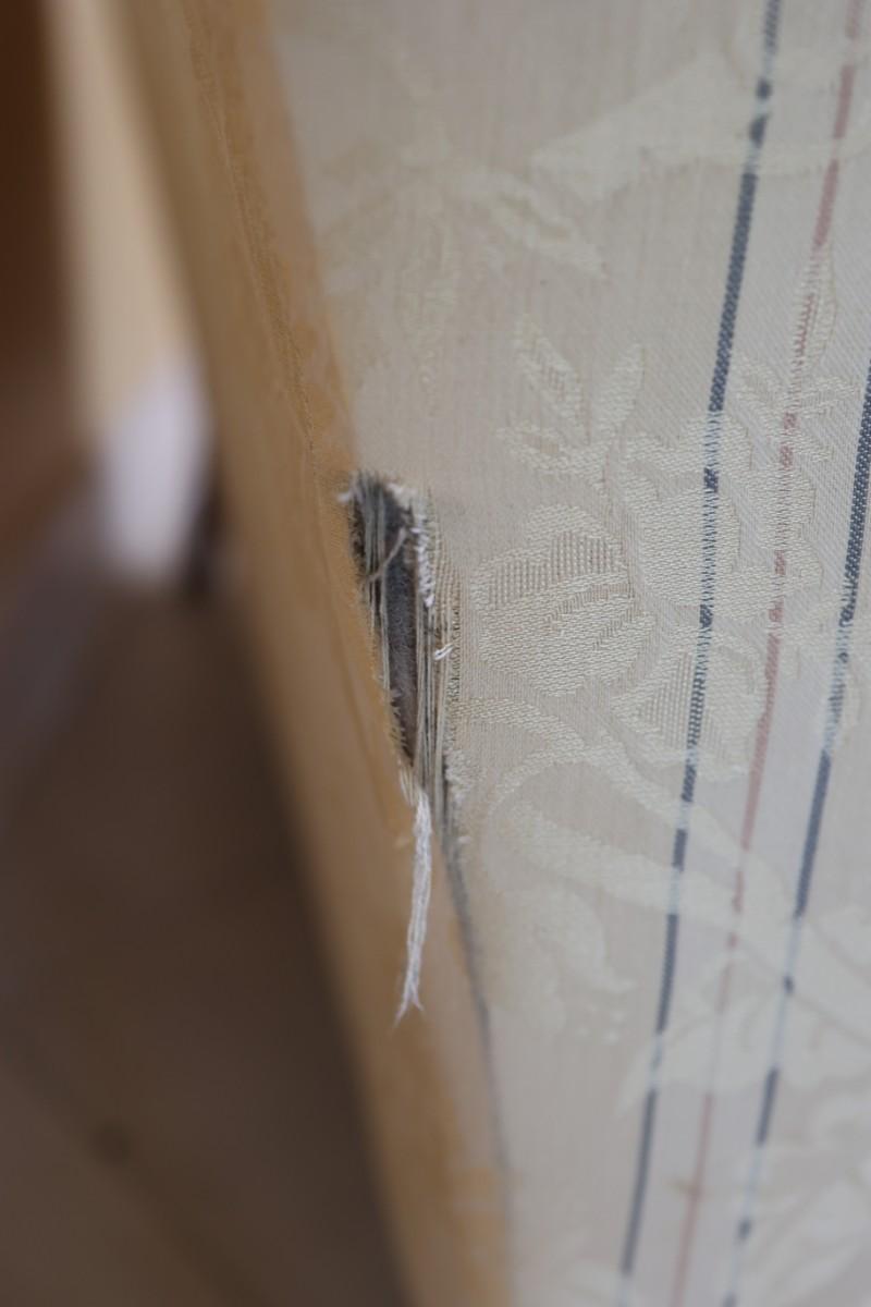 There is a tear on the fabric, see pictures. See pictures of any wear on fabric/wood.