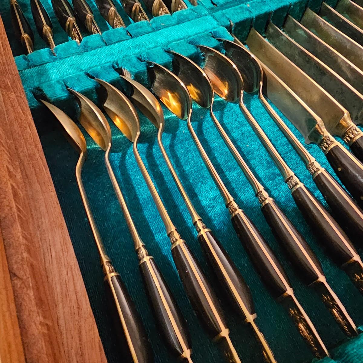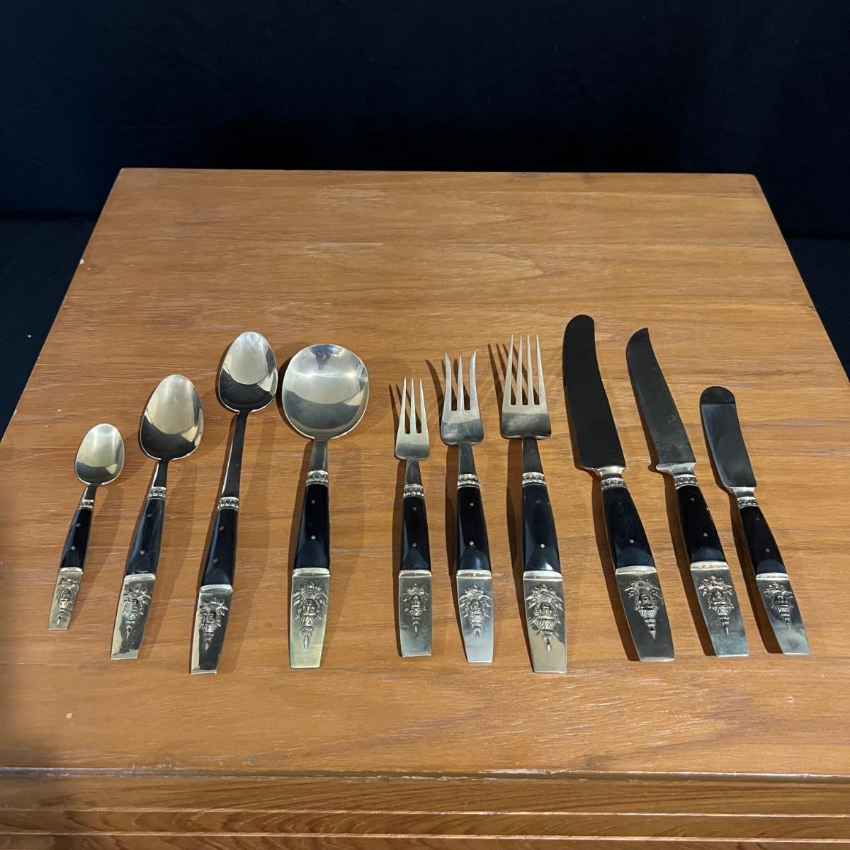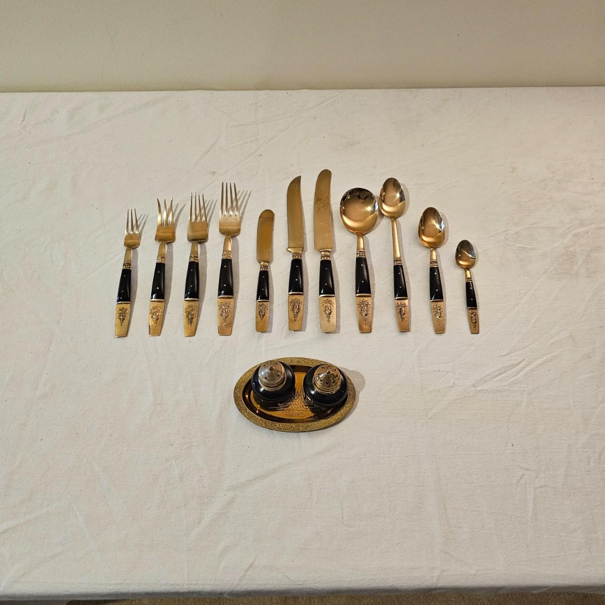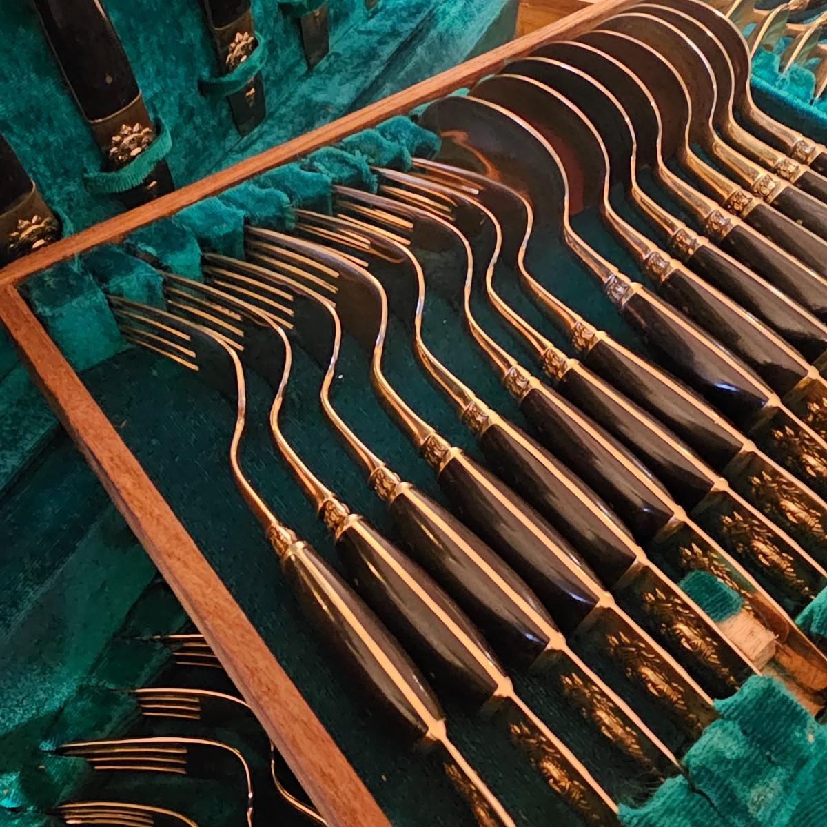 Formal set of service for eight plus serving pieces. Four forks, three knives, four spoons in a place setting. Set comes in its own fitted wood box. Only appears to be missing one serving piece. 105 pieces total. All cutlery are bronze with dark handles. Set also includes 3 salt & pepper pieces and a small tray. Box measures 18" x 17" x 5.5"H. See photos for details. Please note due to lighting items often appear more copper looking, the true color shows best in the image with items on top of box. Shipping available.