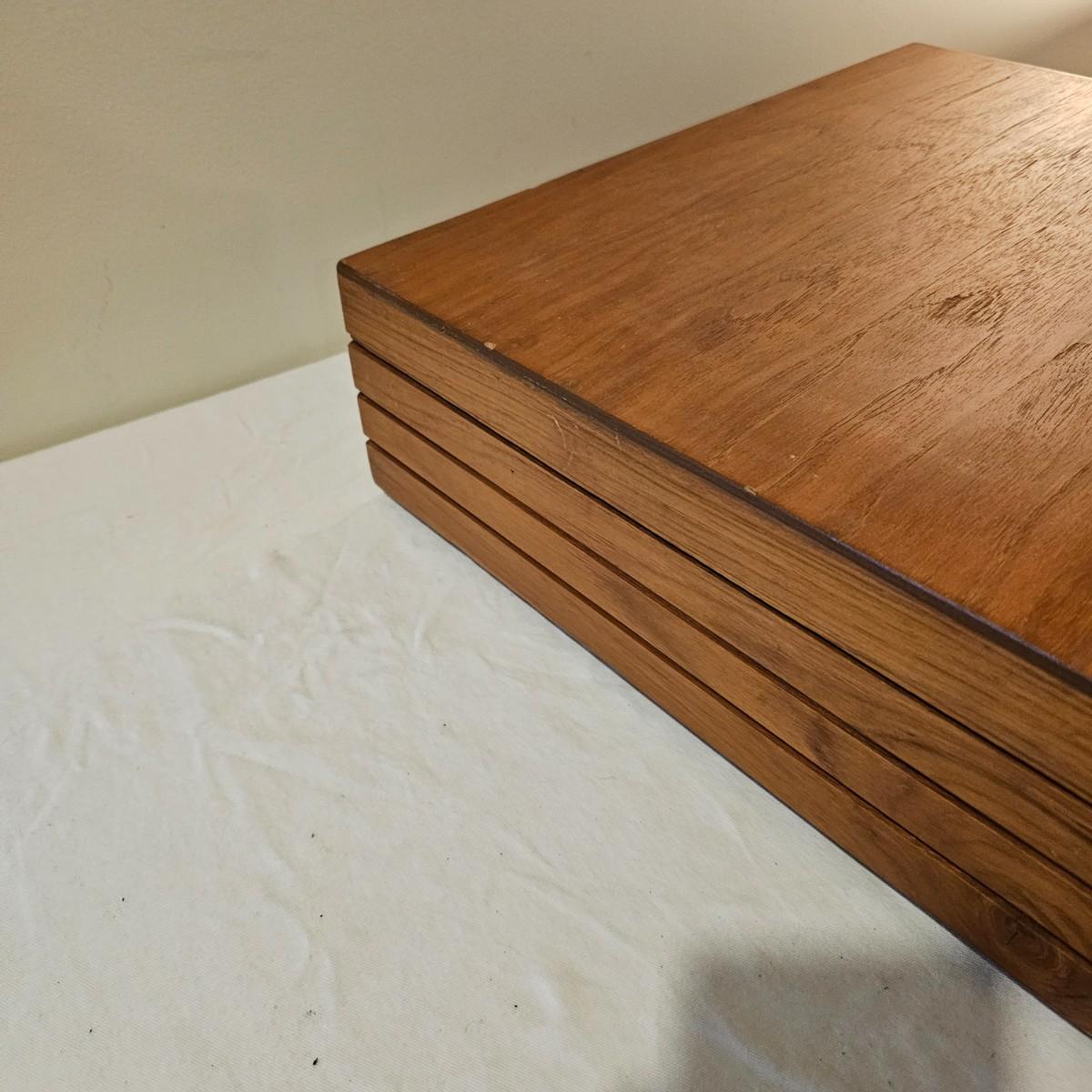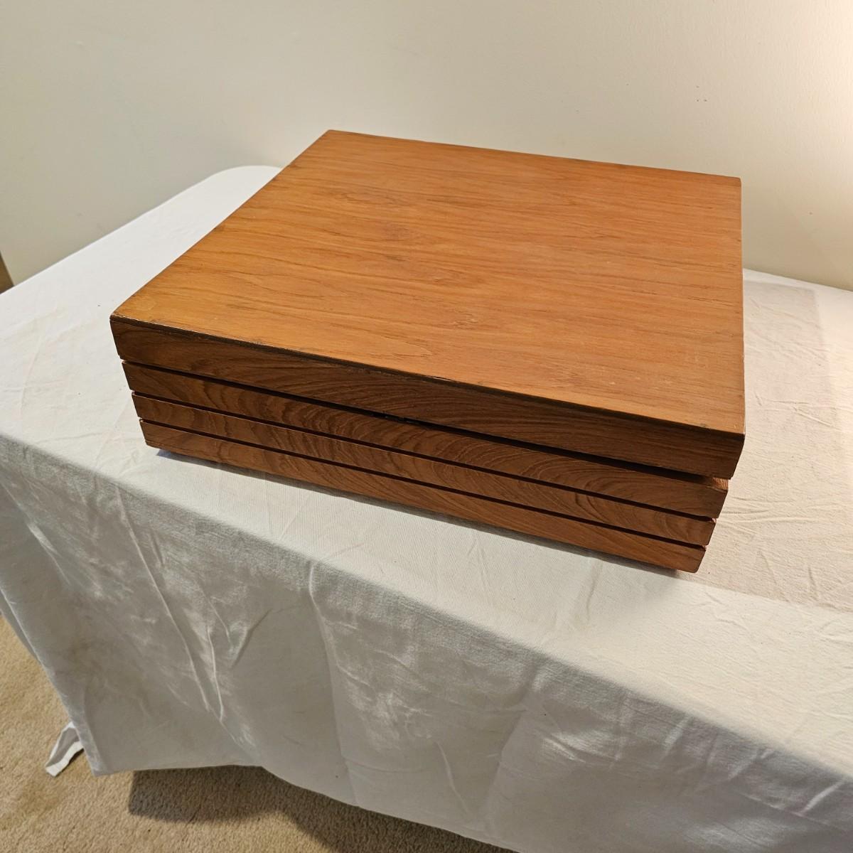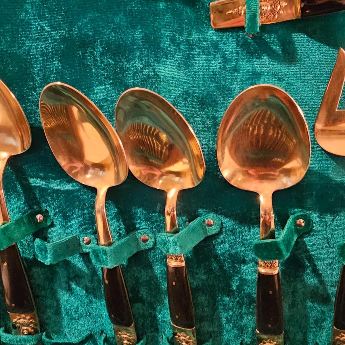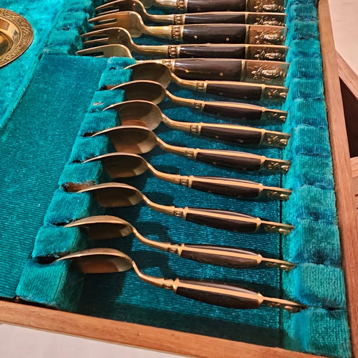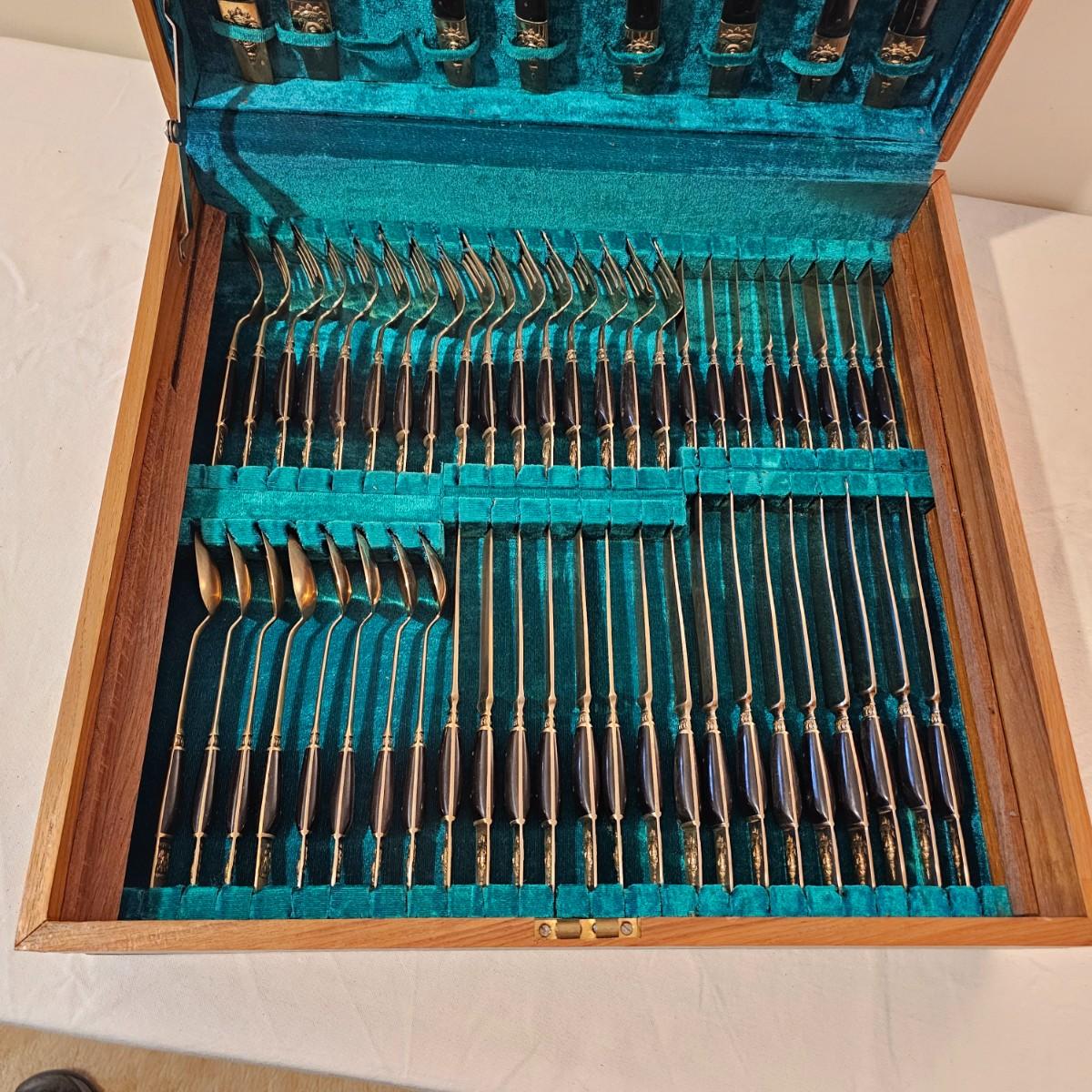 Formal set of service for eight plus serving pieces. Four forks, three knives, four spoons in a place setting. Set comes in its own fitted wood box. Only appears to be missing one serving piece. 105 pieces total. All cutlery are bronze with dark handles. Set also includes 3 salt & pepper pieces and a small tray. Box measures 18" x 17" x 5.5"H. See photos for details. Please note due to lighting items often appear more copper looking, the true color shows best in the image with items on top of box. Shipping available.
