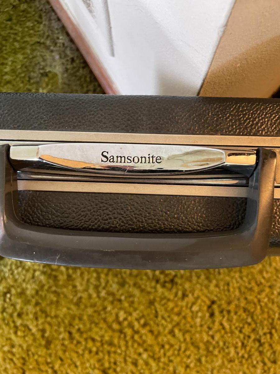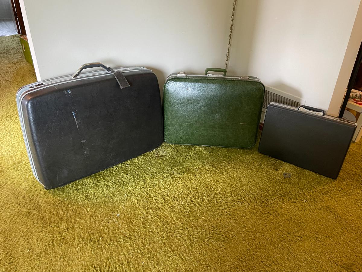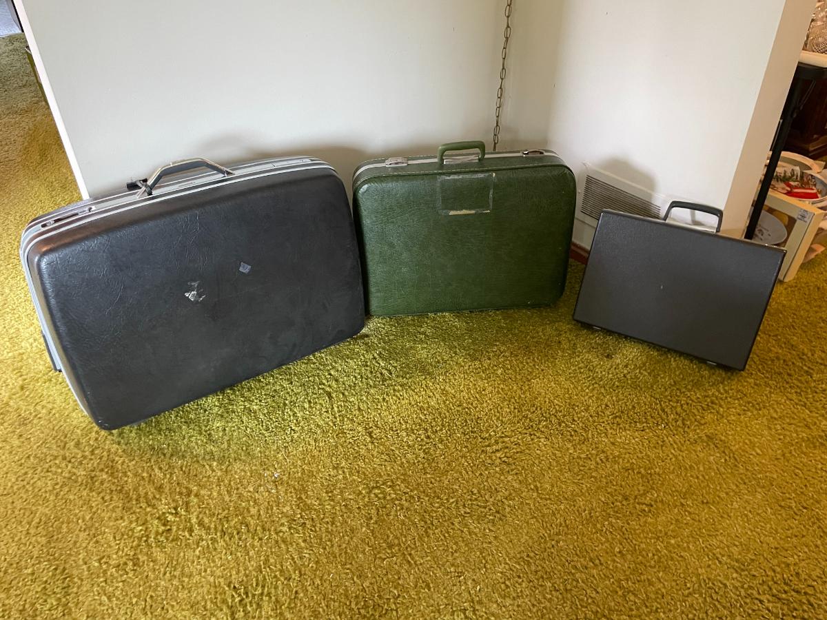 Three hard-shell suitcases including a Samsonite piece and two unbranded suitcases. The Samsonite case features black textured exterior and branding on the latch hardware. The second case is green with a light interior, and the third is a darker, smaller hard case. Conditions show wear consistent with age and use, including scratches and scuffs. Functional latches and handles on all items.