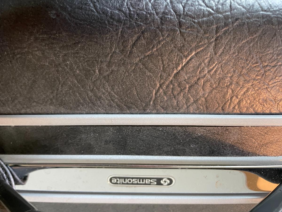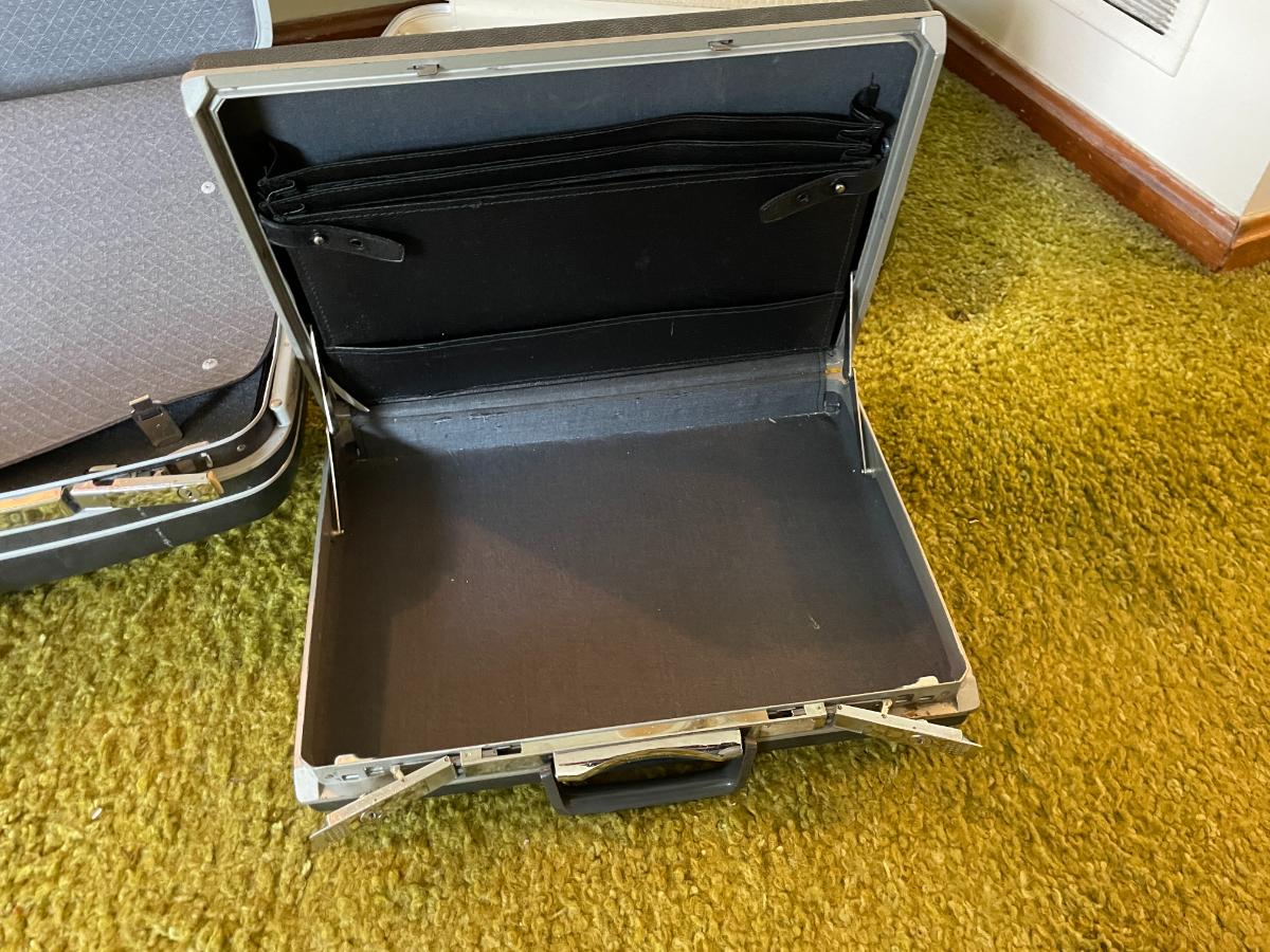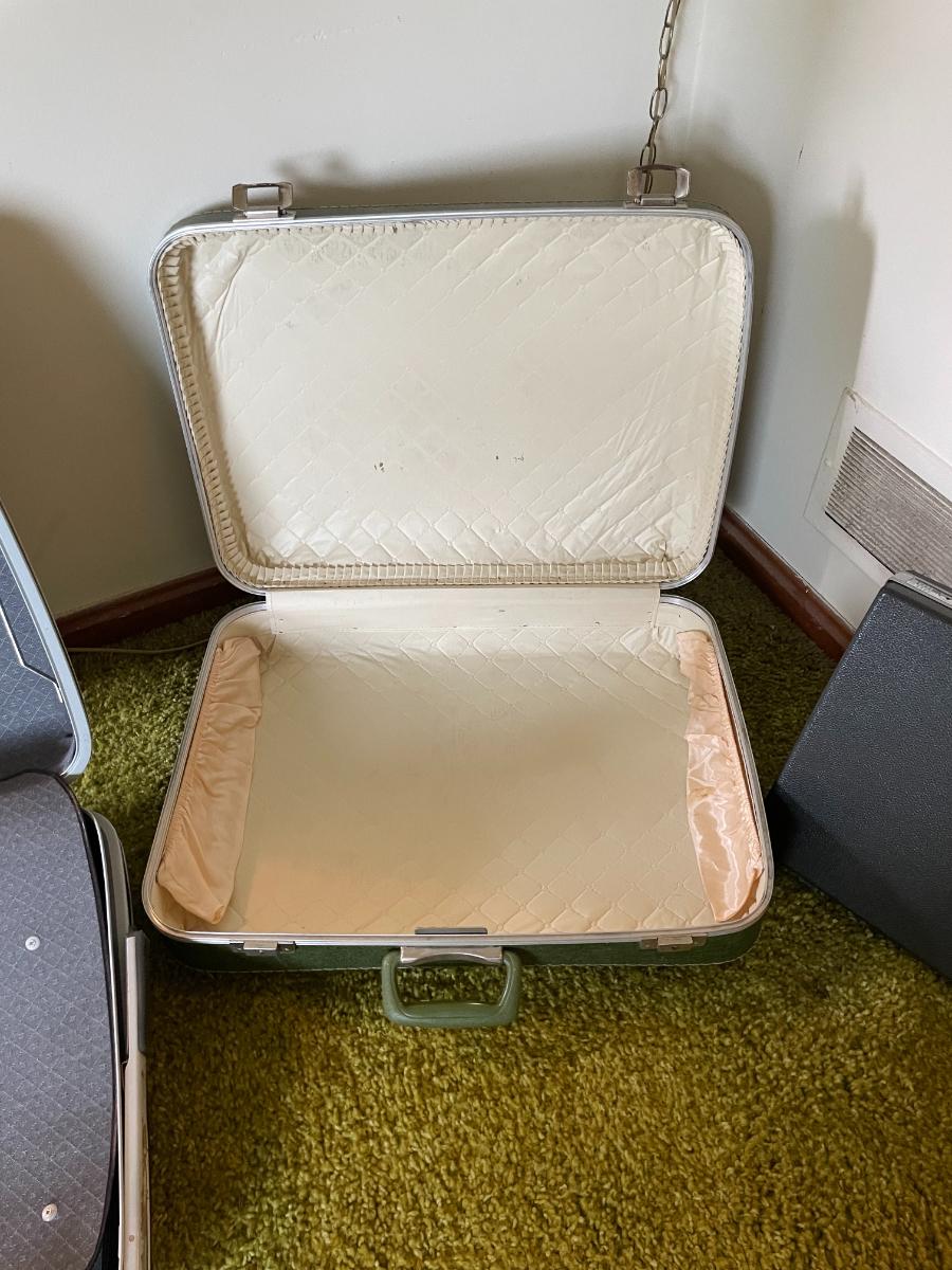 Three hard-shell suitcases including a Samsonite piece and two unbranded suitcases. The Samsonite case features black textured exterior and branding on the latch hardware. The second case is green with a light interior, and the third is a darker, smaller hard case. Conditions show wear consistent with age and use, including scratches and scuffs. Functional latches and handles on all items.