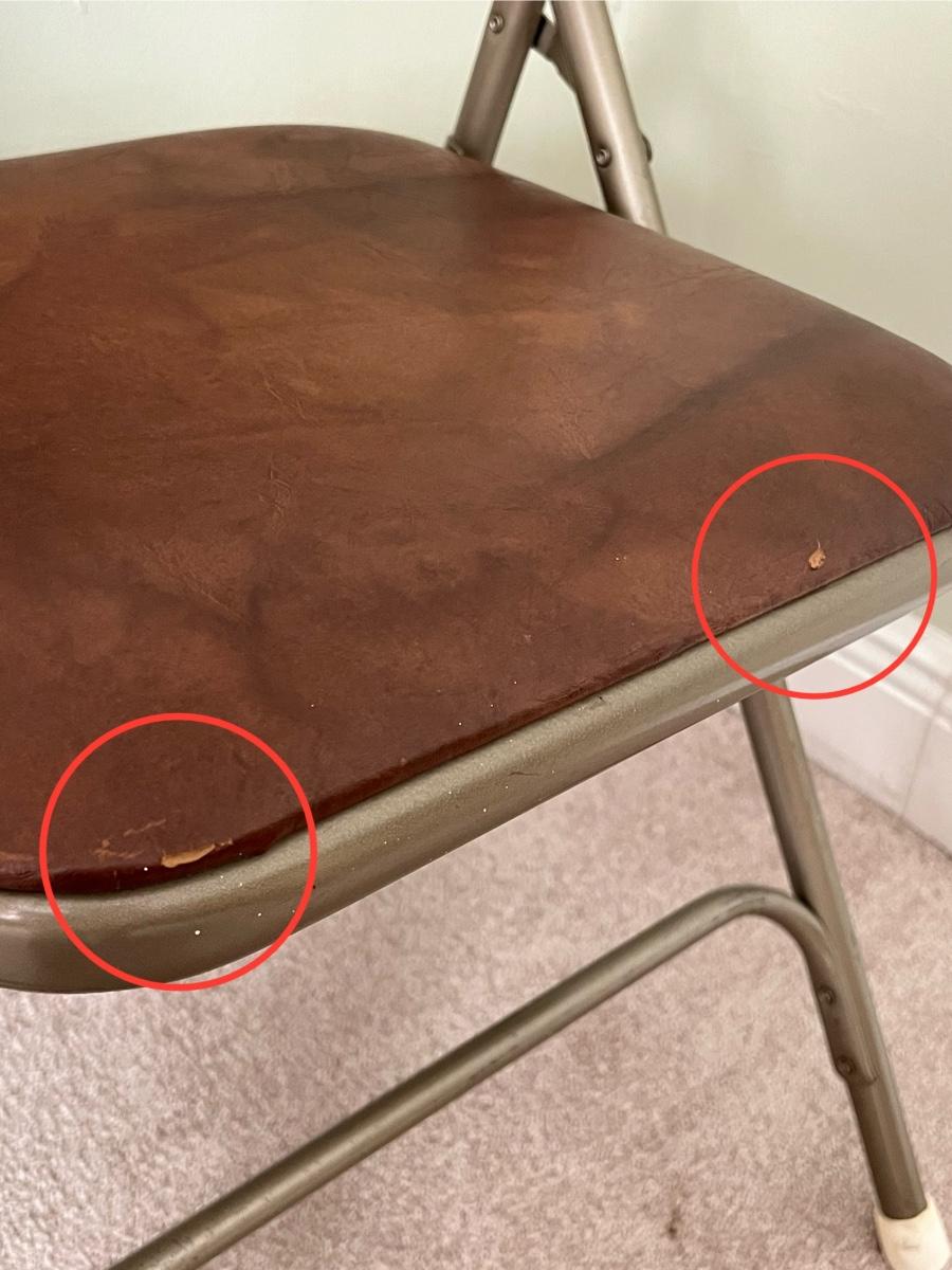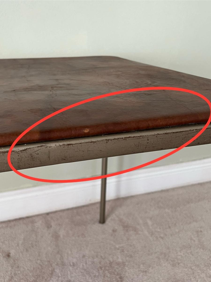 Chairs and table have minor wear from age & use, Chairs have a couple of minor tears in seat, see photos for condition ~ No major damage ~ Table = 27” H x 31” Square ~ Chairs = 30” H x 18” W x 21” D